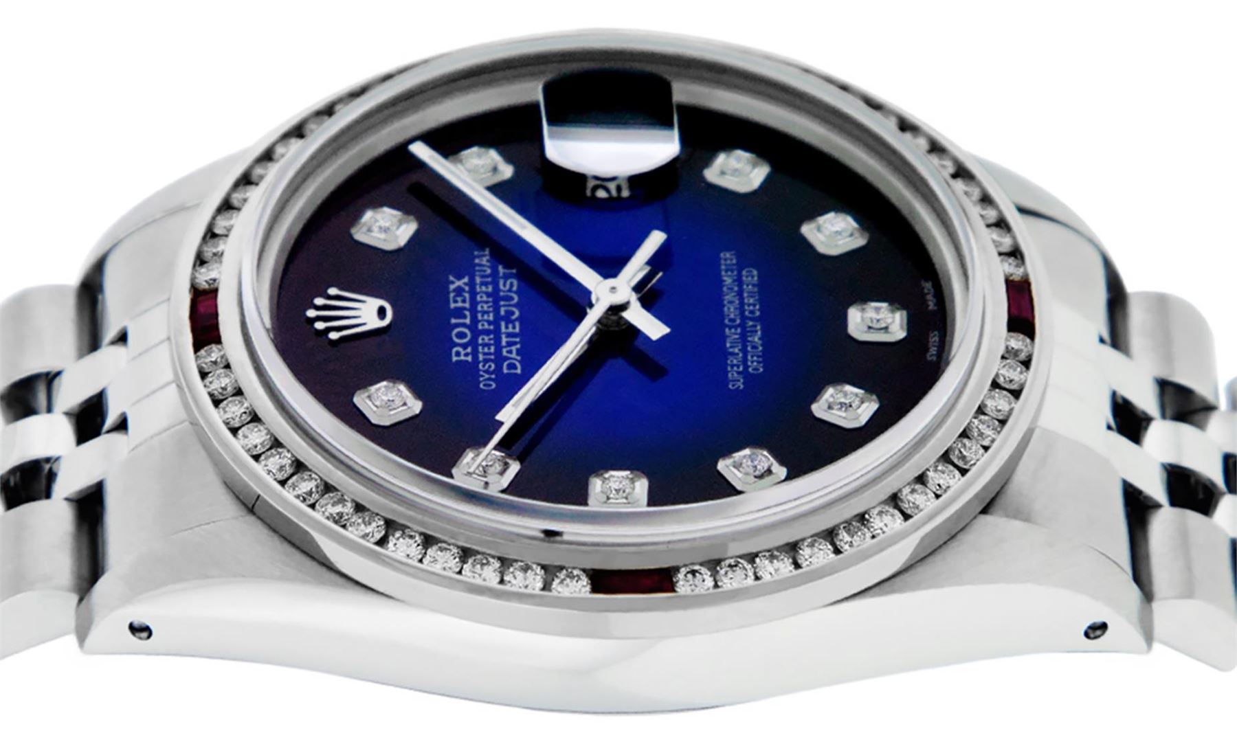 One Mens Pre Owned Stainless Steel Rolex Datejust Polished Bright with Satin Finish, Rolex Stainless Steel Case: 36mm, Rolex Stainless Steel Crown, Custom Bezel: New 18K White Gold Ruby Channel Set Diamond Bezel, Diamond + Gem Count: 52 Diamonds + 4 Rubies. Custom Crystal: New Sapphire With Magnified Date. Custom Hands: New Luminescent Hands. Rolex Movement: Automatic Winding Movement 3035. Custom Dial: Custom Blue Vignette Dial With Added Diamonds, Diamond Count: 10 Diamonds On Dial. Date Window: 3 O'Clock Position Date Display, Quickset, Model: Datejust, Condition: G-6 Extra Fine. Rolex Bracelet: Stainless Steel Jubilee Band. Bracelet: 7.0 Inch Length, Adjustable. Standard Clasp, With Rolex Logo. This Watch Has Been Serviced Time Tested And Is In Excellent Condition It Is Free Of All Scratches And Dents.