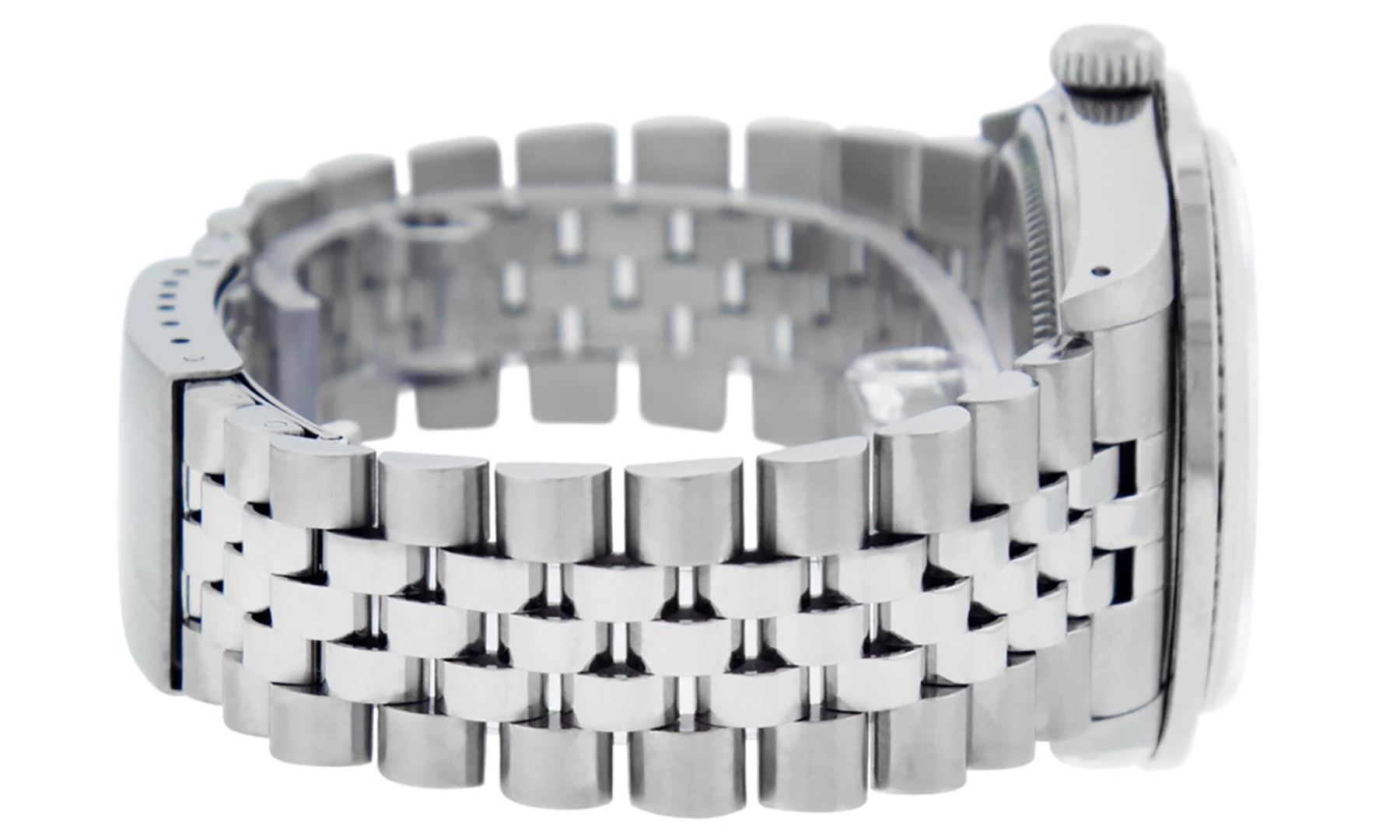 One Mens Pre Owned Stainless Steel Rolex Datejust Polished Bright with Satin Finish, Rolex Stainless Steel Case: 36mm, Rolex Stainless Steel Crown, Custom Bezel: New 18K White Gold Ruby Channel Set Diamond Bezel, Diamond + Gem Count: 52 Diamonds + 4 Rubies. Custom Crystal: New Sapphire With Magnified Date. Custom Hands: New Luminescent Hands. Rolex Movement: Automatic Winding Movement 3035. Custom Dial: Custom Blue Vignette Dial With Added Diamonds, Diamond Count: 10 Diamonds On Dial. Date Window: 3 O'Clock Position Date Display, Quickset, Model: Datejust, Condition: G-6 Extra Fine. Rolex Bracelet: Stainless Steel Jubilee Band. Bracelet: 7.0 Inch Length, Adjustable. Standard Clasp, With Rolex Logo. This Watch Has Been Serviced Time Tested And Is In Excellent Condition It Is Free Of All Scratches And Dents.