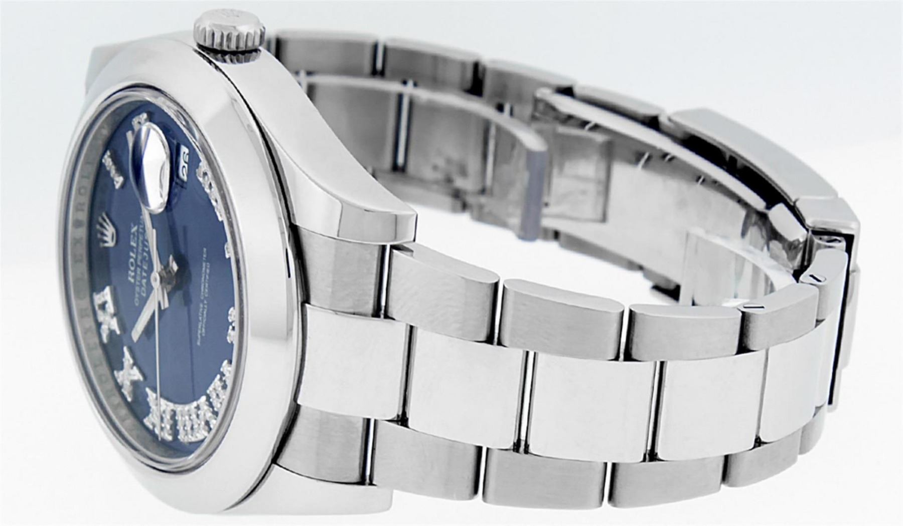 One Mens Rolex Datejust 2 Polished With Shiny Finish, Serviced & Electronically Tested, Stainless Steel Case: 41mm, Stainless Steel Crown, Bezel: Stainless Steel Smooth Bezel, Crystal: Scratch Resistant Synthetic Sapphire Cyclops Lens. Movement: Automatic Winding Movement Caliber 3136. Custom Dial: Blue Roman Diamond Dial, Diamond Color: G To H, Clarity: SI-VS. Date Window: 3 O'Clock Position Date Display, Quickset, Model: Datejust 2. Condition: G-6 Extra Fine The Watch Is In Very Good Condition Free Of All Scratches And Dents. Bracelet: Stainless Steel Oyster Band. Bright Polish & Satin Finish. 7.5 Inch Length, Adjustable. Standard Clasp, With Rolex Logo. This Watch Has Been Serviced Time Tested And Is In Excellent Condition It Is Free Of All Scratches And Dents. This Watch Comes With A Rolex Box.