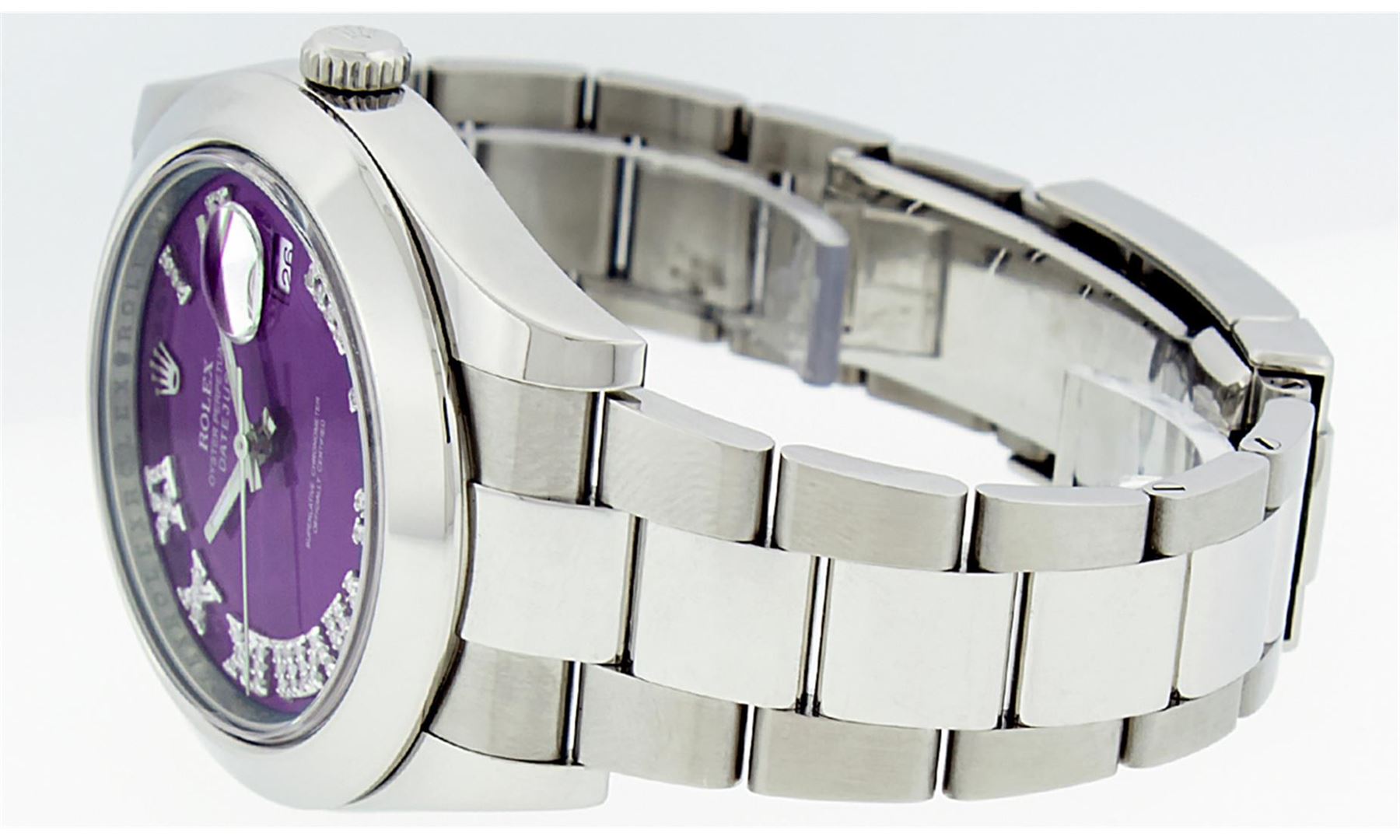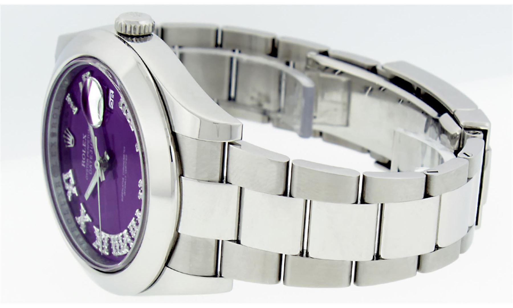 One Mens Rolex Datejust 2 Polished With Shiny Finish, Serviced & Electronically Tested, Stainless Steel Case: 41mm, Stainless Steel Crown, Bezel: Stainless Steel Smooth Bezel, Crystal: Scratch Resistant Synthetic Sapphire Cyclops Lens. Movement: Automatic Winding Movement Caliber 3136. Custom Dial: Purple Roman Diamond Dial, Diamond Color: G To H, Clarity: SI-VS. Date Window: 3 O'Clock Position Date Display, Quickset, Model: Datejust 2. Condition: G-6 Extra Fine The Watch Is In Very Good Condition Free Of All Scratches And Dents. Bracelet: Stainless Steel Oyster Band. Bright Polish & Satin Finish. 7.5 Inch Length, Adjustable. Standard Clasp, With Rolex Logo. This Watch Has Been Serviced Time Tested And Is In Excellent Condition It Is Free Of All Scratches And Dents. This Watch Comes With A Rolex Box.