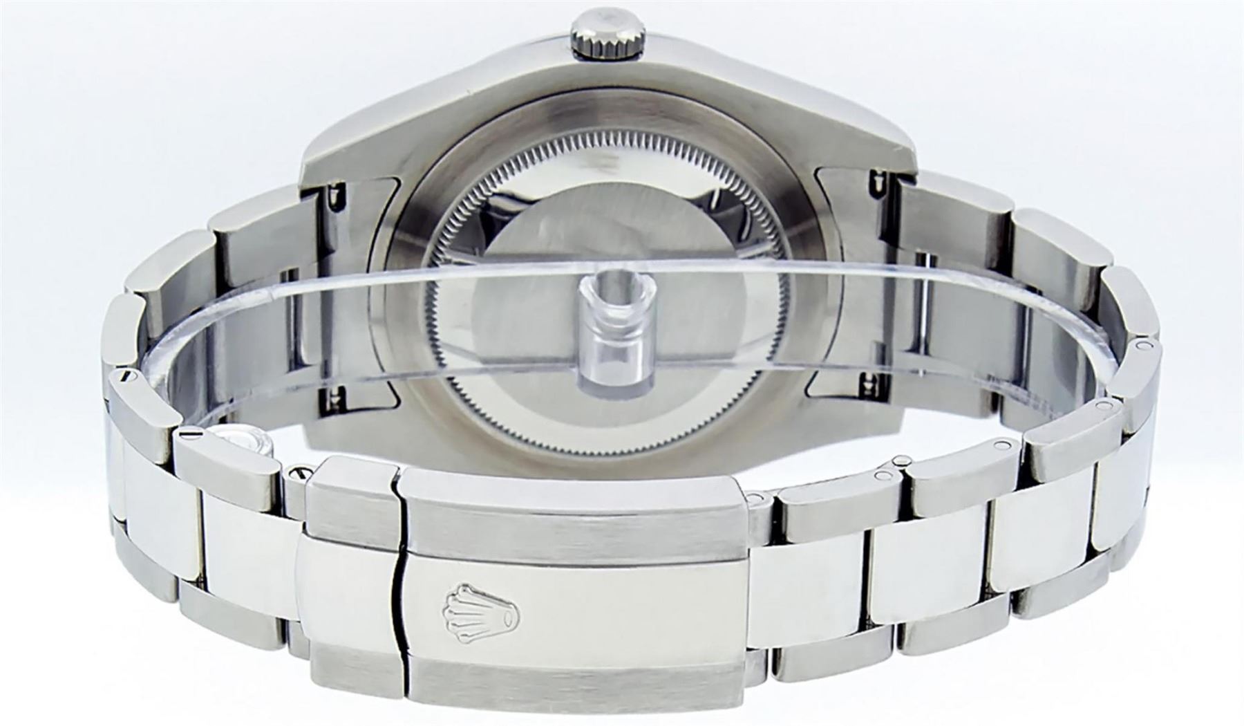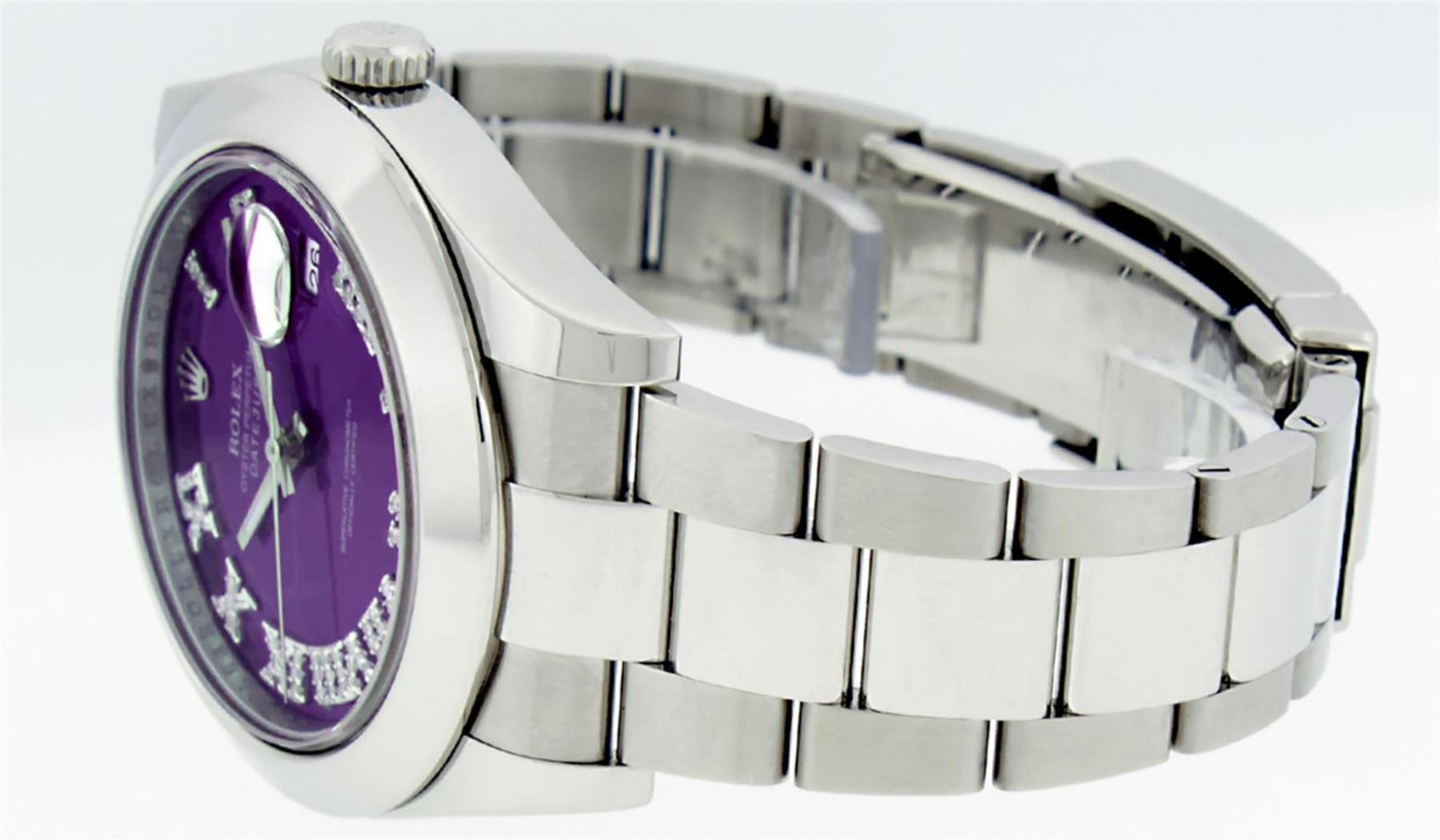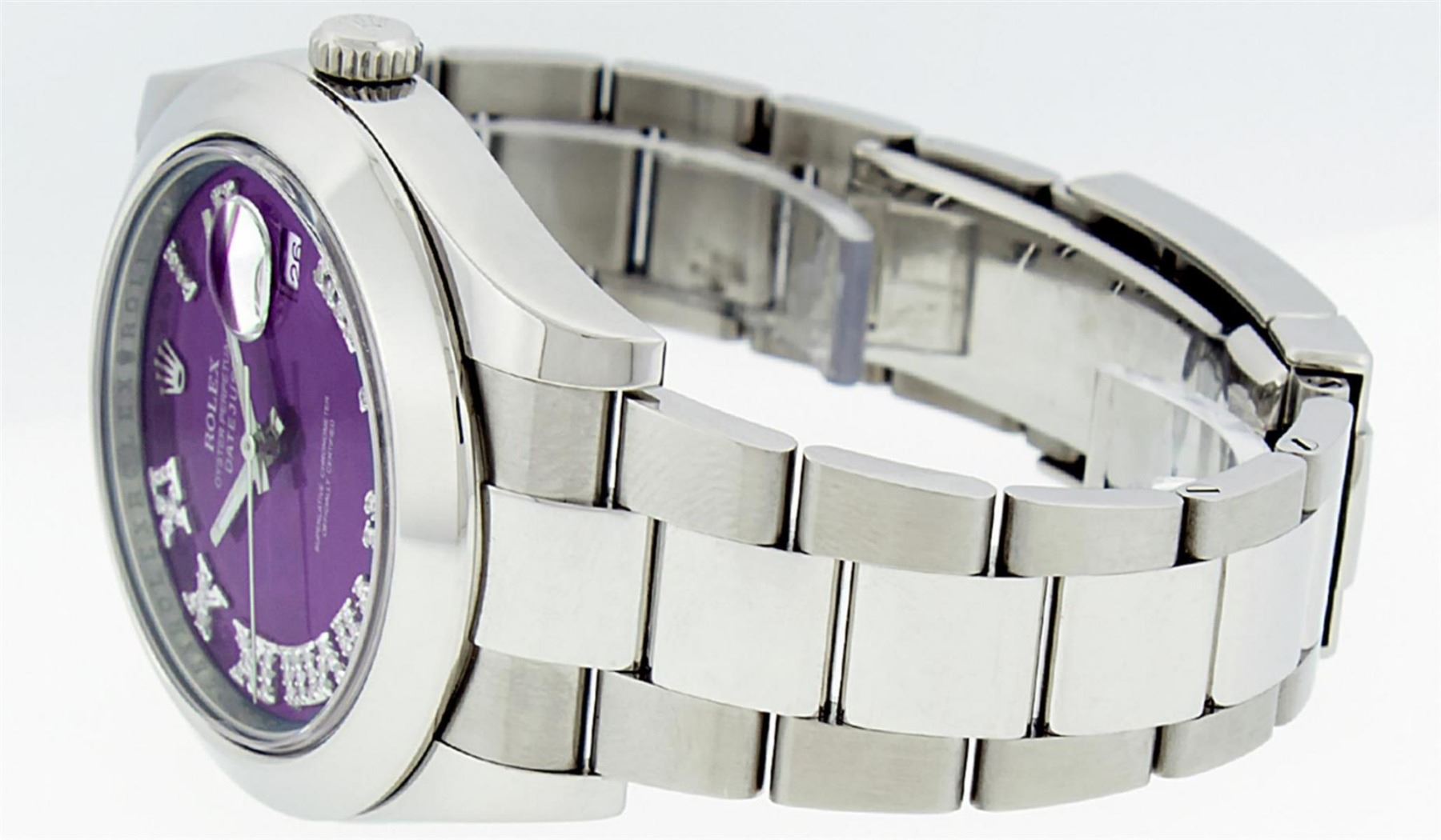 One Mens Rolex Datejust 2 Polished With Shiny Finish, Serviced & Electronically Tested, Stainless Steel Case: 41mm, Stainless Steel Crown, Bezel: Stainless Steel Smooth Bezel, Crystal: Scratch Resistant Synthetic Sapphire Cyclops Lens. Movement: Automatic Winding Movement Caliber 3136. Custom Dial: Purple Roman Diamond Dial, Diamond Color: G To H, Clarity: SI-VS. Date Window: 3 O'Clock Position Date Display, Quickset, Model: Datejust 2. Condition: G-6 Extra Fine The Watch Is In Very Good Condition Free Of All Scratches And Dents. Bracelet: Stainless Steel Oyster Band. Bright Polish & Satin Finish.�7.5 Inch Length, Adjustable. Standard Clasp, With Rolex Logo. This Watch Has Been Serviced Time Tested And Is In Excellent Condition It Is Free Of All Scratches And Dents. This Watch Comes With A Rolex Box.