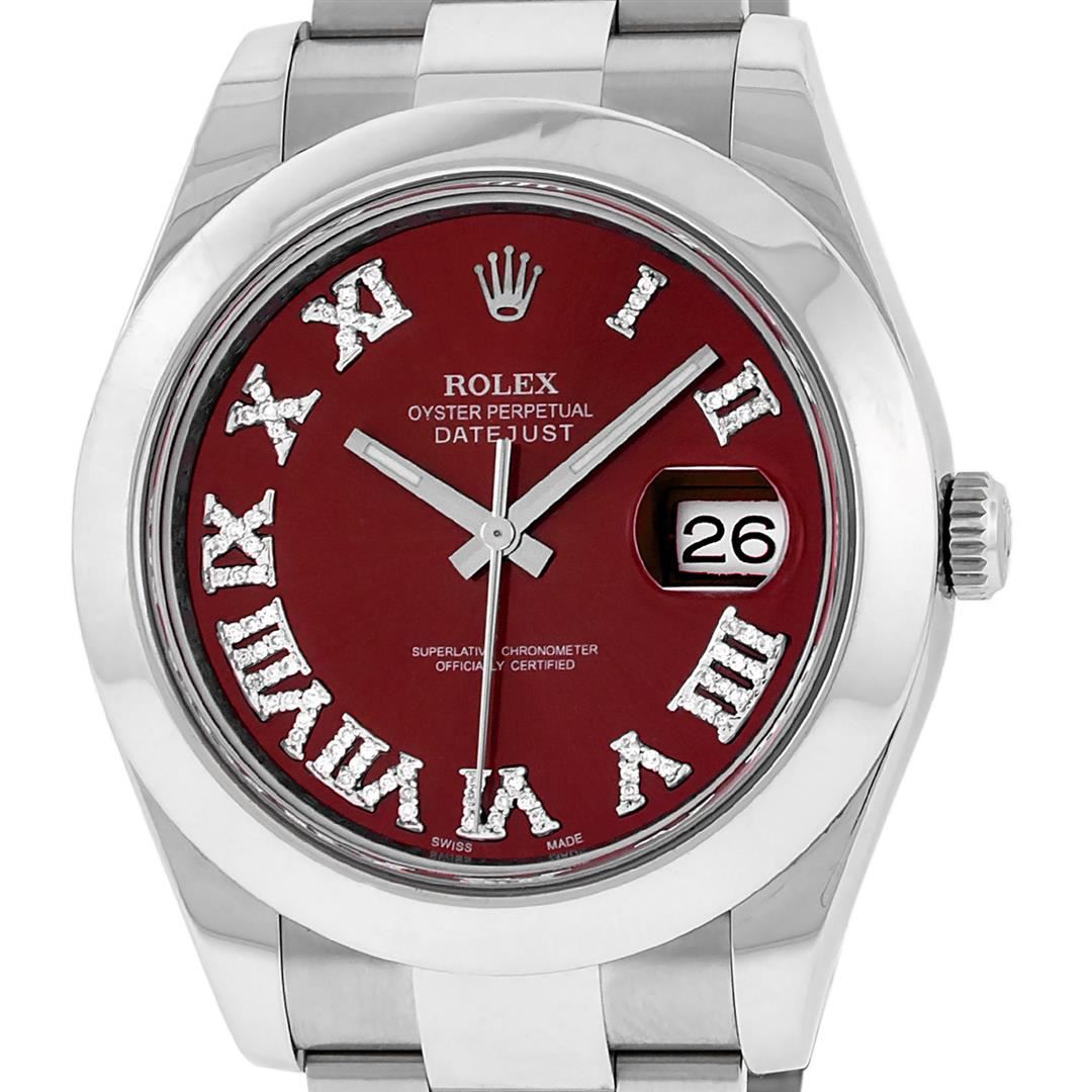 One Mens Rolex Datejust 2 Polished With Shiny Finish, Serviced & Electronically Tested, Stainless Steel Case: 41mm, Stainless Steel Crown, Bezel: Stainless Steel Smooth Bezel, Crystal: Scratch Resistant Synthetic Sapphire Cyclops Lens. Movement: Automatic Winding Movement Caliber 3136. Custom Dial: Red Roman Diamond Dial, Diamond Color: G To H, Clarity: SI-VS. Date Window: 3 O'Clock Position Date Display, Quickset, Model: Datejust 2. Condition: G-6 Extra Fine The Watch Is In Very Good Condition Free Of All Scratches And Dents. Bracelet: Stainless Steel Oyster Band. Bright Polish & Satin Finish.�7.5 Inch Length, Adjustable. Standard Clasp, With Rolex Logo. This Watch Has Been Serviced Time Tested And Is In Excellent Condition It Is Free Of All Scratches And Dents. This Watch Comes With A Rolex Box.