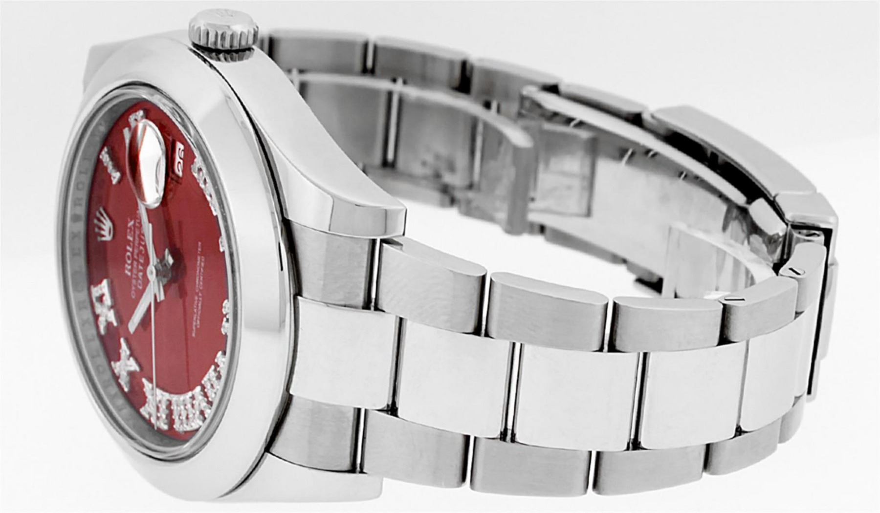 One Mens Rolex Datejust 2 Polished With Shiny Finish, Serviced & Electronically Tested, Stainless Steel Case: 41mm, Stainless Steel Crown, Bezel: Stainless Steel Smooth Bezel, Crystal: Scratch Resistant Synthetic Sapphire Cyclops Lens. Movement: Automatic Winding Movement Caliber 3136. Custom Dial: Red Roman Diamond Dial, Diamond Color: G To H, Clarity: SI-VS. Date Window: 3 O'Clock Position Date Display, Quickset, Model: Datejust 2. Condition: G-6 Extra Fine The Watch Is In Very Good Condition Free Of All Scratches And Dents. Bracelet: Stainless Steel Oyster Band. Bright Polish & Satin Finish. 7.5 Inch Length, Adjustable. Standard Clasp, With Rolex Logo. This Watch Has Been Serviced Time Tested And Is In Excellent Condition It Is Free Of All Scratches And Dents. This Watch Comes With A Rolex Box.