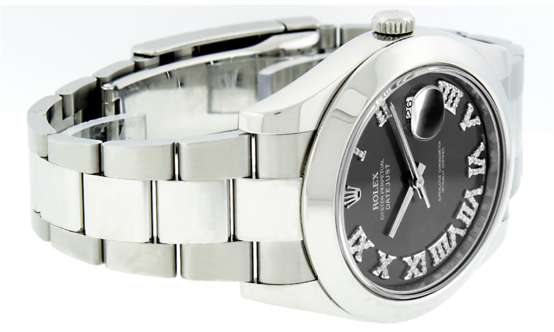 One Mens Rolex Datejust 2 Polished With Shiny Finish, Serviced & Electronically Tested, Stainless Steel Case: 41mm, Stainless Steel Crown, Bezel: Stainless Steel Smooth Bezel, Crystal: Scratch Resistant Synthetic Sapphire Cyclops Lens. Movement: Automatic Winding Movement Caliber 3136. Custom Dial: Slate Roman Diamond Dial, Diamond Color: G To H, Clarity: SI-VS. Date Window: 3 O'Clock Position Date Display, Quickset, Model: Datejust 2. Condition: G-6 Extra Fine The Watch Is In Very Good Condition Free Of All Scratches And Dents. Bracelet: Stainless Steel Oyster Band. Bright Polish & Satin Finish. 7.5 Inch Length, Adjustable. Standard Clasp, With Rolex Logo. This Watch Has Been Serviced Time Tested And Is In Excellent Condition It Is Free Of All Scratches And Dents. This Watch Comes With A Rolex Box.