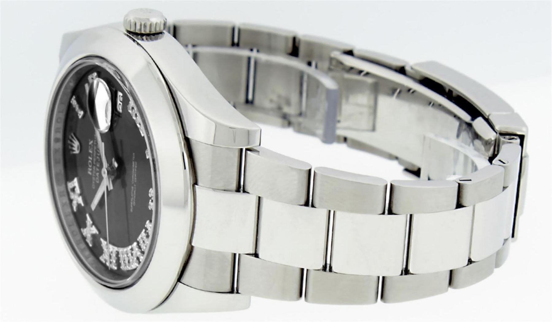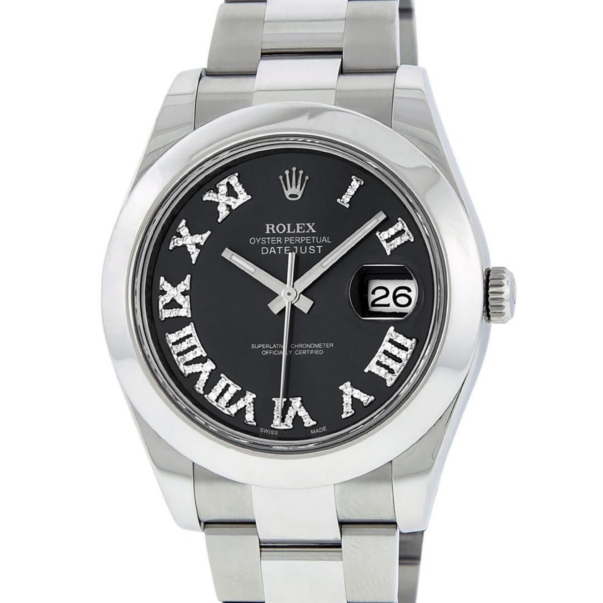 One Mens Rolex Datejust 2 Polished With Shiny Finish, Serviced & Electronically Tested, Stainless Steel Case: 41mm, Stainless Steel Crown, Bezel: Stainless Steel Smooth Bezel, Crystal: Scratch Resistant Synthetic Sapphire Cyclops Lens. Movement: Automatic Winding Movement Caliber 3136. Custom Dial: Slate Roman Diamond Dial, Diamond Color: G To H, Clarity: SI-VS. Date Window: 3 O'Clock Position Date Display, Quickset, Model: Datejust 2. Condition: G-6 Extra Fine The Watch Is In Very Good Condition Free Of All Scratches And Dents. Bracelet: Stainless Steel Oyster Band. Bright Polish & Satin Finish. 7.5 Inch Length, Adjustable. Standard Clasp, With Rolex Logo. This Watch Has Been Serviced Time Tested And Is In Excellent Condition It Is Free Of All Scratches And Dents. This Watch Comes With A Rolex Box.