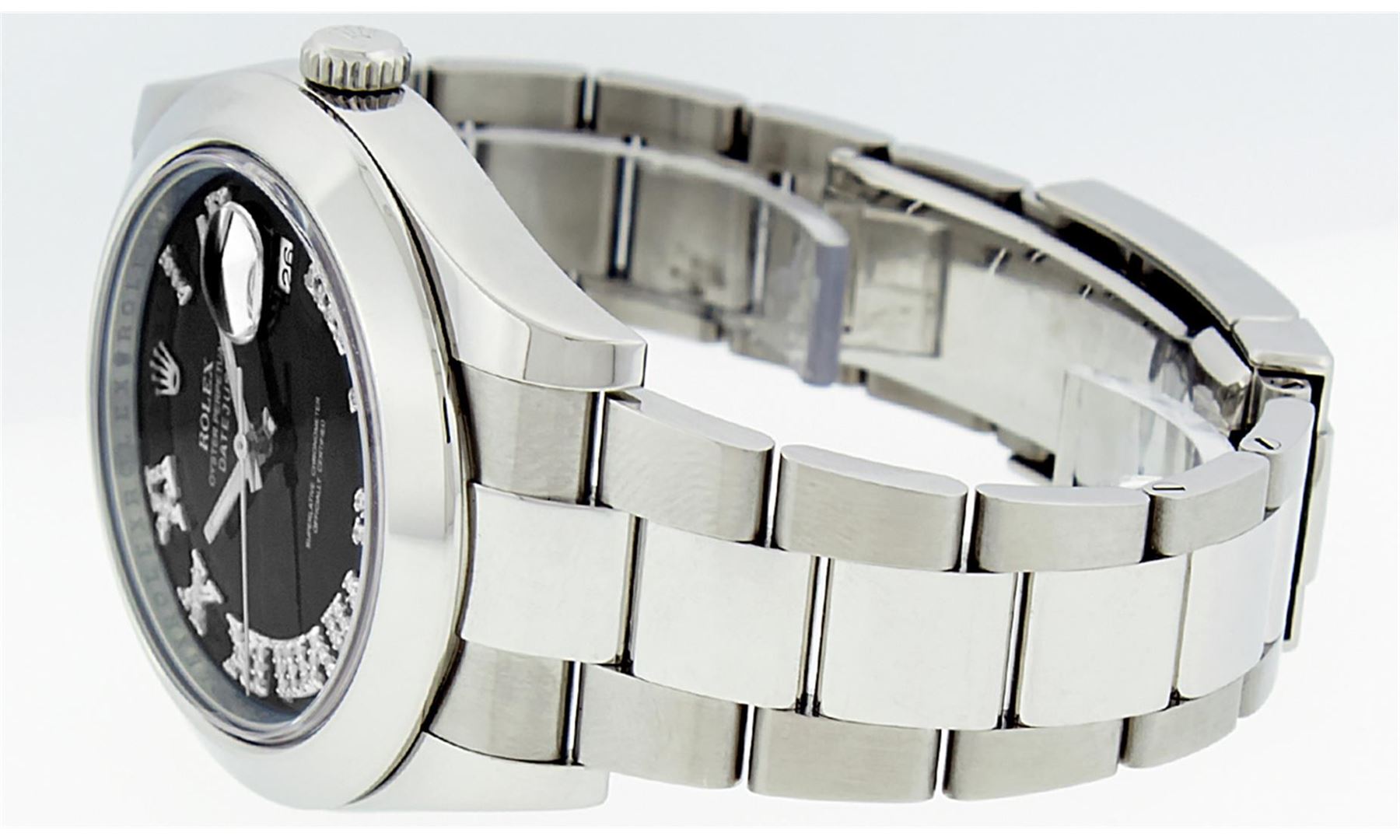 One Mens Pre Owned Rolex Datejust 2 Polished With Shiny Finish, Serviced & Electronically Tested, Stainless Steel Case: 41mm, Stainless Steel Crown, Bezel: Stainless Steel Smooth Bezel, Crystal: Scratch Resistant Synthetic Sapphire Cyclops Lens. Rolex Movement: Automatic Winding Movement. Custom Dial: Slate With Custom Added Roman Diamond Hour Markers. Date Window: 3 O'Clock Position Date Display, Quickset, Model: Datejust 2. Condition: G-6 Extra Fine The Watch Is In Very Good Condition Free Of All Scratches And Dents. Rolex Bracelet: Stainless Steel Oyster Band. Bright Polish & Satin Finish. 7.5 Inch Length, Adjustable. Standard Clasp, With Rolex Logo. This Watch Has Been Serviced Time Tested And Is In Excellent Condition It Is Free Of All Scratches And Dents.