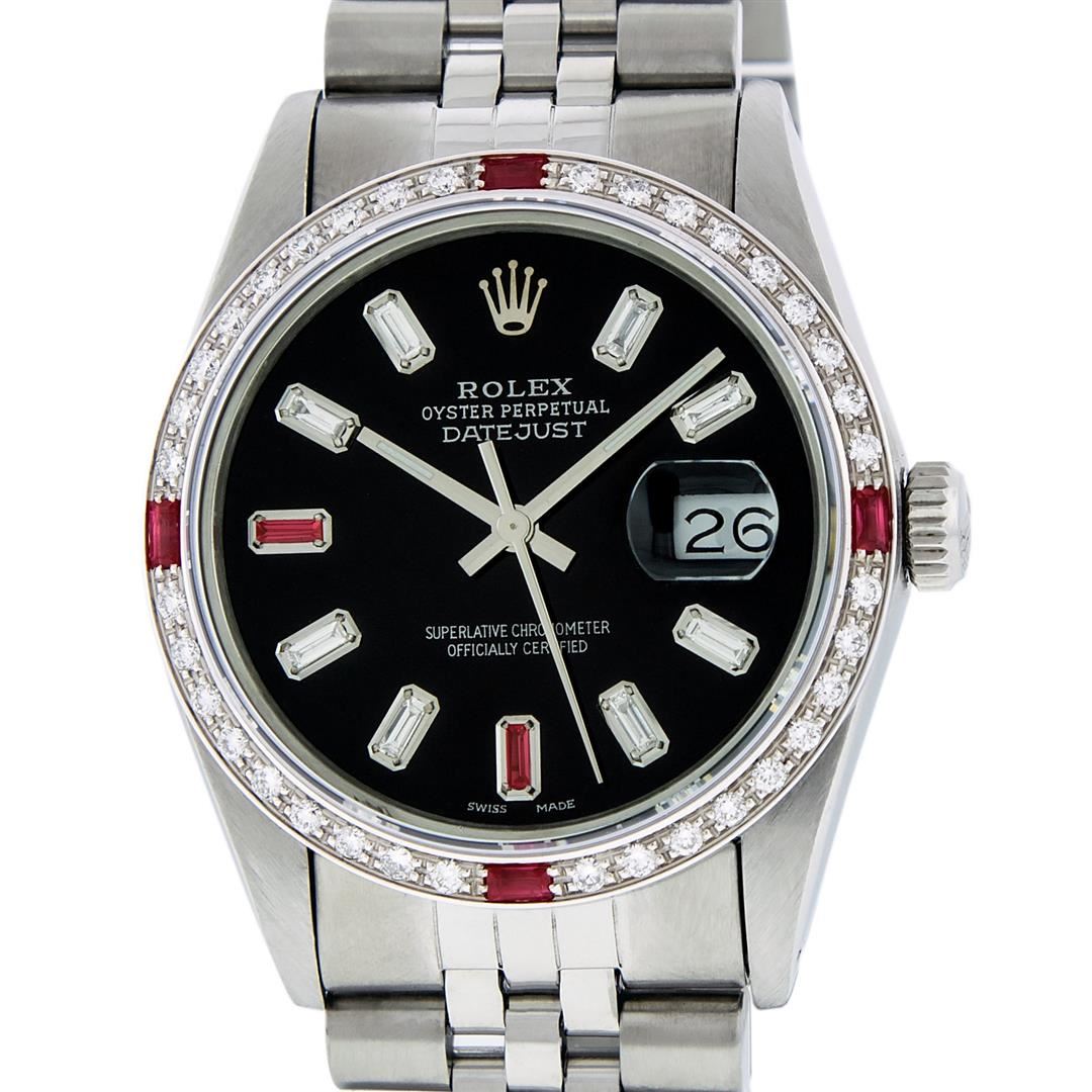 One Gents Rolex Datejust Polished, Serviced & Electronically Tested, Stainless Steel Case:36mm, Stainless Steel Crown, Custom Bezel: 18K White Gold Ruby Beadset Diamond Bezel, Diamond + Gem Count: 36 Diamonds + 4 Rubies, Total Weight 1.00 Carat, Clarity: SI-VS, Color: G to H. Custom Crystal: Synthetic Sapphire Cyclops Lens. Movement: Automatic Winding Movement Caliber 3035. Custom Dial: Black Baguette + 2 Ruby Baguette Diamond Hour Markers,Diamond Count: 8 Diamond + 2 Ruby Baguette. G To H In Color, Clarity: SI-VS. Date Window: 3 O'Clock Position Date Display, Quickset, Model: Datejust. Condition: G-6 Extra Fine. Bracelet: Stainless Steel Jubilee Band. Bright Polish & Satin Finish. 6.5 Inch Length, Adjustable. Standard Clasp, With Rolex Logo