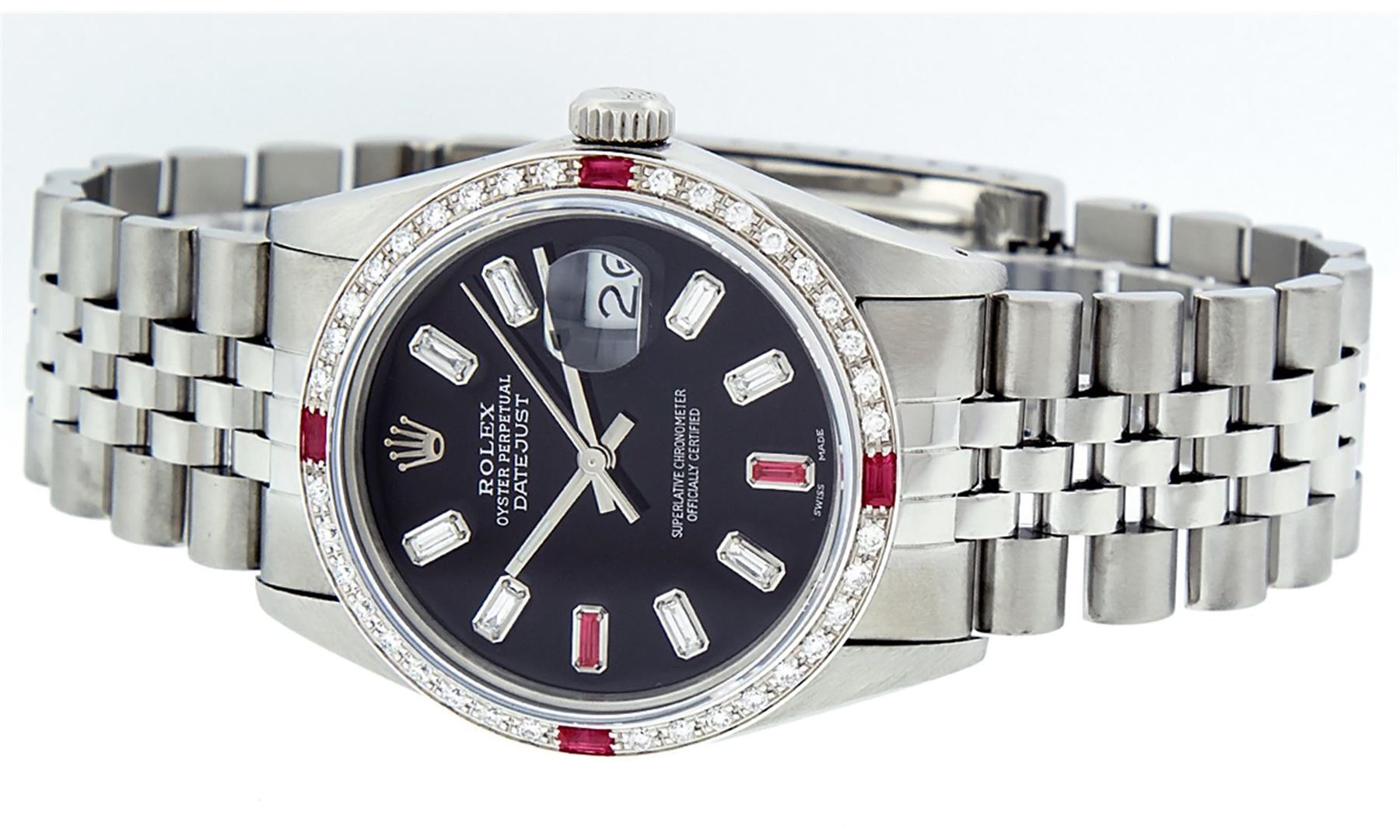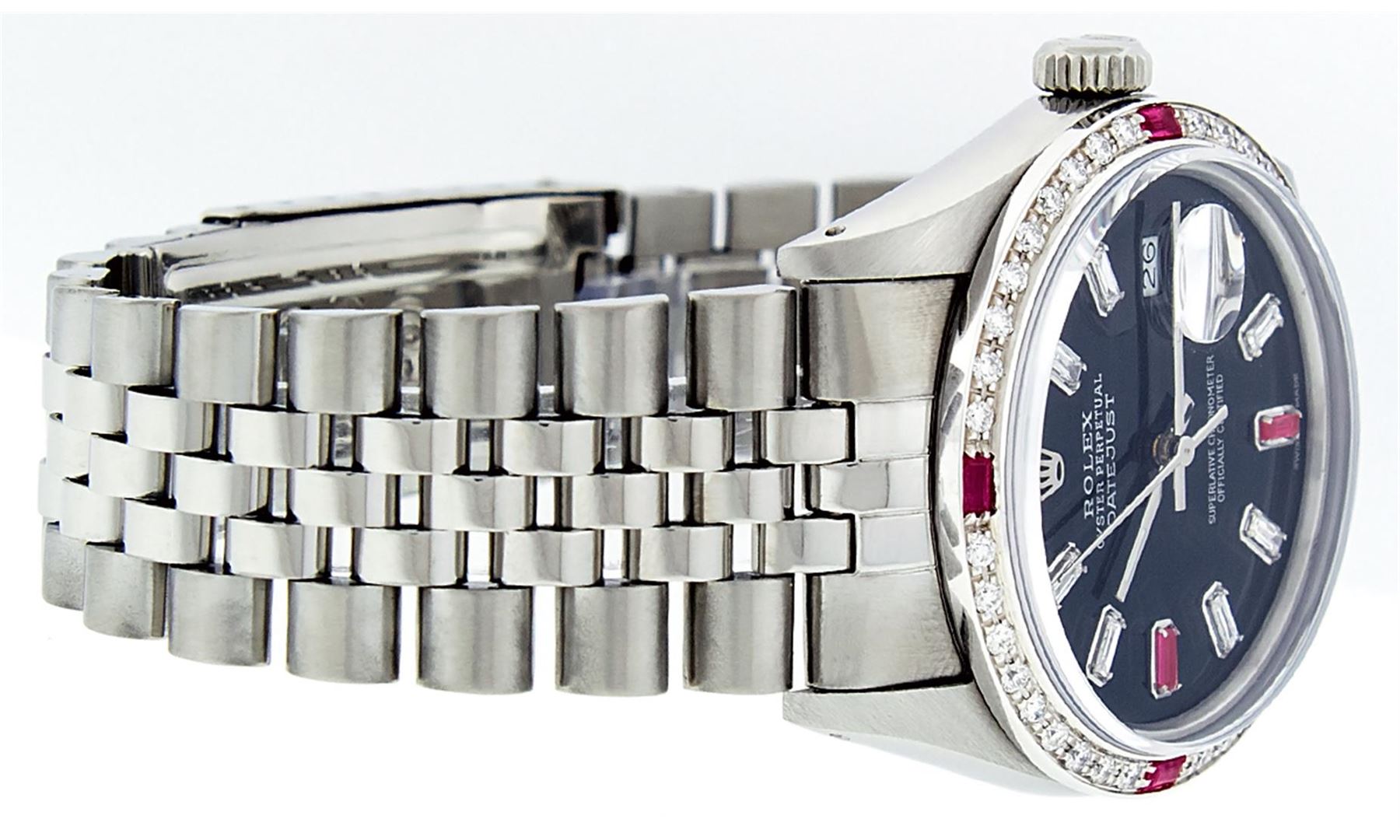 One Gents Rolex Datejust Polished, Serviced & Electronically Tested, Stainless Steel Case:36mm, Stainless Steel Crown, Custom Bezel: 18K White Gold Ruby Beadset Diamond Bezel, Diamond + Gem Count: 36 Diamonds + 4 Rubies, Total Weight 1.00 Carat, Clarity: SI-VS, Color: G to H. Custom Crystal: Synthetic Sapphire Cyclops Lens. Movement: Automatic Winding Movement Caliber 3035. Custom Dial: Black Baguette + 2 Ruby Baguette Diamond Hour Markers,Diamond Count: 8 Diamond + 2 Ruby Baguette. G To H In Color, Clarity: SI-VS. Date Window: 3 O'Clock Position Date Display, Quickset, Model: Datejust. Condition: G-6 Extra Fine. Bracelet: Stainless Steel Jubilee Band. Bright Polish & Satin Finish. 6.5 Inch Length, Adjustable. Standard Clasp, With Rolex Logo