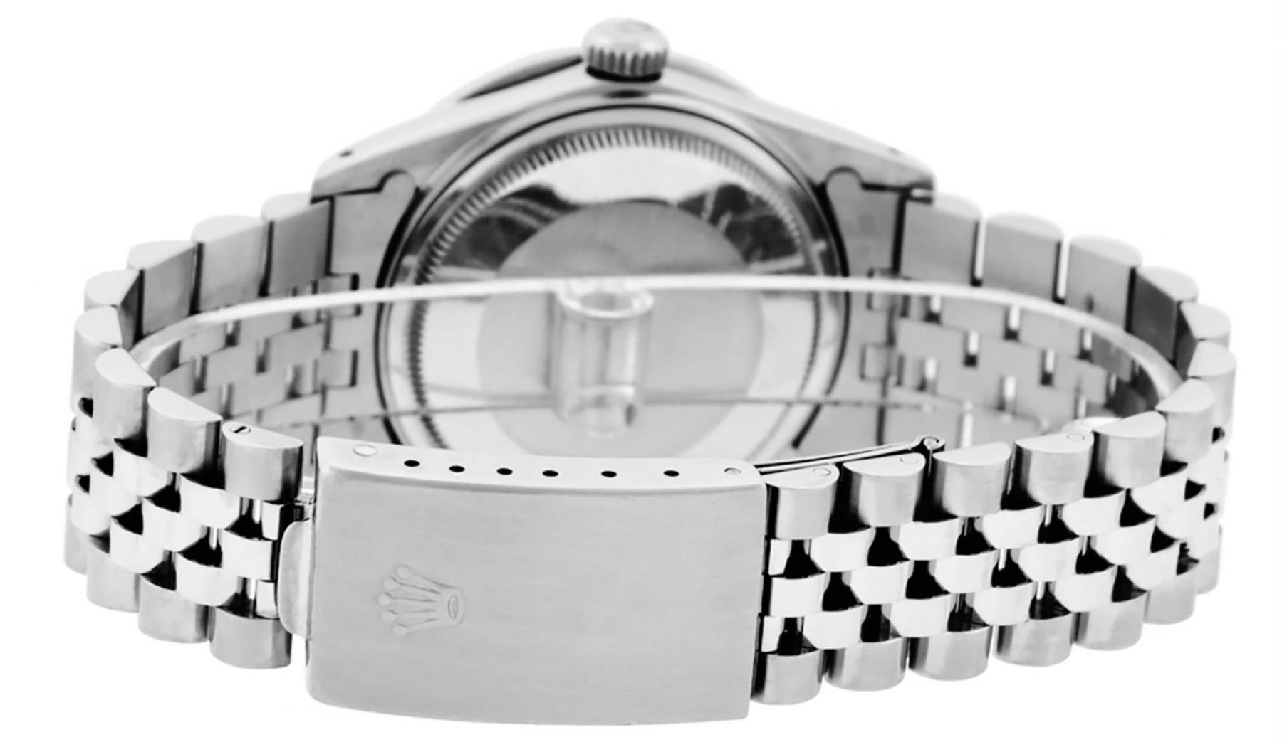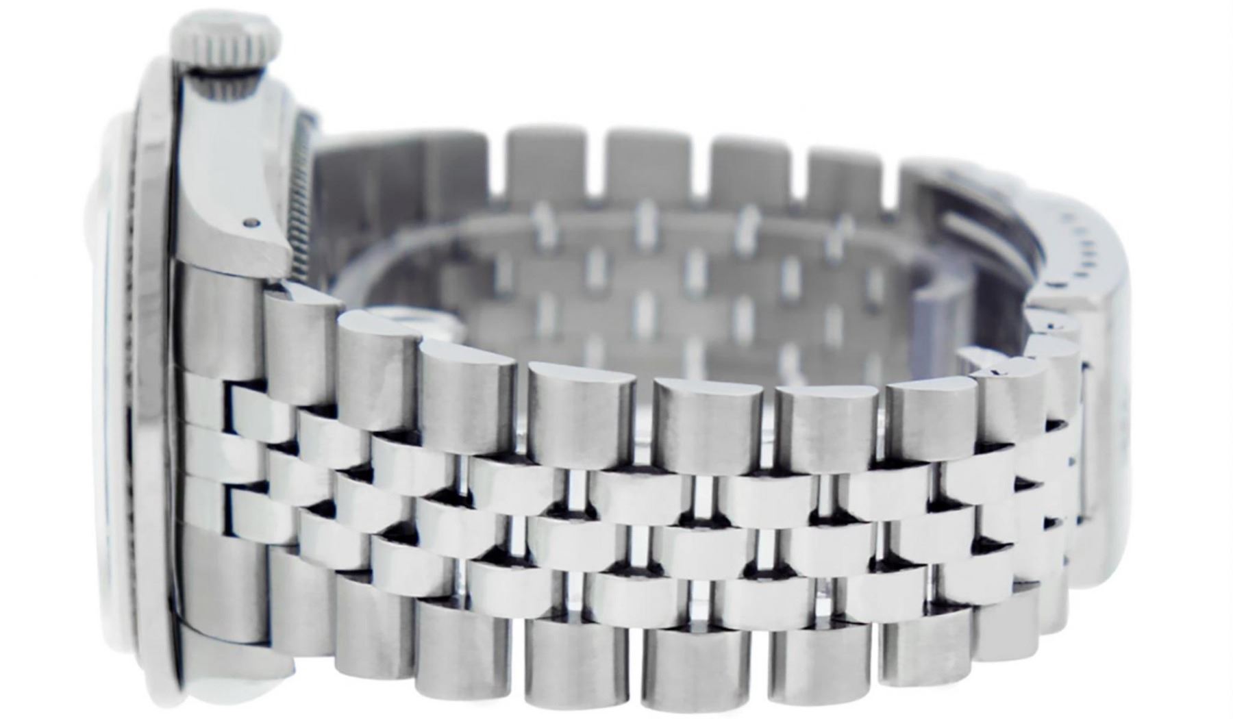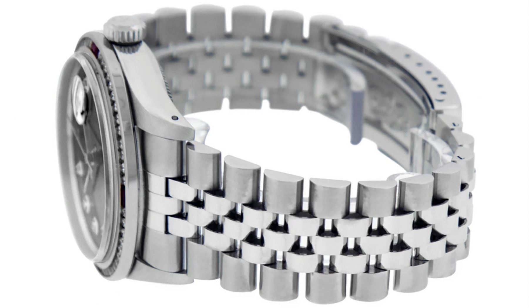 One Mens Pre Owned Stainless Steel Rolex Datejust Polished Bright with Satin Finish, This Watch Has Been Serviced & Electronically Tested, Stainless Steel Case: 36mm, Stainless Steel Crown, Custom Bezel: New 18K White Gold Ruby Channel Set Diamond Bezel, Diamond + Gem Count: 52 Diamonds + 4 Rubies, Clarity: SI-VS, Color: G to H. Custom Crystal: New Sapphire Magnified Date. Custom Hands: New Luminescent Hands. Rolex Movement: Automatic Winding Movement. Custom Dial: Refinished Black Diamond Dial, Diamond Count: 10 Diamonds in Dial, Diamond Color: G To H In Color, Clarity: SI-VS. Date Window: 3 O'Clock Position Date Display, Quickset, Model: Datejust, Condition: G-6 Extra Fine. Rolex Bracelet: Stainless Steel Jubilee. Bracelet: 7.0 Inch Length, Adjustable. Standard Clasp, With Rolex Logo. This Watch Has Been Serviced Time Tested And Is In Excellent Condition It Is Free Of All Scratches And Dents.