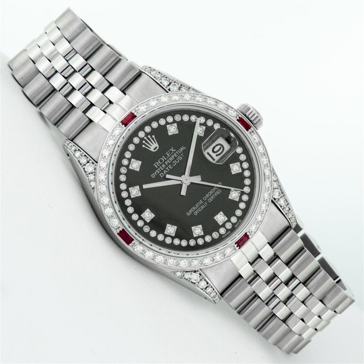 One Mens Rolex Datejust Polished Bright with Satin Finish, Serviced & Electronically Tested, Stainless Steel Case: 36mm, Custom Diamond Lugs: 28 Diamonds In Lugs, Color: G to H, Clarity: SI-VS. Stainless Steel Crown, Custom Bezel: 18K White Gold Diamond + Ruby Beadset, Diamond Count: 36 Diamonds + 4 Rubies, Total Weight 1.00 Carat, Clarity: SI-VS, Color: G to H. Custom Crystal: New Scratch Resistant Synthetic Sapphire Cyclops Lens. Custom Hands: New Luminescent Hands. Movement: Automatic Winding Movement. Custom Dial: Black String Diamond Dial, Stone Count: 58 Diamonds In Dial, Diamond Color: G To H In Color, Clarity: VS. Date Window: 3 O'Clock Position Date Display, Quickset, Model: Datejust Condition: G-6 Extra Fine. Bracelet: Stainless Steel Jubilee Band. Bright Polish & Satin Finish. 7.0 Inch Length, Adjustable. Standard Clasp, With Rolex Logo. This Watch Has Been Serviced And Polished And Its Free Of All Dents And Scratches.