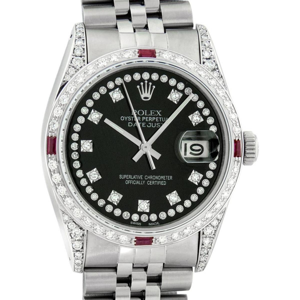 One Mens Rolex Datejust Polished Bright with Satin Finish, Serviced & Electronically Tested, Stainless Steel Case: 36mm, Custom Diamond Lugs: 28 Diamonds In Lugs, Color: G to H, Clarity: SI-VS. Stainless Steel Crown, Custom Bezel: 18K White Gold Diamond + Ruby Beadset, Diamond Count: 36 Diamonds + 4 Rubies, Total Weight 1.00 Carat, Clarity: SI-VS, Color: G to H. Custom Crystal: New Scratch Resistant Synthetic Sapphire Cyclops Lens. Custom Hands: New Luminescent Hands. Movement: Automatic Winding Movement. Custom Dial: Black String Diamond Dial, Stone Count: 58 Diamonds In Dial, Diamond Color: G To H In Color, Clarity: VS. Date Window: 3 O'Clock Position Date Display, Quickset, Model: Datejust Condition: G-6 Extra Fine. Bracelet: Stainless Steel Jubilee Band. Bright Polish & Satin Finish. 7.0 Inch Length, Adjustable. Standard Clasp, With Rolex Logo. This Watch Has Been Serviced And Polished And Its Free Of All Dents And Scratches.