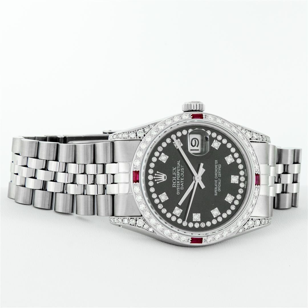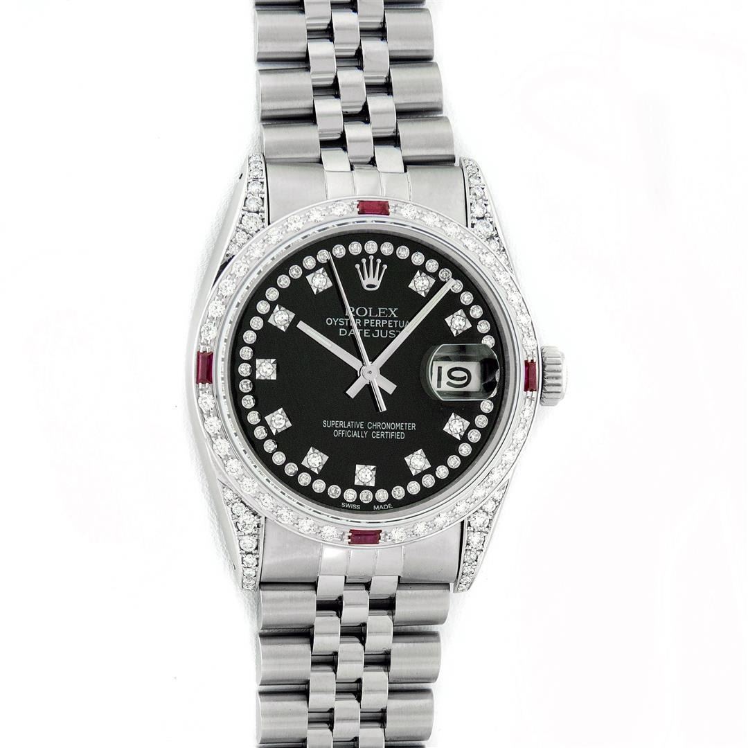 One Mens Rolex Datejust Polished Bright with Satin Finish, Serviced & Electronically Tested, Stainless Steel Case: 36mm, Custom Diamond Lugs: 28 Diamonds In Lugs, Color: G to H, Clarity: SI-VS. Stainless Steel Crown, Custom Bezel: 18K White Gold Diamond + Ruby Beadset, Diamond Count: 36 Diamonds + 4 Rubies, Total Weight 1.00 Carat, Clarity: SI-VS, Color: G to H. Custom Crystal: New Scratch Resistant Synthetic Sapphire Cyclops Lens. Custom Hands: New Luminescent Hands. Movement: Automatic Winding Movement. Custom Dial: Black String Diamond Dial, Stone Count: 58 Diamonds In Dial, Diamond Color: G To H In Color, Clarity: VS. Date Window: 3 O'Clock Position Date Display, Quickset, Model: Datejust Condition: G-6 Extra Fine. Bracelet: Stainless Steel Jubilee Band. Bright Polish & Satin Finish. 7.0 Inch Length, Adjustable. Standard Clasp, With Rolex Logo. This Watch Has Been Serviced And Polished And Its Free Of All Dents And Scratches.