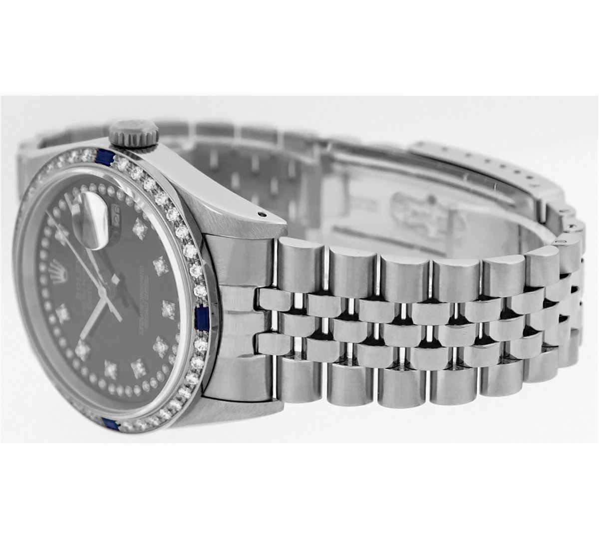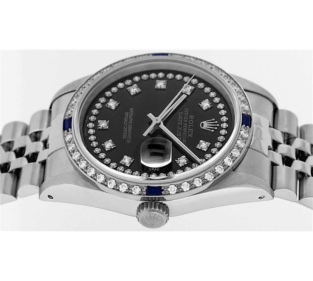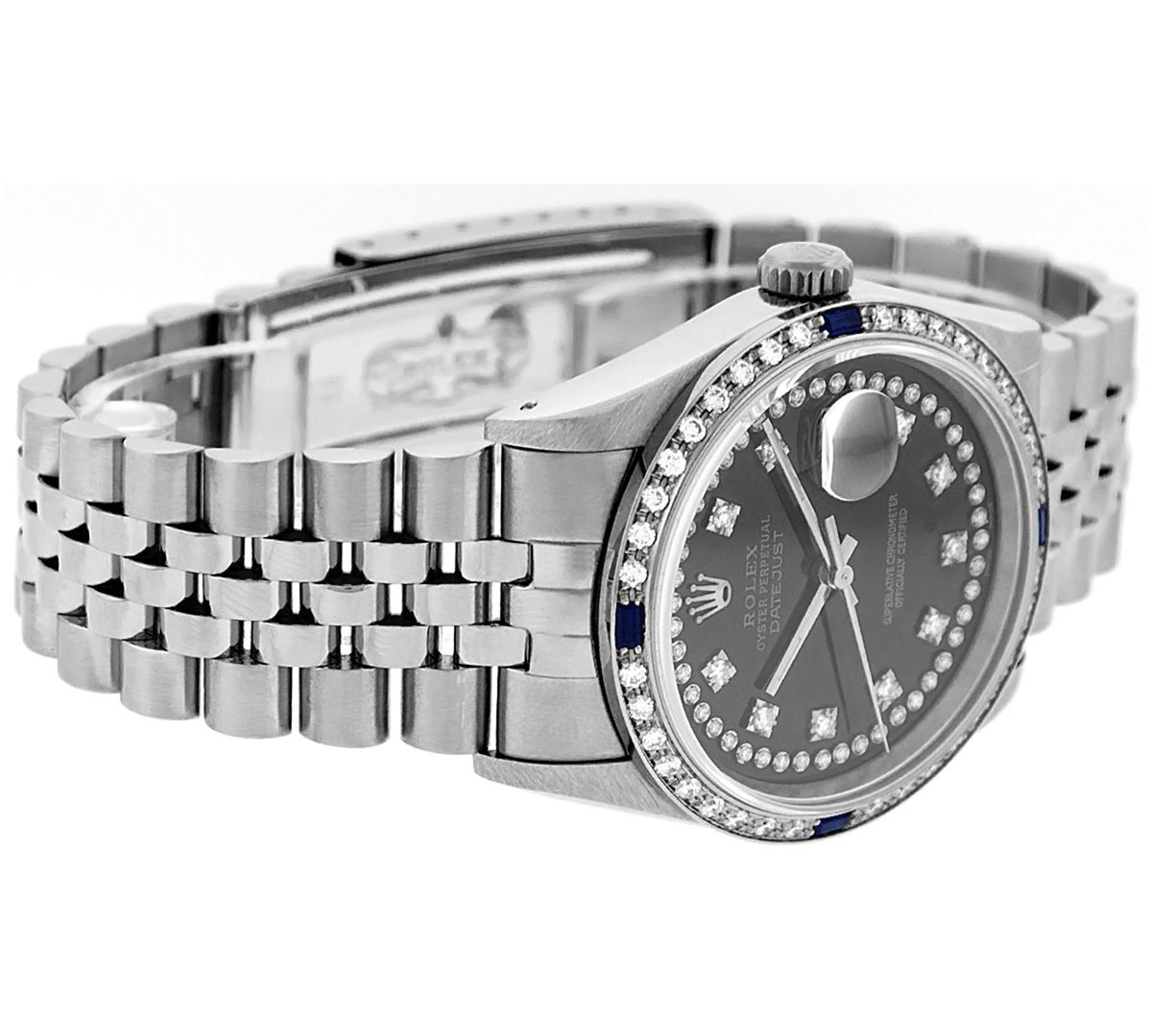 One Gents Rolex Datejust Polished, Serviced & Electronically Tested, Stainless Steel Case:36mm, Stainless Steel Crown, Custom Bezel: 18K White Gold Sapphire Beadset Bezel, Stone Count: 36 Diamonds + 4 Sapphires, Clarity: SI-VS, Color: G to H. Custom Crystal: Synthetic Sapphire Cyclops Lens. Movement: Automatic Winding Movement Caliber 3035. Custom Dial: Black String VVS Diamond Dial, Diamond Count: 58 Diamond In Dial, G To H In Color, Clarity: VS. Date Window: 3 O'Clock Position Date Display, Quickset, Model: Datejust. Condition: G-6 Extra Fine. Bracelet: Stainless Steel Jubilee Band. Bright Polish & Satin Finish. 7.0 Inch Length, Adjustable. Standard Clasp, With Rolex Logo.