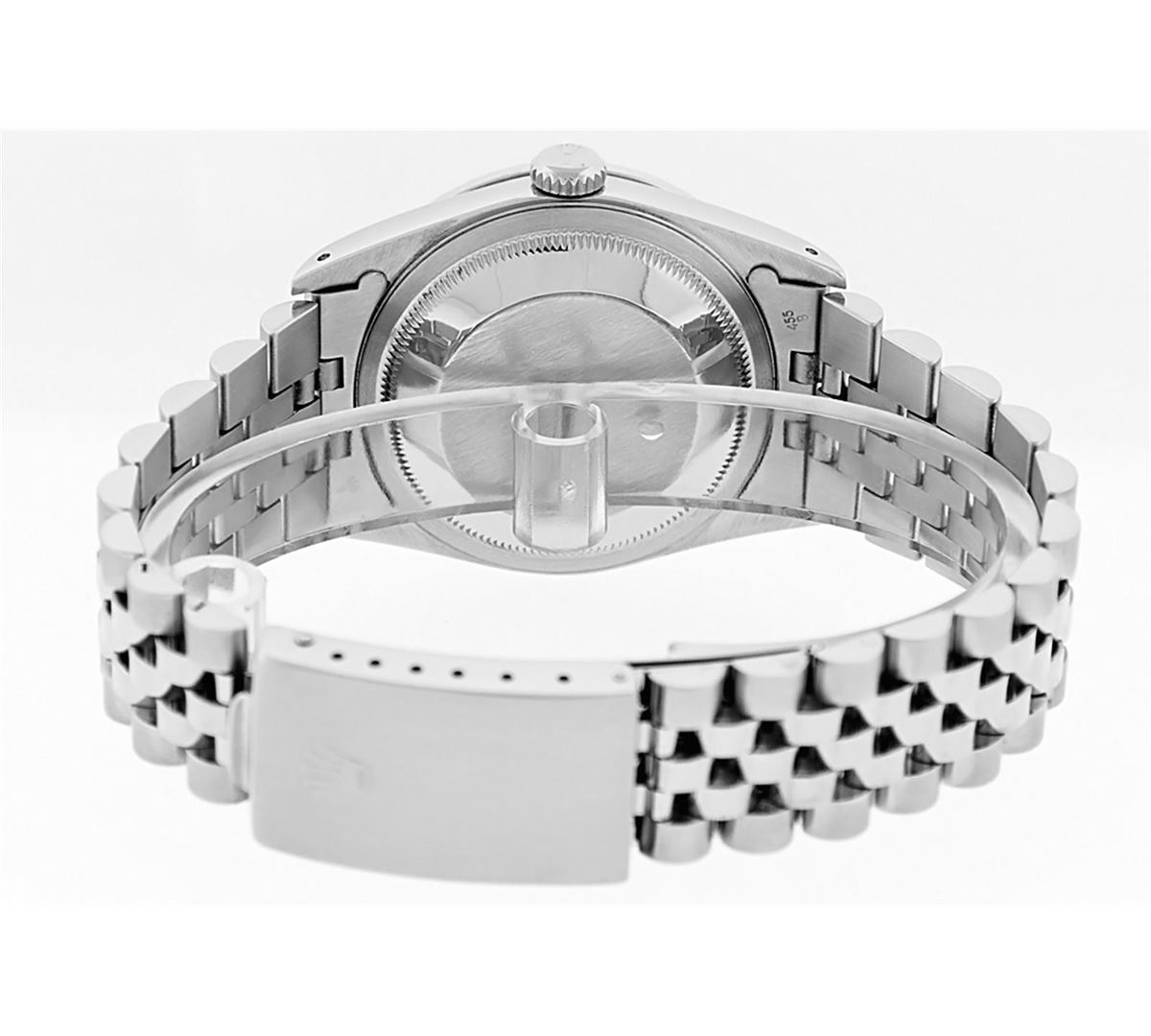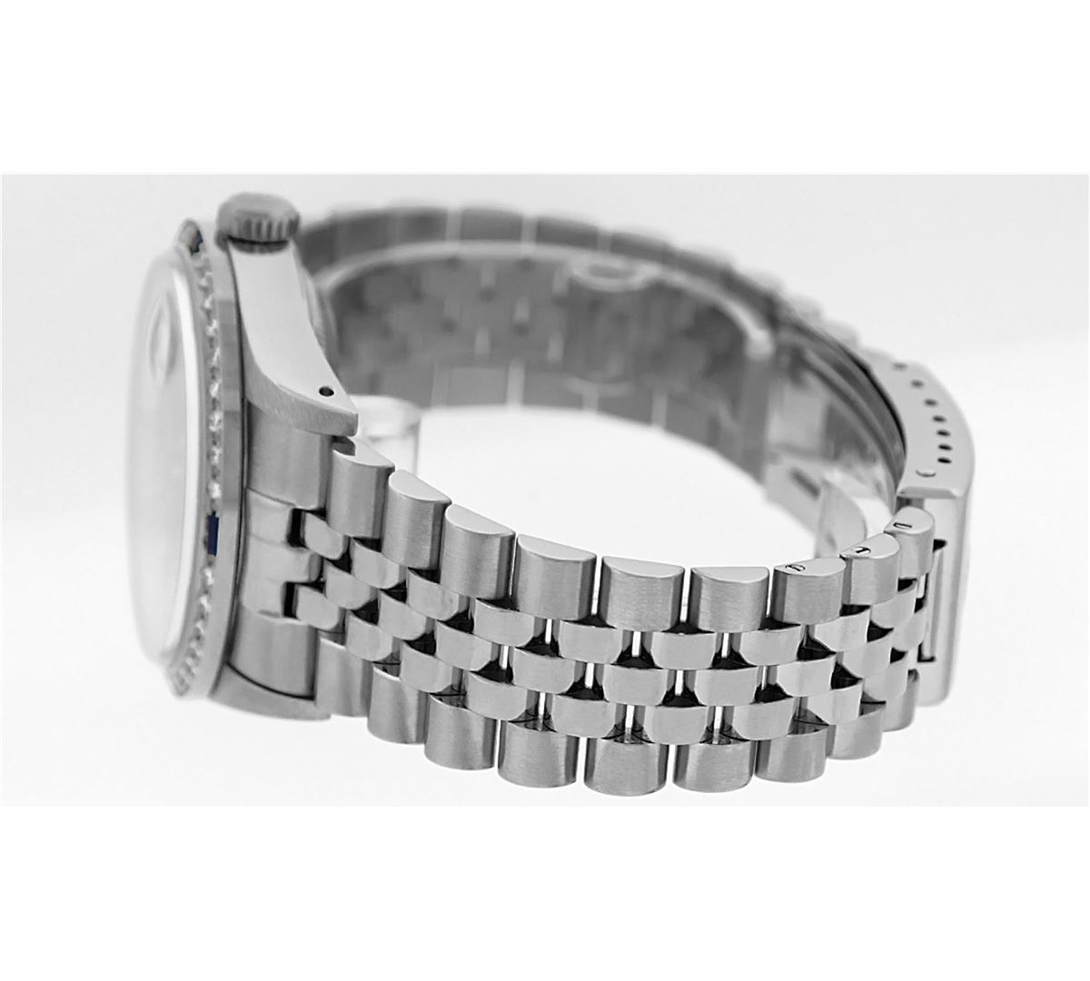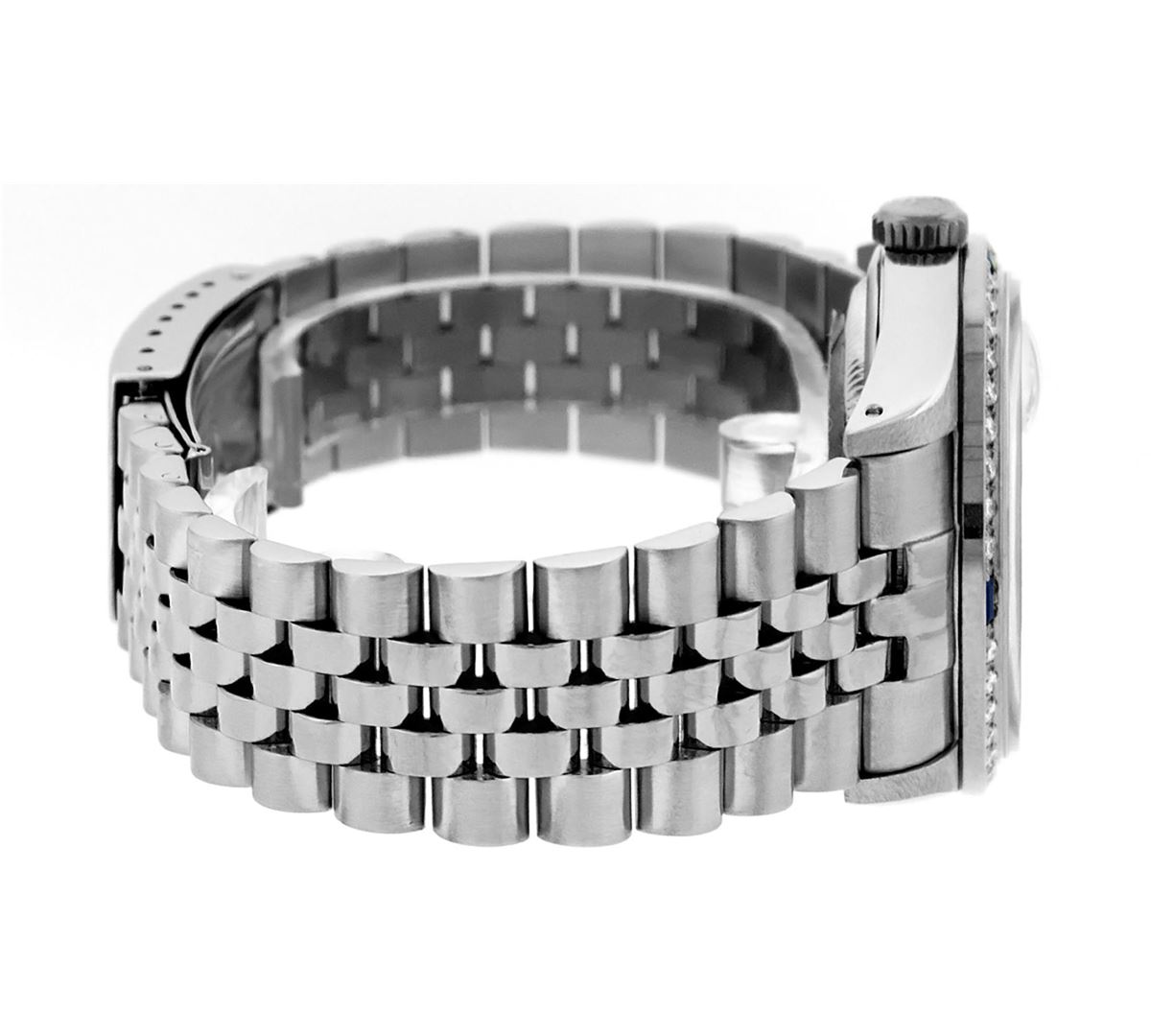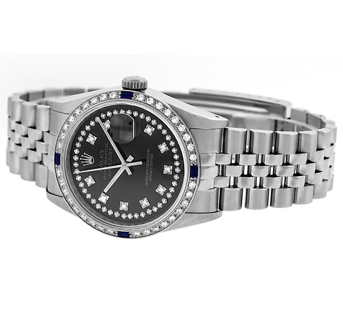 One Gents Rolex Datejust Polished, Serviced & Electronically Tested, Stainless Steel Case:36mm, Stainless Steel Crown, Custom Bezel: 18K White Gold Sapphire Beadset Bezel, Stone Count: 36 Diamonds + 4 Sapphires, Clarity: SI-VS, Color: G to H. Custom Crystal: Synthetic Sapphire Cyclops Lens. Movement: Automatic Winding Movement Caliber 3035. Custom Dial: Black String VVS Diamond Dial, Diamond Count: 58 Diamond In Dial, G To H In Color, Clarity: VS. Date Window: 3 O'Clock Position Date Display, Quickset, Model: Datejust. Condition: G-6 Extra Fine. Bracelet: Stainless Steel Jubilee Band. Bright Polish & Satin Finish. 7.0 Inch Length, Adjustable. Standard Clasp, With Rolex Logo.