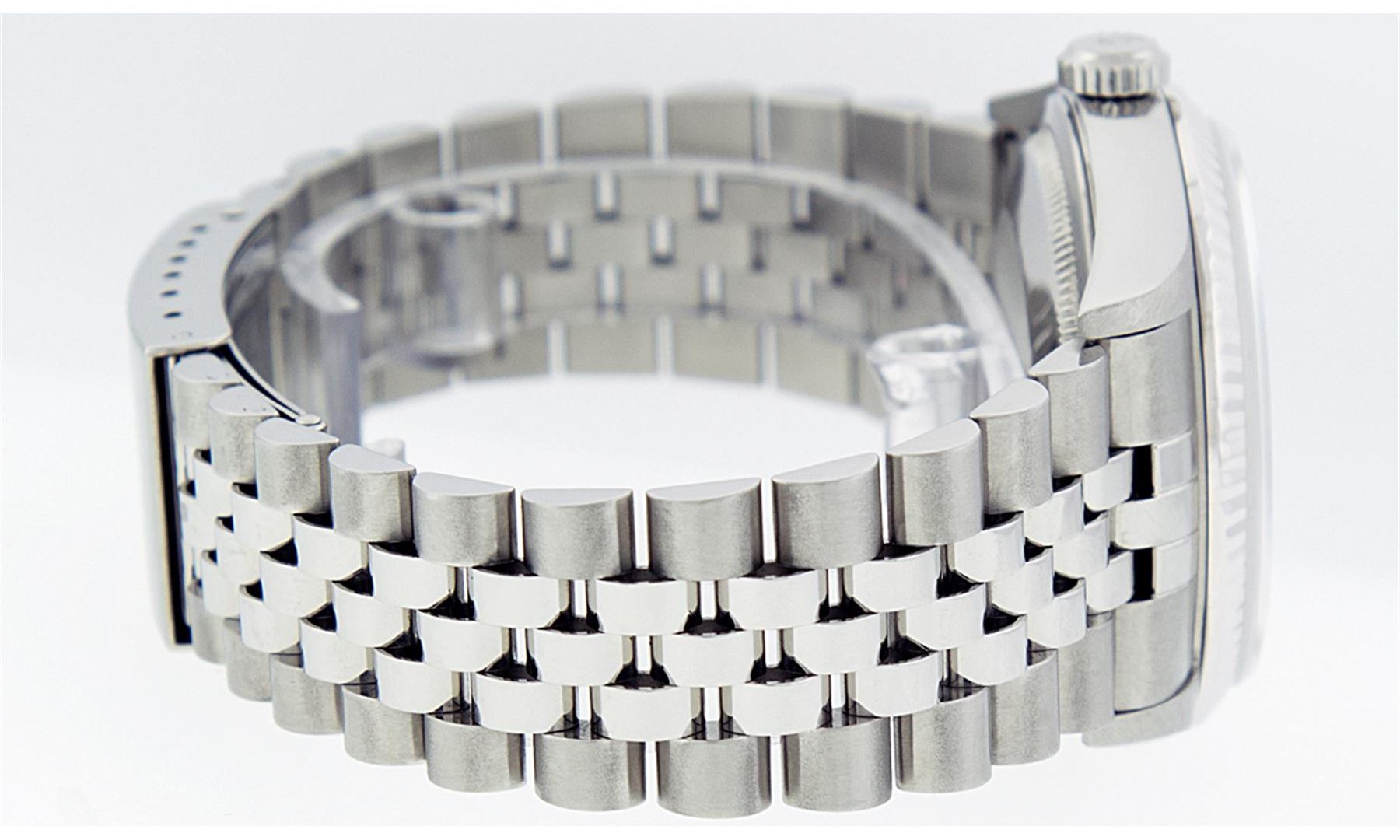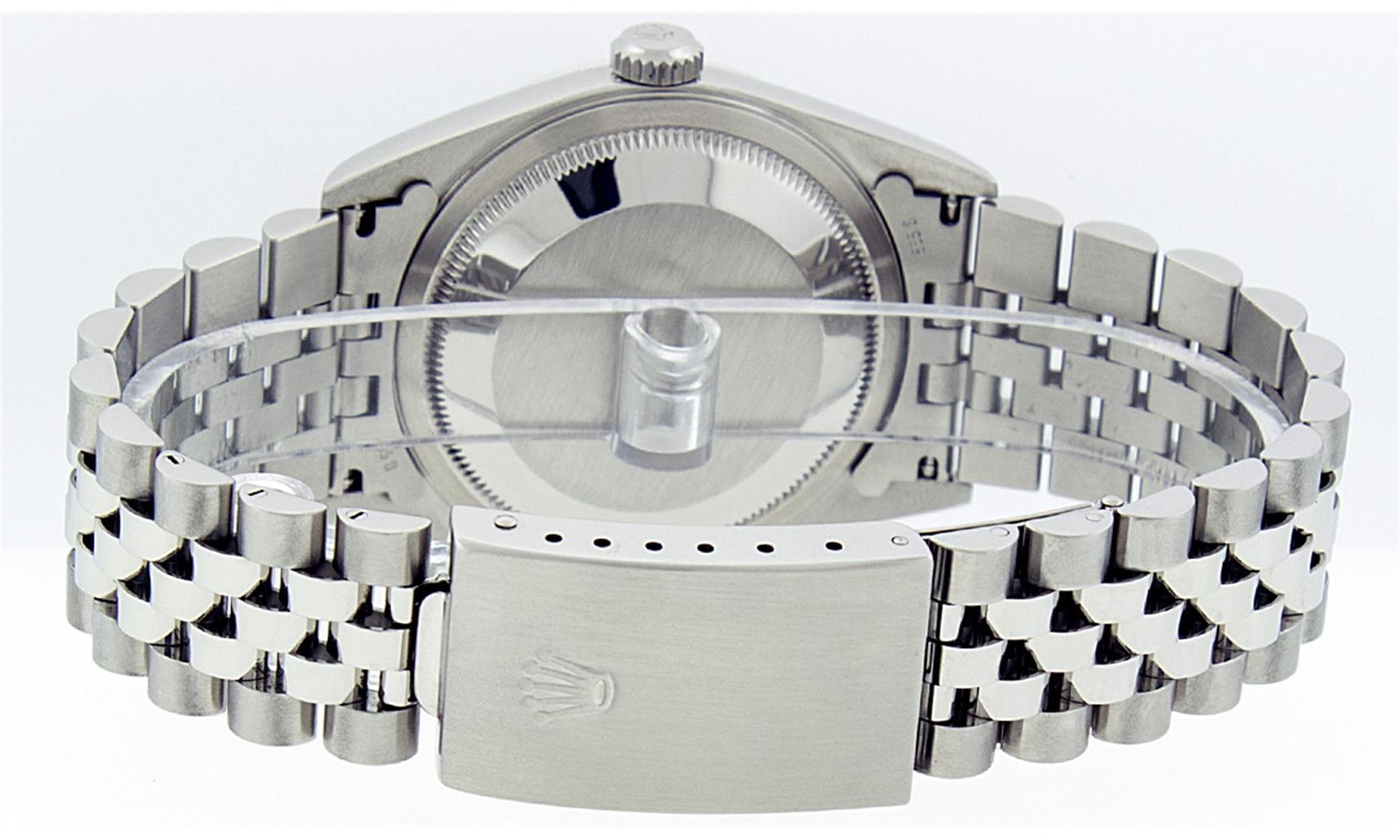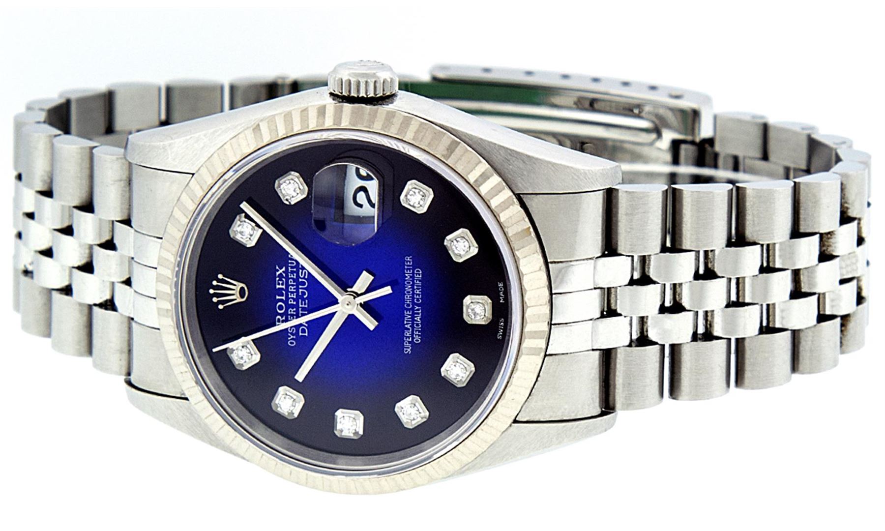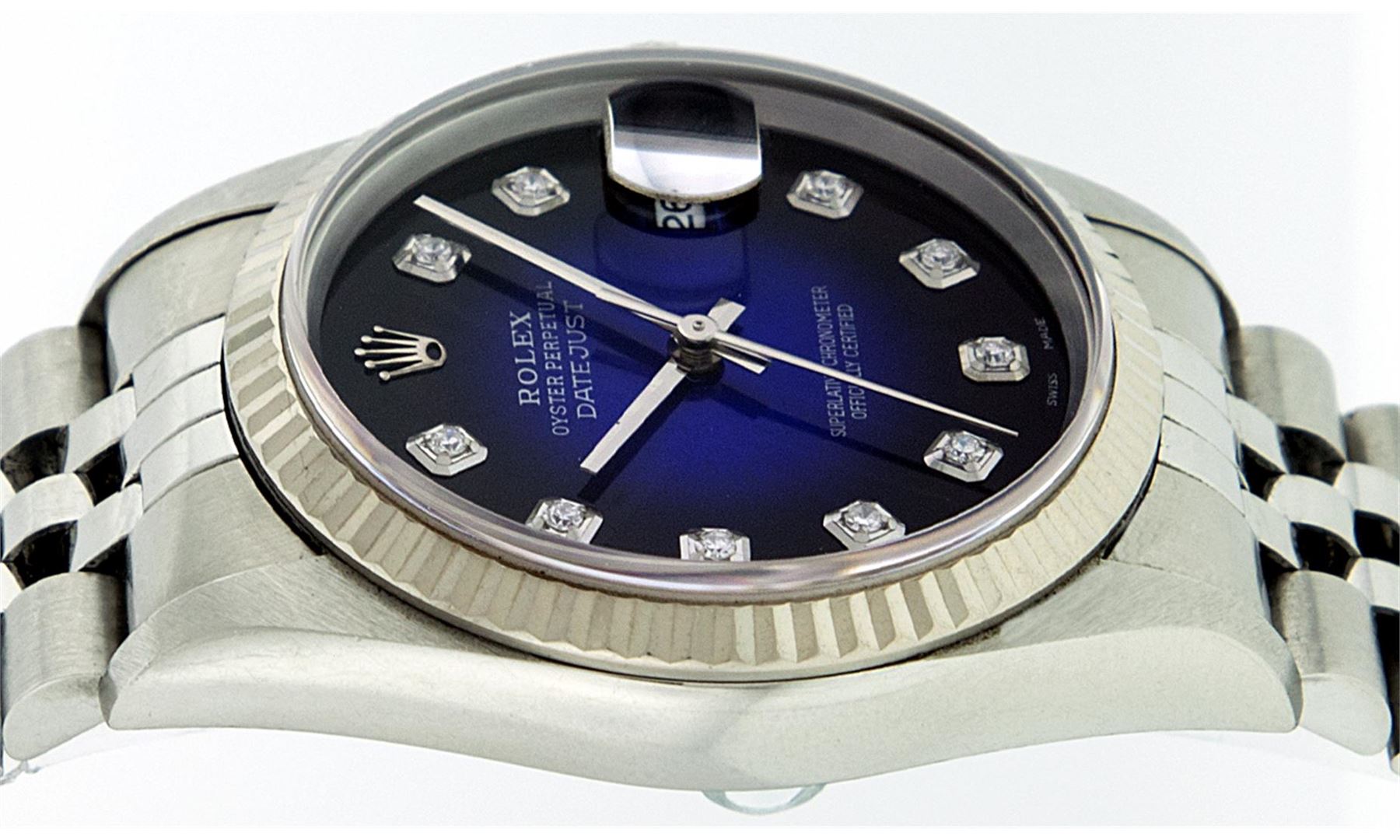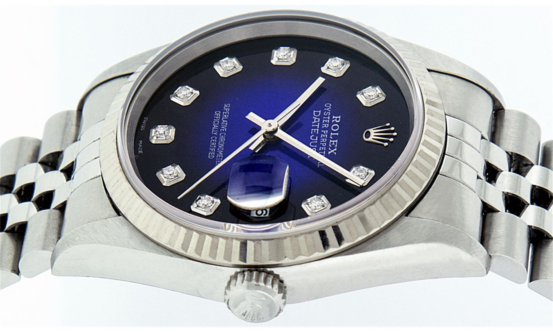 One Gents Rolex Stainless Steel Datejust Polished Bright with Satin Finish, Serviced & Electronically Tested, Stainless Steel Case: 36mm, Stainless Steel Crown, Bezel: 18K White Gold Fluted Bezel. Crystal: Synthetic Sapphire Cyclops Lens. Movement: Automatic Winding Movement Caliber 3135. Custom Dial: Blue Vignette Diamond Dial, Diamond Count: 10 Diamonds In Dial, Clarity: SI-VS, Color: G to H. Date Window: 3 O'Clock Position Date Display, Quickset, Model: 16234 Quickset Datejust. Condition: G-6 Extra Fine. Bracelet:Stainless Steel Jubilee Band. Bright Polish & Satin Finish. 7.0 Inch Length, Adjustable. Standard Clasp, With Rolex Logo.