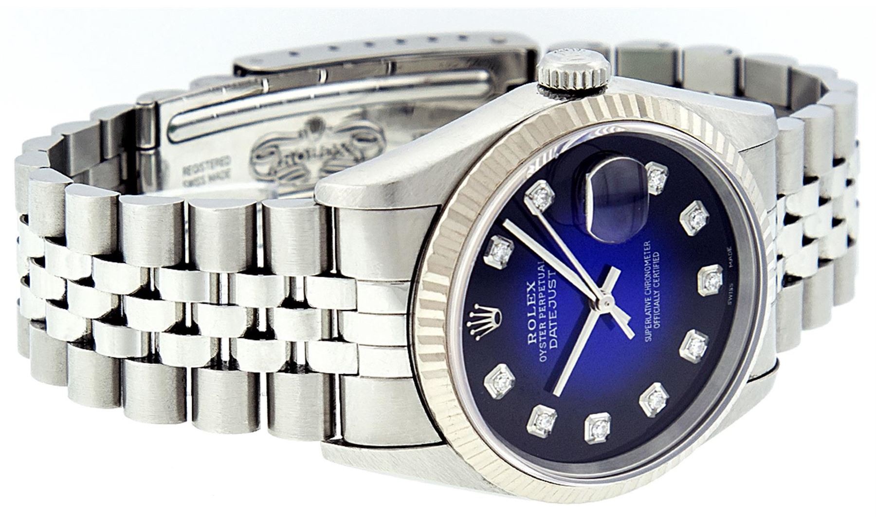 One Gents Rolex Stainless Steel Datejust Polished Bright with Satin Finish, Serviced & Electronically Tested, Stainless Steel Case: 36mm, Stainless Steel Crown, Bezel: 18K White Gold Fluted Bezel. Crystal: Synthetic Sapphire Cyclops Lens. Movement: Automatic Winding Movement Caliber 3135. Custom Dial: Blue Vignette Diamond Dial, Diamond Count: 10 Diamonds In Dial, Clarity: SI-VS, Color: G to H. Date Window: 3 O'Clock Position Date Display, Quickset, Model: 16234 Quickset Datejust. Condition: G-6 Extra Fine. Bracelet:Stainless Steel Jubilee Band. Bright Polish & Satin Finish. 7.0 Inch Length, Adjustable. Standard Clasp, With Rolex Logo.
