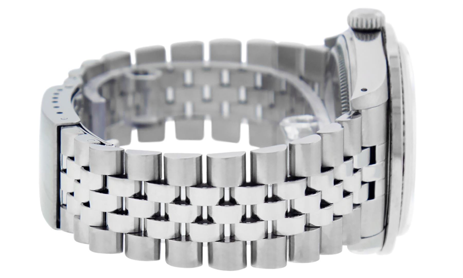 One Mens Stainless Steel Rolex Datejust Polished Bright with Satin Finish, This Watch Has Been Serviced & Electronically Tested, Stainless Steel Case: 36mm, Stainless Steel Crown, Custom Bezel: New 18K White Gold Ruby Channel Set Diamond Bezel, Diamond + Gem Count: 52 Diamonds + 4 Rubies, Total Weight 1.30 Carat, Clarity: SI-VS, Color: G to H. Custom Crystal: New Synthetic Sapphire Cyclops Lens. Custom Hands: New Luminescent Hands. Movement: Automatic Winding Movement Caliber 3035. Custom Dial: Blue Vignette Diamond Dial, Diamond Count: 10 Diamonds in Dial, Diamond Color: G To H In Color, Clarity: SI-VS. Date Window: 3 O'Clock Position Date Display, Quickset, Model: Datejust, Condition: G-6 Extra Fine. Bracelet: Stainless Steel Jubilee. Bracelet: 7.0 Inch Length, Adjustable. Standard Clasp, With Rolex Logo. This Watch Has Been Serviced Time Tested And Is In Excellent Condition It Is Free Of All Scratches And Dents.