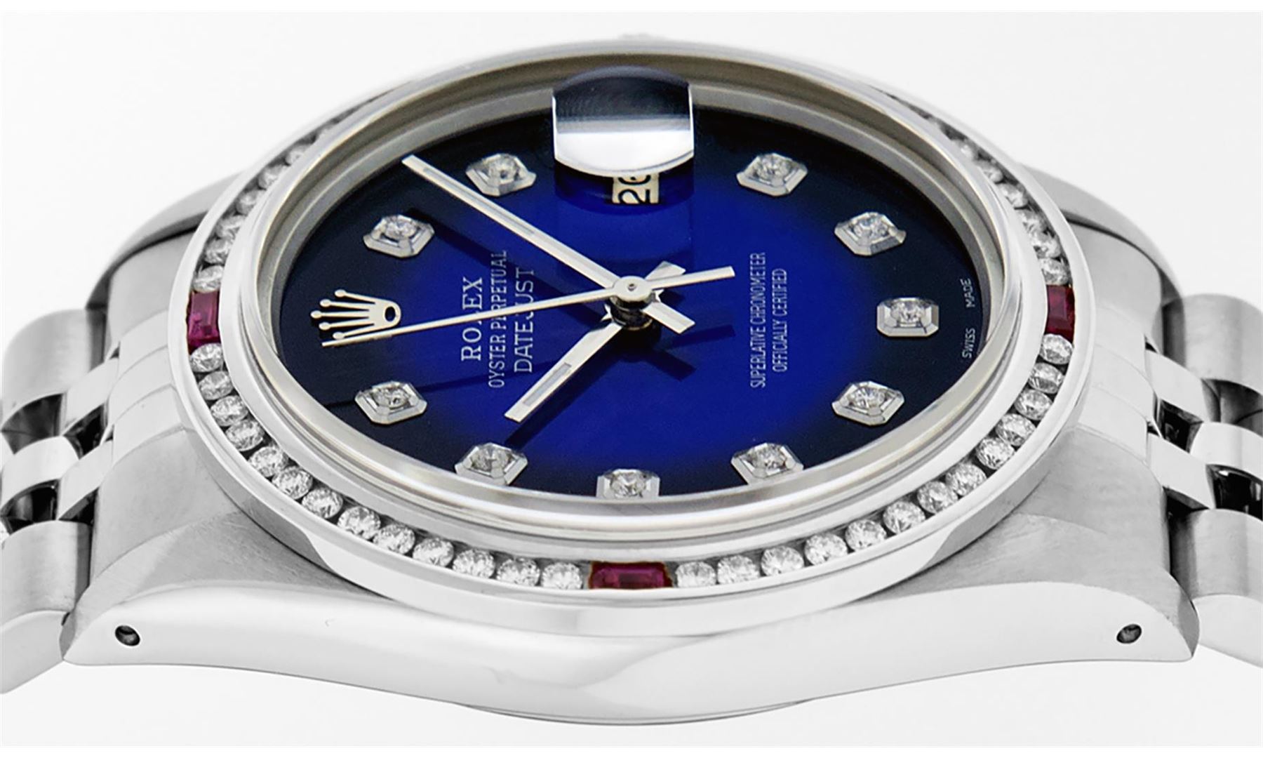 One Mens Stainless Steel Rolex Datejust Polished Bright with Satin Finish, This Watch Has Been Serviced & Electronically Tested, Stainless Steel Case: 36mm, Stainless Steel Crown, Custom Bezel: New 18K White Gold Ruby Channel Set Diamond Bezel, Diamond + Gem Count:�52 Diamonds + 4 Rubies, Total Weight 1.30 Carat, Clarity: SI-VS, Color: G to H. Custom Crystal: New Scratch Resistant Synthetic Sapphire Cyclops Lens. Custom Hands: New Luminescent Hands. Movement: Automatic Winding Movement Caliber 3035. Custom Dial: Blue Vignette Diamond Dial, Diamond Count: 10 Diamonds in Dial, Diamond Color: G To H In Color, Clarity: VS2. Date Window: 3 O'Clock Position Date Display, Quickset, Model: Datejust, Condition: G-6 Extra Fine. Bracelet: Stainless Steel Jubilee Band. Bracelet: 7.0 Inch Length, Adjustable. Standard Clasp, With Rolex Logo. This Watch Has Been Serviced Time Tested And Is In Excellent Condition It Is Free Of All Scratches And Dents.