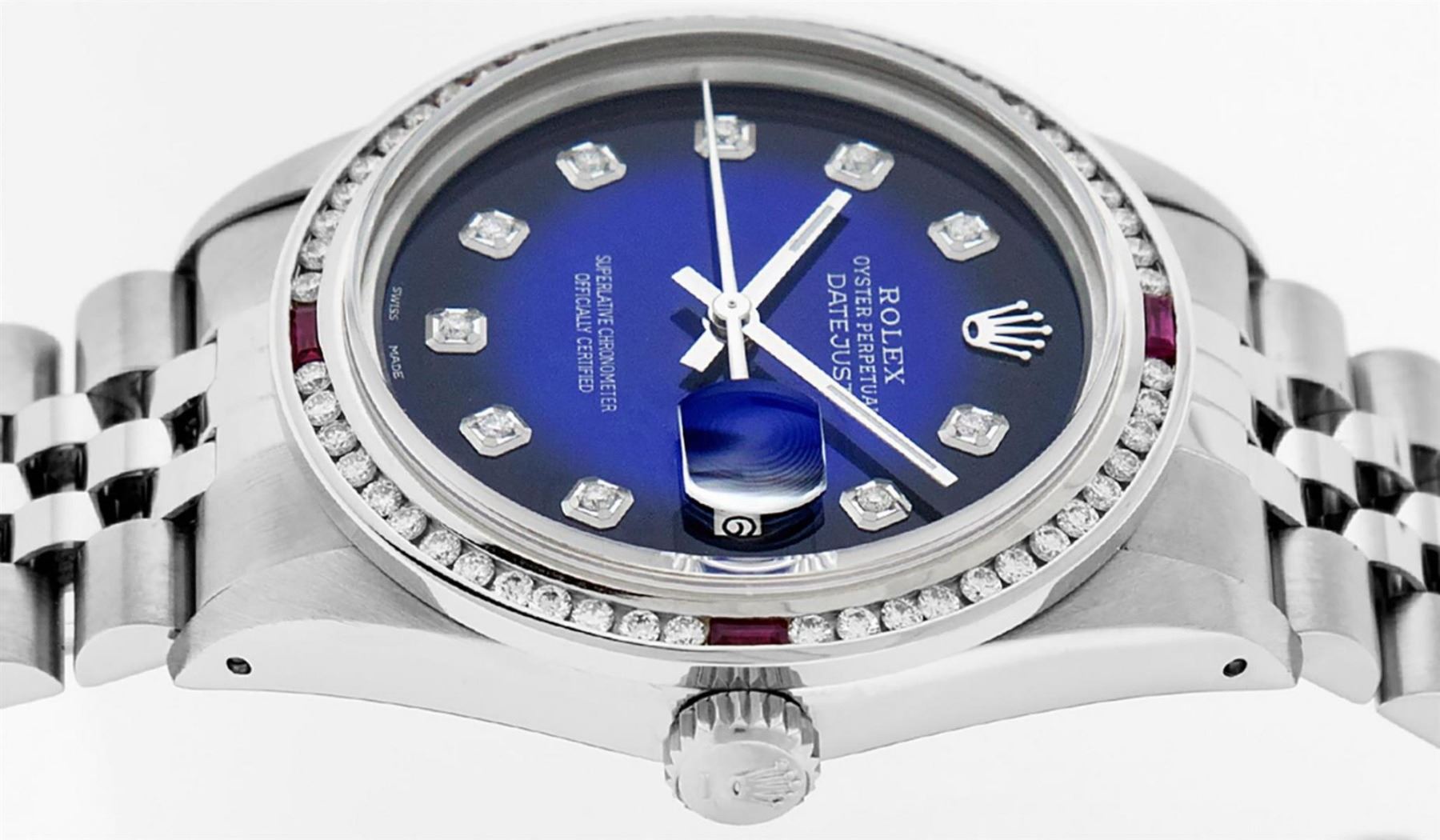 One Mens Stainless Steel Rolex Datejust Polished Bright with Satin Finish, This Watch Has Been Serviced & Electronically Tested, Stainless Steel Case: 36mm, Stainless Steel Crown, Custom Bezel: New 18K White Gold Ruby Channel Set Diamond Bezel, Diamond + Gem Count: 52 Diamonds + 4 Rubies, Total Weight 1.30 Carat, Clarity: SI-VS, Color: G to H. Custom Crystal: New Scratch Resistant Synthetic Sapphire Cyclops Lens. Custom Hands: New Luminescent Hands. Movement: Automatic Winding Movement Caliber 3035. Custom Dial: Blue Vignette Diamond Dial, Diamond Count: 10 Diamonds in Dial, Diamond Color: G To H In Color, Clarity: VS2. Date Window: 3 O'Clock Position Date Display, Quickset, Model: Datejust, Condition: G-6 Extra Fine. Bracelet: Stainless Steel Jubilee Band. Bracelet: 7.0 Inch Length, Adjustable. Standard Clasp, With Rolex Logo. This Watch Has Been Serviced Time Tested And Is In Excellent Condition It Is Free Of All Scratches And Dents.