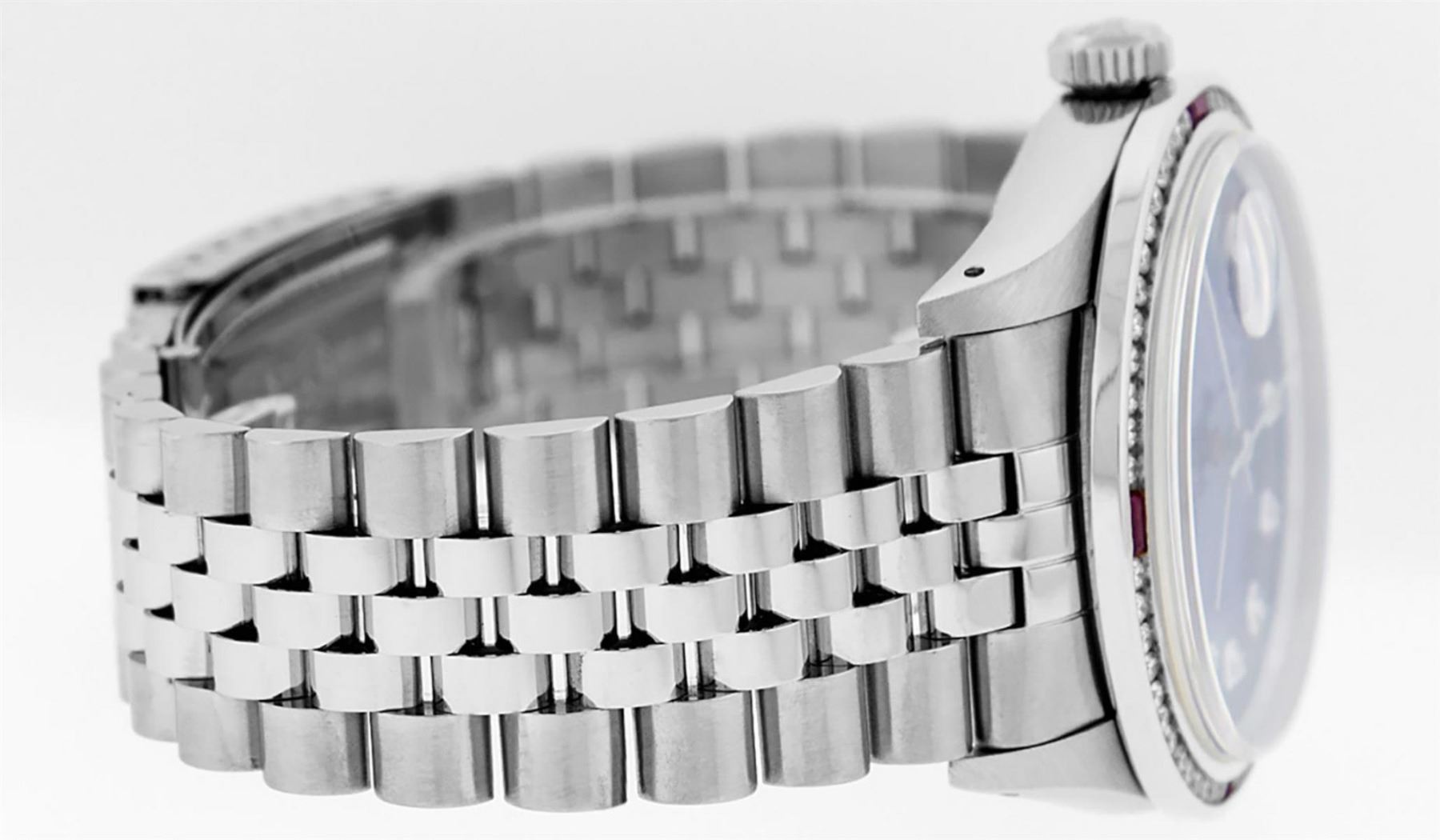 One Mens Stainless Steel Rolex Datejust Polished Bright with Satin Finish, This Watch Has Been Serviced & Electronically Tested, Stainless Steel Case: 36mm, Stainless Steel Crown, Custom Bezel: New 18K White Gold Ruby Channel Set Diamond Bezel, Diamond + Gem Count: 52 Diamonds + 4 Rubies, Total Weight 1.30 Carat, Clarity: SI-VS, Color: G to H. Custom Crystal: New Scratch Resistant Synthetic Sapphire Cyclops Lens. Custom Hands: New Luminescent Hands. Movement: Automatic Winding Movement. Custom Dial: Blue Vignette Diamond Dial, Diamond Count: 10 Diamonds in Dial, Diamond Color: G To H In Color, Clarity: VS2. Date Window: 3 O'Clock Position Date Display, Quickset, Model: Datejust, Condition: G-6 Extra Fine. Bracelet: Stainless Steel Jubilee Band. Bracelet: 7.0 Inch Length, Adjustable. Standard Clasp, With Rolex Logo. This Watch Has Been Serviced Time Tested And Is In Excellent Condition It Is Free Of All Scratches And Dents.