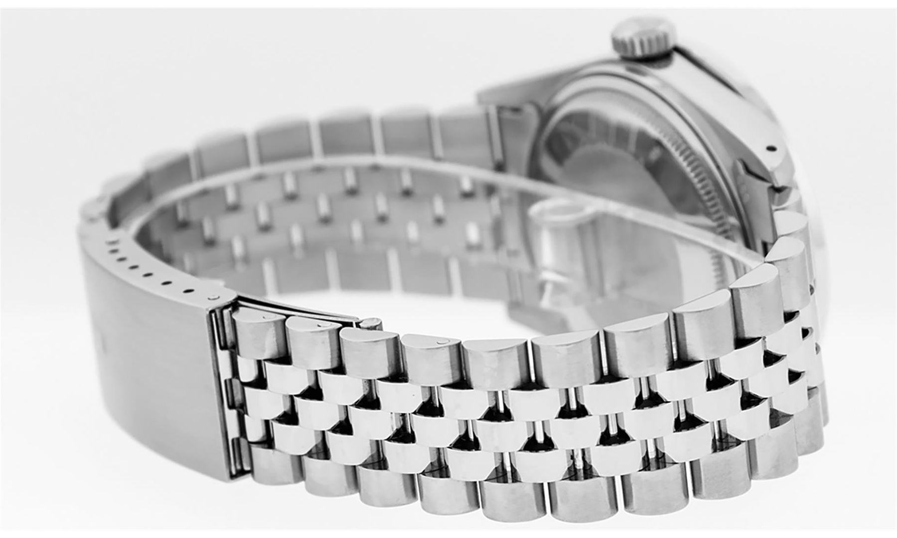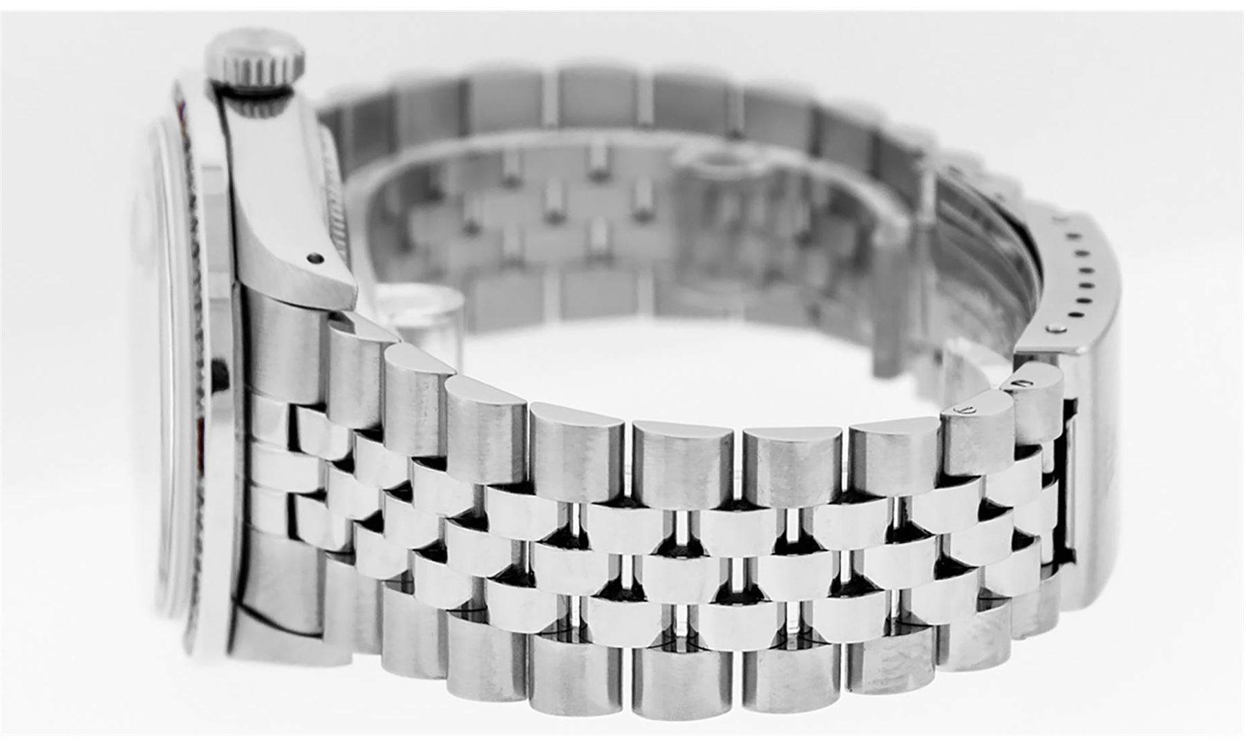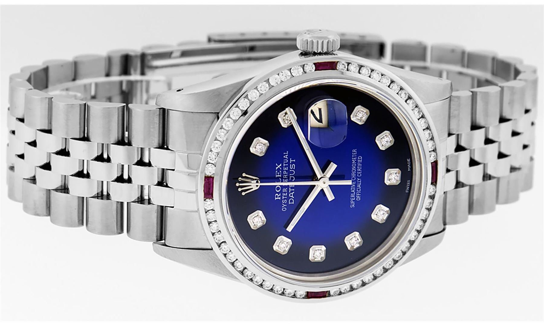 One Mens Stainless Steel Rolex Datejust Polished Bright with Satin Finish, This Watch Has Been Serviced & Electronically Tested, Stainless Steel Case: 36mm, Stainless Steel Crown, Custom Bezel: New 18K White Gold Ruby Channel Set Diamond Bezel, Diamond + Gem Count: 52 Diamonds + 4 Rubies, Total Weight 1.30 Carat, Clarity: SI-VS, Color: G to H. Custom Crystal: New Scratch Resistant Synthetic Sapphire Cyclops Lens. Custom Hands: New Luminescent Hands. Movement: Automatic Winding Movement. Custom Dial: Blue Vignette Diamond Dial, Diamond Count: 10 Diamonds in Dial, Diamond Color: G To H In Color, Clarity: VS2. Date Window: 3 O'Clock Position Date Display, Quickset, Model: Datejust, Condition: G-6 Extra Fine. Bracelet: Stainless Steel Jubilee Band. Bracelet: 7.0 Inch Length, Adjustable. Standard Clasp, With Rolex Logo. This Watch Has Been Serviced Time Tested And Is In Excellent Condition It Is Free Of All Scratches And Dents.