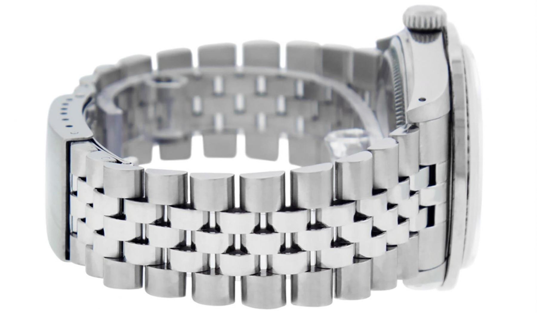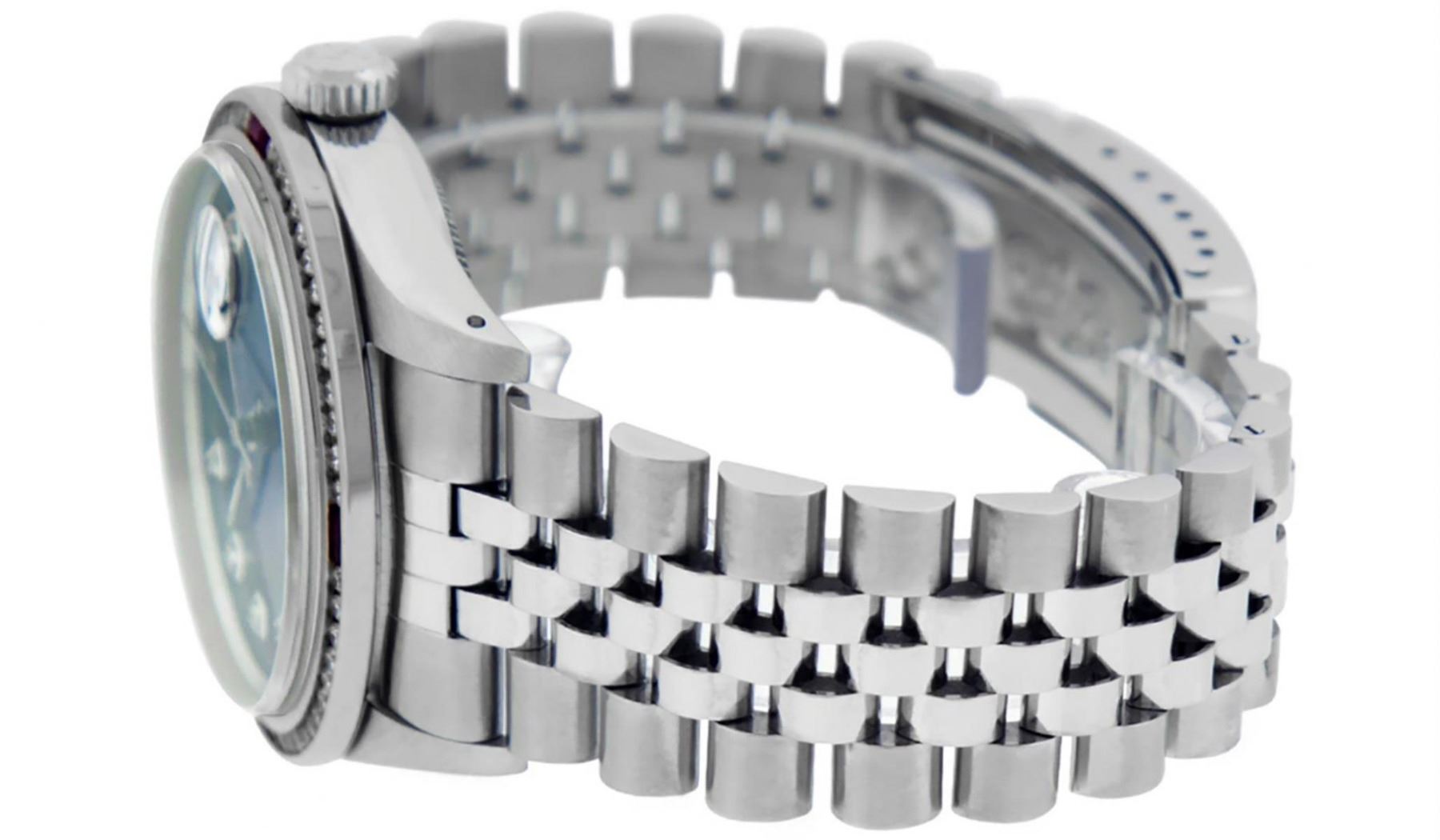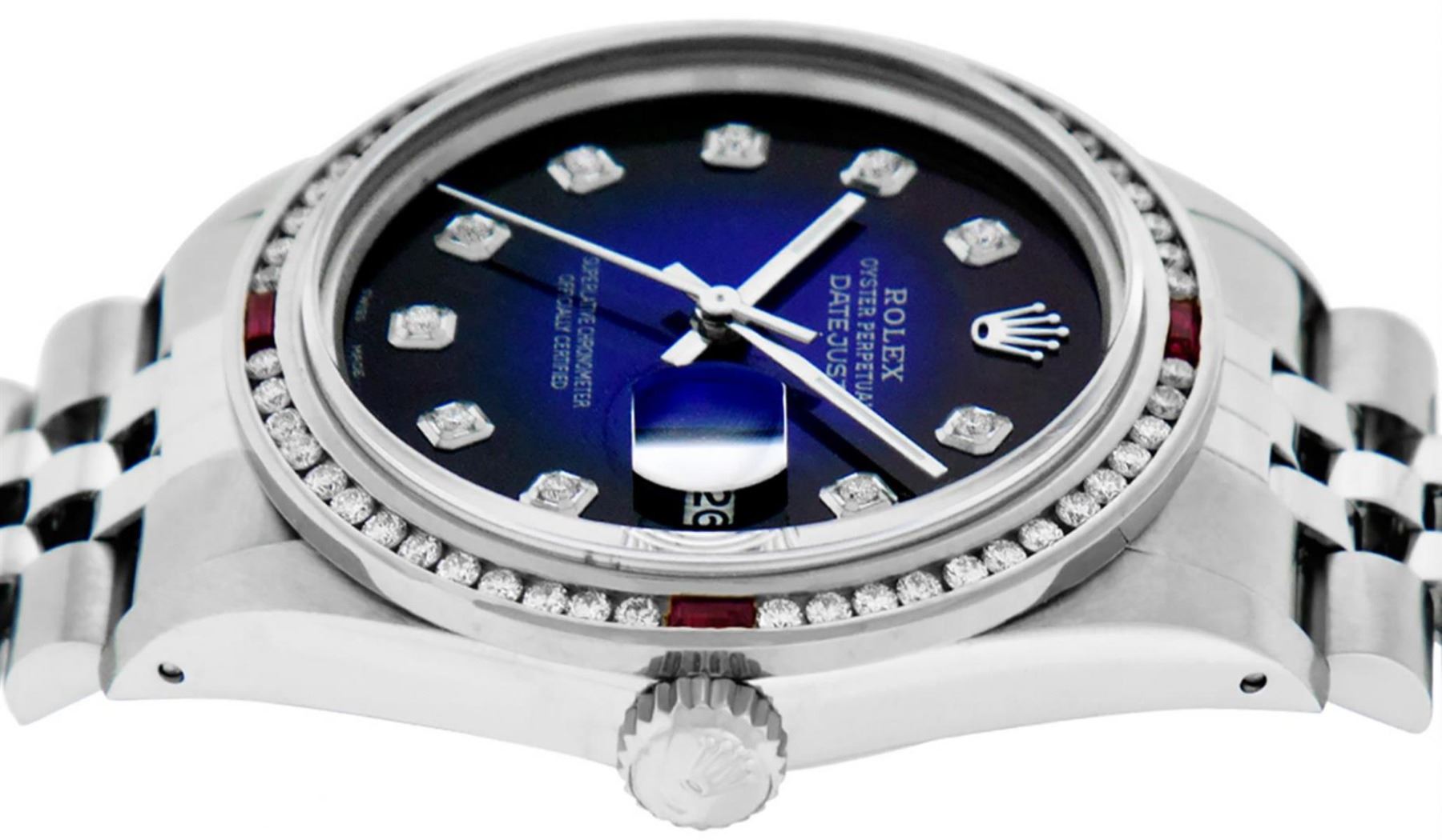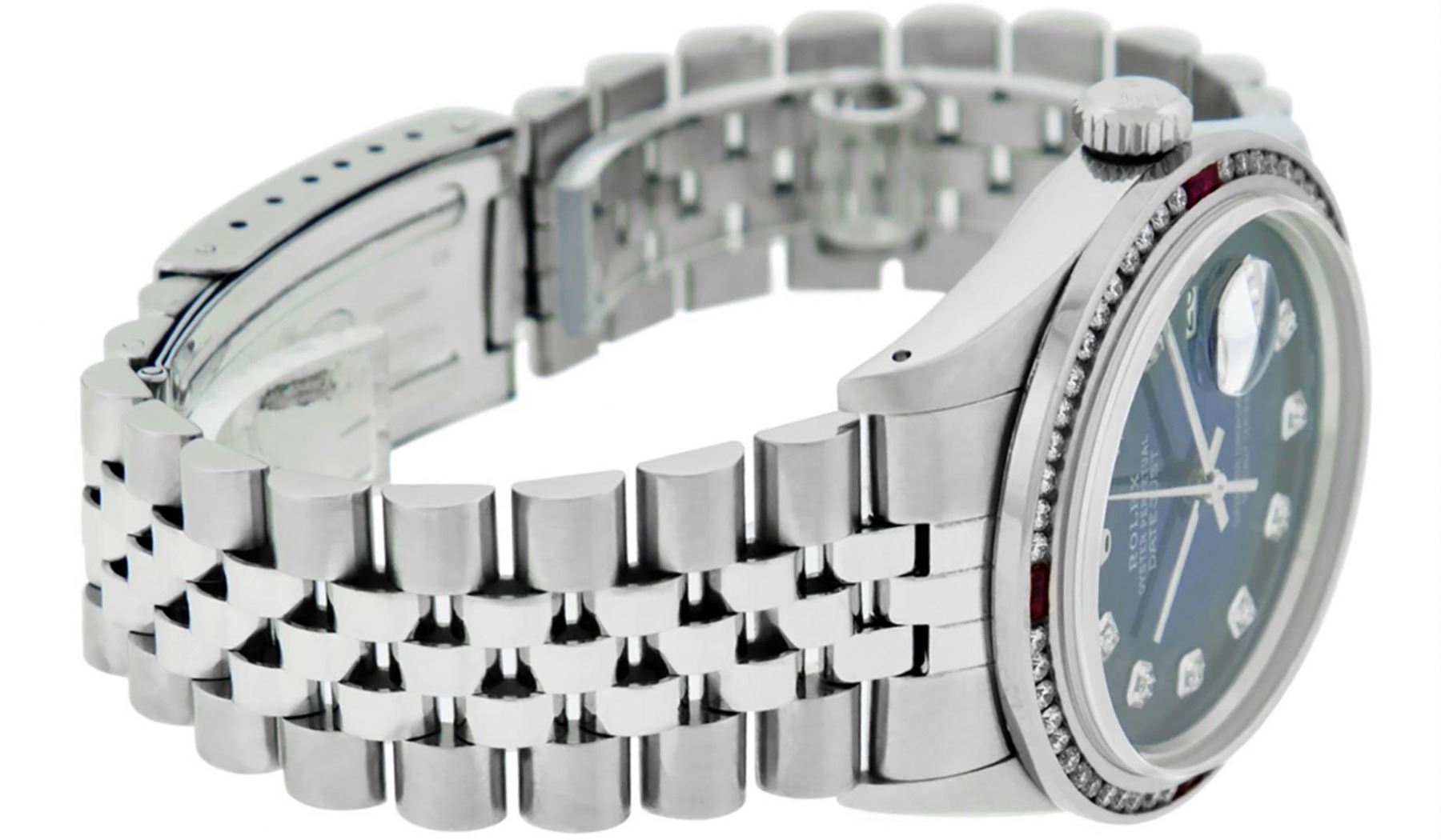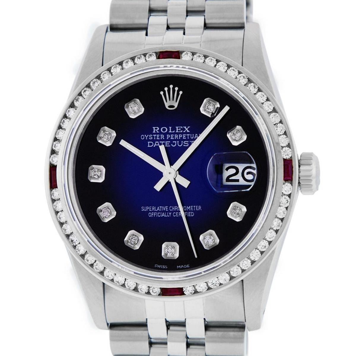 One Mens Stainless Steel Rolex Datejust Polished Bright with Satin Finish, This Watch Has Been Serviced & Electronically Tested, Stainless Steel Case: 36mm, Stainless Steel Crown, Custom Bezel: New 18K White Gold Ruby Channel Set Diamond Bezel, Diamond + Gem Count: 52 Diamonds + 4 Rubies, Total Weight 1.30 Carat, Clarity: SI-VS, Color: G to H. Custom Crystal: New Synthetic Scratch Resistant Sapphire Cyclops Lens. Custom Hands: New Luminescent Hands. Movement: Automatic Winding Movement. Custom Dial: Blue Vignette Diamond Dial, Diamond Count: 10 Diamonds in Dial, Diamond Color: G To H In Color, Clarity: SI-VS. Date Window: 3 O'Clock Position Date Display, Quickset, Model: Datejust, Condition: G-6 Extra Fine. Bracelet: Stainless Steel Jubilee. Bracelet: 7.0 Inch Length, Adjustable. Standard Clasp, With Rolex Logo. This Watch Has Been Serviced Time Tested And Is In Excellent Condition It Is Free Of All Scratches And Dents.