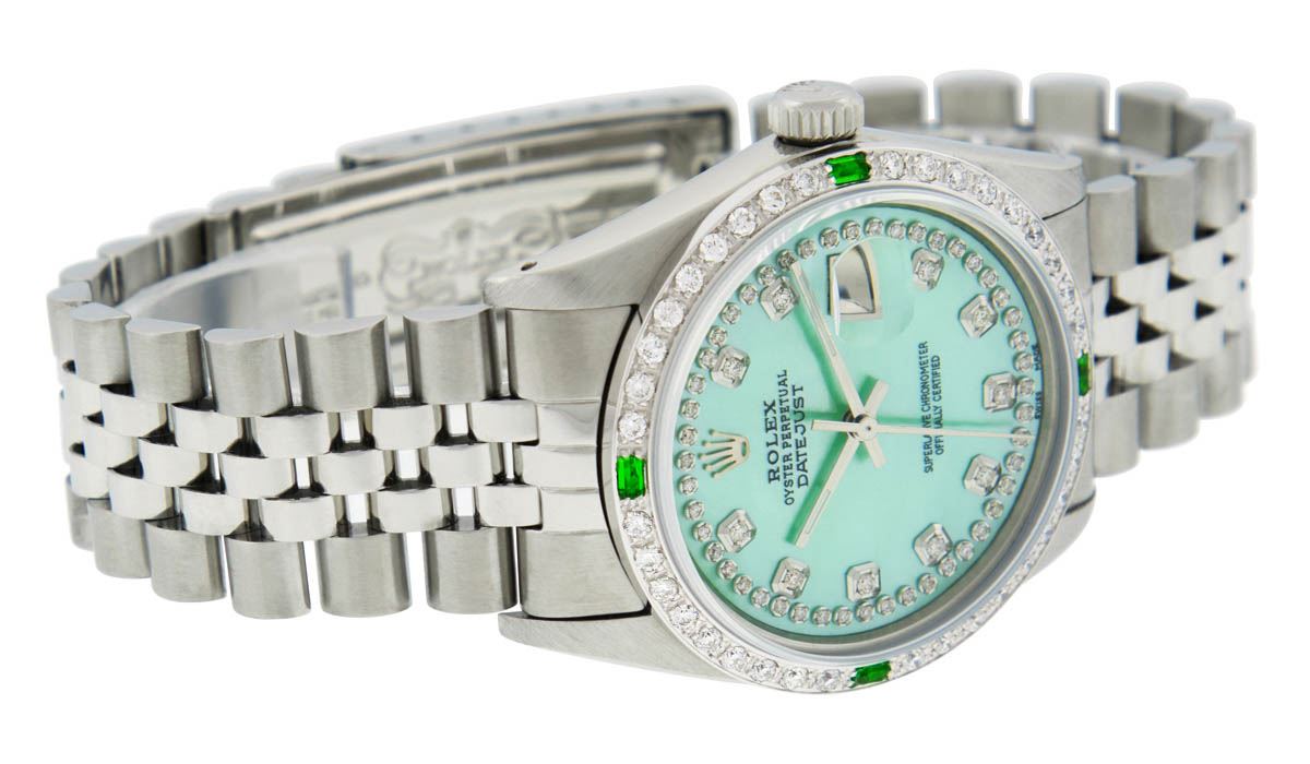 One Mens Rolex Datejust Polished, Serviced & Electronically Tested, Stainless Steel Case:36mm, Stainless Steel Crown, Custom Bezel: 18K White Gold Emerald Beadset Diamond Bezel, Diamond Count: 36 Diamonds + 4 Emeralds. Total Weight 1.0 Carat, Clarity: SI-VS, Color: G to H. Custom Crystal: Synthetic Sapphire Cyclops Lens. Movement: Automatic Winding Movement Caliber 3035. Custom Dial: Green Mother Of Pearl String Diamond Dial, Diamond Count: 58 Diamond In Dial G To H In Color, Clarity: VS2-SI1. Date Window: 3 O'Clock Position Date Display, Quickset, Model: Datejust Condition: G-6 Extra Fine. Bracelet: Stainless Steel Jubilee Band. Bright Polish & Satin Finish. 7.0 Inch Length, Adjustable. Standard Clasp, With Rolex Logo. This Watch Has Been Serviced and Polished And It Is Free Of All Dents And Scratches And Has Been Time Tested.