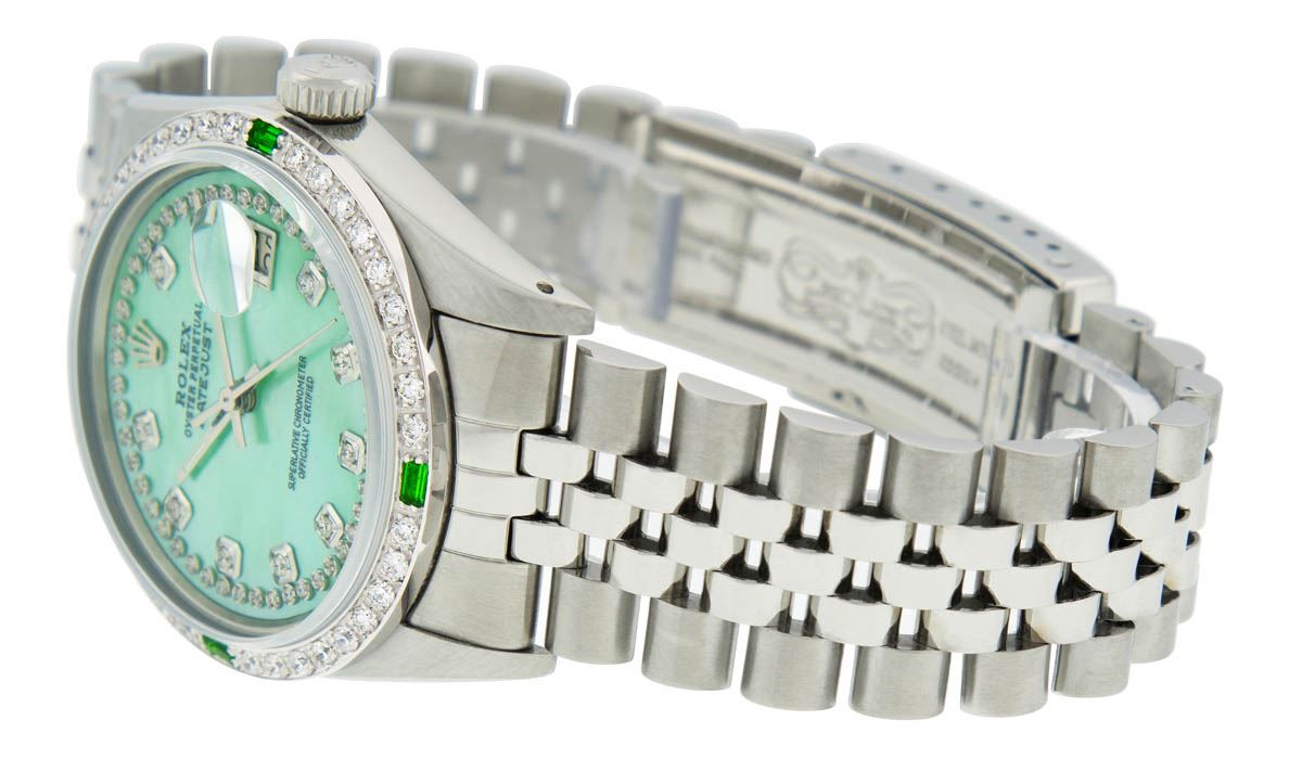 One Mens Rolex Datejust Polished, Serviced & Electronically Tested, Stainless Steel Case:36mm, Stainless Steel Crown, Custom Bezel: 18K White Gold Emerald Beadset Diamond Bezel, Diamond Count: 36 Diamonds + 4 Emeralds. Total Weight 1.0 Carat, Clarity: SI-VS, Color: G to H. Custom Crystal: Synthetic Sapphire Cyclops Lens. Movement: Automatic Winding Movement Caliber 3035. Custom Dial: Green Mother Of Pearl String Diamond Dial, Diamond Count: 58 Diamond In Dial G To H In Color, Clarity: VS2-SI1. Date Window: 3 O'Clock Position Date Display, Quickset, Model: Datejust Condition: G-6 Extra Fine. Bracelet: Stainless Steel Jubilee Band. Bright Polish & Satin Finish. 7.0 Inch Length, Adjustable. Standard Clasp, With Rolex Logo. This Watch Has Been Serviced and Polished And It Is Free Of All Dents And Scratches And Has Been Time Tested.
