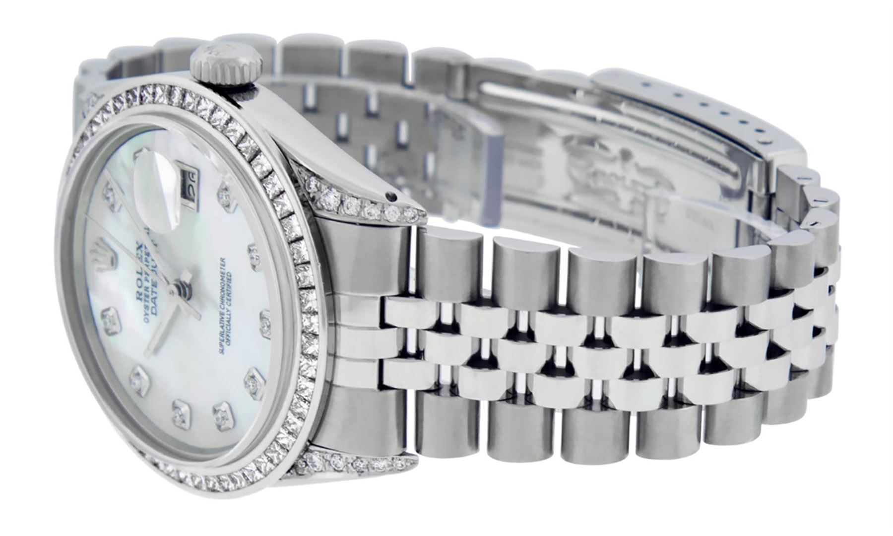One Mens Rolex Datejust Polished Bright with Satin Finish, Serviced & Electronically Tested, Stainless Steel Case: 36mm, Custom Diamond Lugs: 28 Diamonds In Lugs, Color: G to H, Clarity: SI-VS. Stainless Steel Crown, Custom Bezel: New 14K White Gold 2.75 Carat Princess Cut Diamond Bezel, Diamond Count: 53 Diamonds, Total Weight 2.75 Carat, Clarity: SI-VS, Color: G to H. Custom Crystal: New Synthetic Sapphire Cyclops Lens. Custom Hands: New Luminescent Hands. Movement: Automatic Winding Movement Caliber 3035. Custom Dial: Mother Of Pearl Diamond Dial, Diamond Count: 10 Diamonds In Dial, Diamond Color: G To H In Color, Clarity: SI-VS. Date Window: 3 O'Clock Position Date Display, Quickset, Model: Datejust Condition: G-6 Extra Fine. Bracelet: Stainless Steel Jubilee Band. Bright Polish & Satin Finish. 7.0 Inch Length, Adjustable. Standard Clasp, With Rolex Logo. This Watch Has Been Serviced And Polished And Its Free Of All Dents And Scratches. This Watch Comes With A Rolex Box.