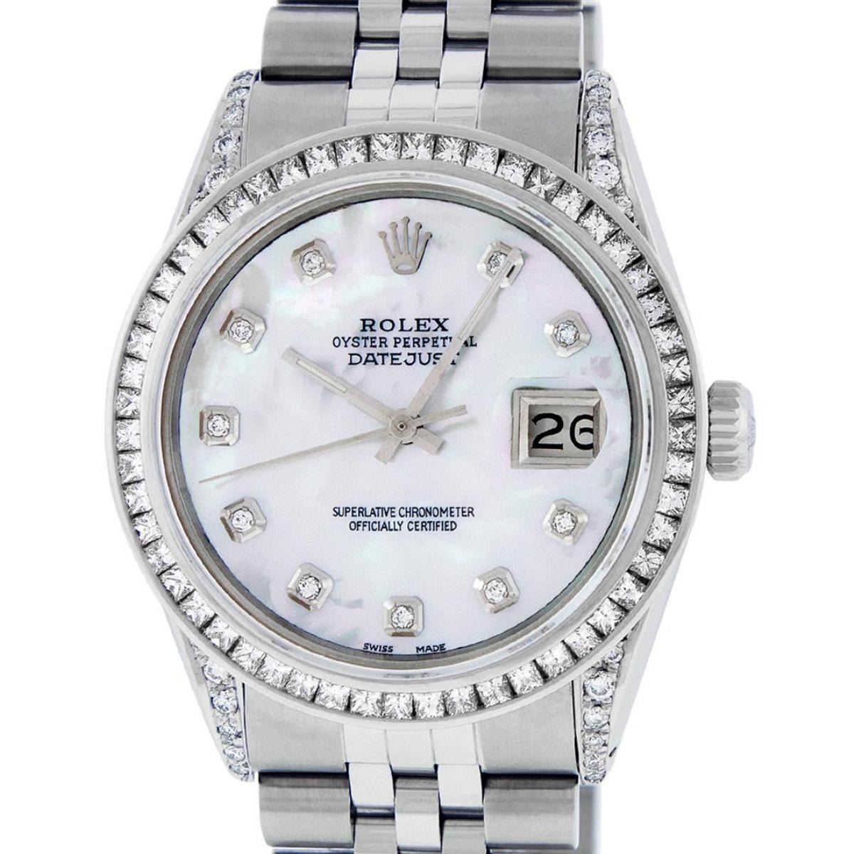 One Mens Rolex Datejust Polished Bright with Satin Finish, Serviced & Electronically Tested, Stainless Steel Case: 36mm, Custom Diamond Lugs: 28 Diamonds In Lugs, Color: G to H, Clarity: SI-VS. Stainless Steel Crown, Custom Bezel: New 14K White Gold 2.75 Carat Princess Cut Diamond Bezel, Diamond Count: 53 Diamonds, Total Weight 2.75 Carat, Clarity: SI-VS, Color: G to H. Custom Crystal: New Synthetic Sapphire Cyclops Lens. Custom Hands: New Luminescent Hands. Movement: Automatic Winding Movement Caliber 3035. Custom Dial: Mother Of Pearl Diamond Dial, Diamond Count: 10 Diamonds In Dial, Diamond Color: G To H In Color, Clarity: SI-VS. Date Window: 3 O'Clock Position Date Display, Quickset, Model: Datejust Condition: G-6 Extra Fine. Bracelet: Stainless Steel Jubilee Band. Bright Polish & Satin Finish. 7.0 Inch Length, Adjustable. Standard Clasp, With Rolex Logo. This Watch Has Been Serviced And Polished And Its Free Of All Dents And Scratches. This Watch Comes With A Rolex Box.