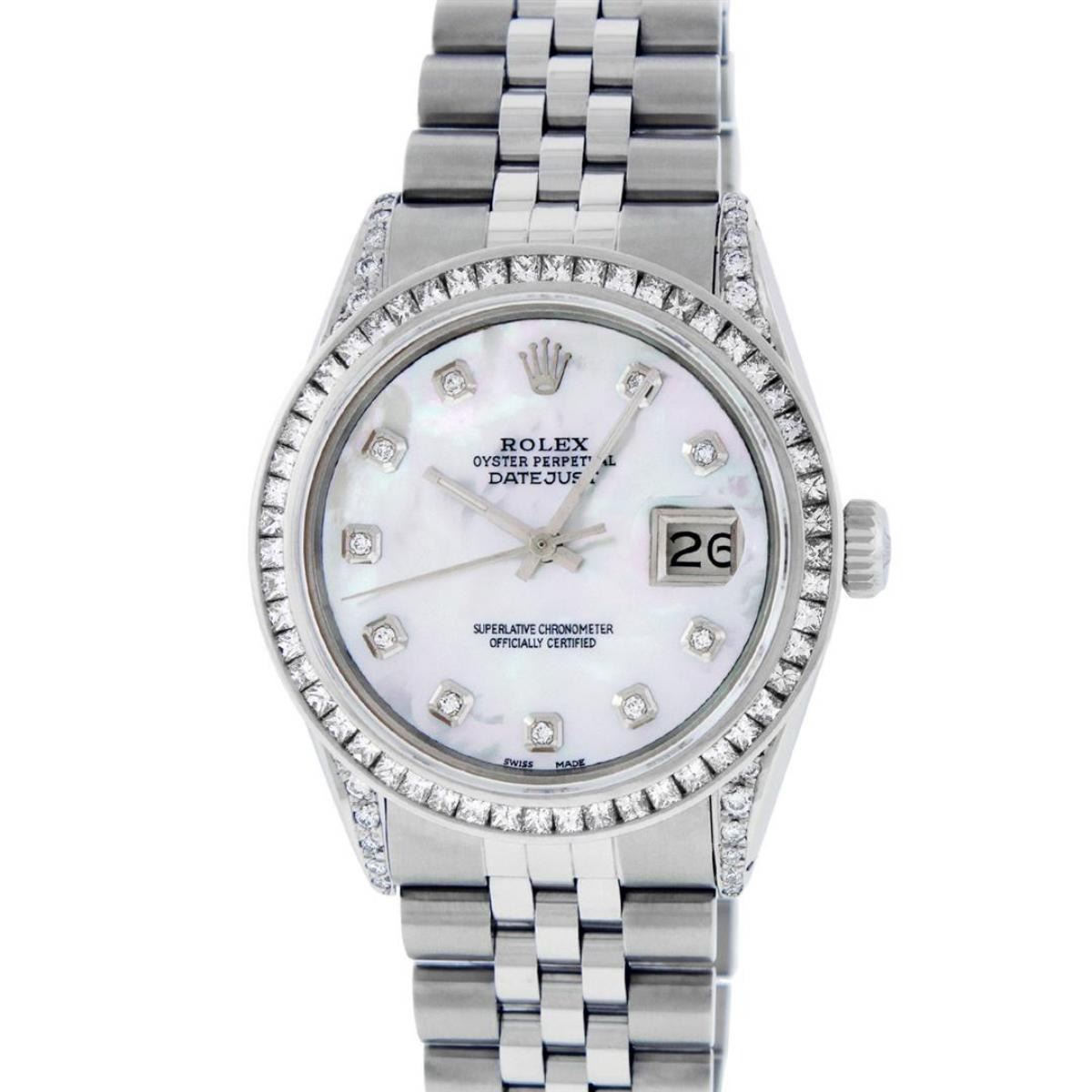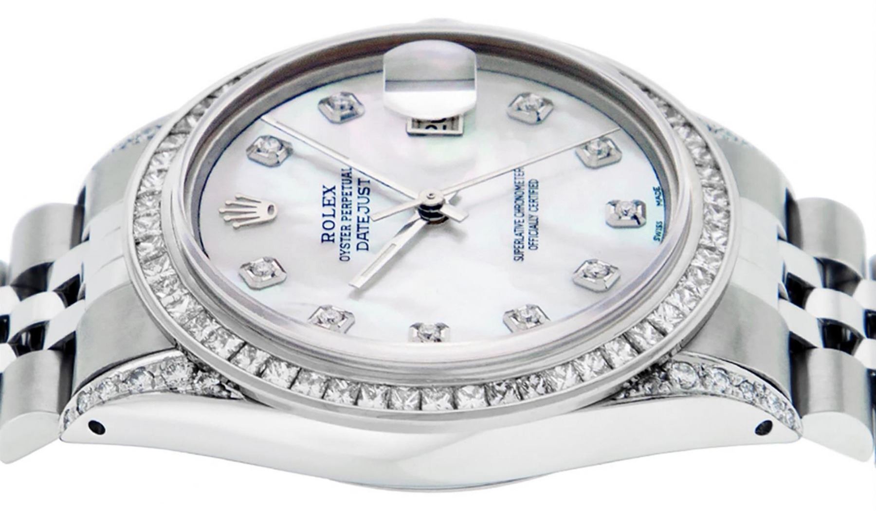 One Mens Rolex Datejust Polished Bright with Satin Finish, Serviced & Electronically Tested, Stainless Steel Case: 36mm, Custom Diamond Lugs: 28 Diamonds In Lugs, Color: G to H, Clarity: SI-VS. Stainless Steel Crown, Custom Bezel: New 14K White Gold 2.75 Carat Princess Cut Diamond Bezel, Diamond Count: 53 Diamonds, Total Weight 2.75 Carat, Clarity: SI-VS, Color: G to H. Custom Crystal: New Synthetic Sapphire Cyclops Lens. Custom Hands: New Luminescent Hands. Movement: Automatic Winding Movement Caliber 3035. Custom Dial: Mother Of Pearl Diamond Dial, Diamond Count: 10 Diamonds In Dial, Diamond Color: G To H In Color, Clarity: SI-VS. Date Window: 3 O'Clock Position Date Display, Quickset, Model: Datejust Condition: G-6 Extra Fine. Bracelet: Stainless Steel Jubilee Band. Bright Polish & Satin Finish. 7.0 Inch Length, Adjustable. Standard Clasp, With Rolex Logo. This Watch Has Been Serviced And Polished And Its Free Of All Dents And Scratches. This Watch Comes With A Rolex Box.