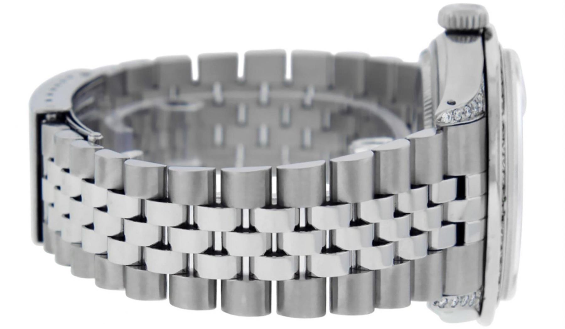 One Mens Rolex Datejust Polished Bright with Satin Finish, Serviced & Electronically Tested, Stainless Steel Case: 36mm, Custom Diamond Lugs: 28 Diamonds In Lugs, Color: G to H, Clarity: SI-VS. Stainless Steel Crown, Custom Bezel: New 14K White Gold 2.75 Carat Princess Cut Diamond Bezel, Diamond Count: 53 Diamonds, Total Weight 2.75 Carat, Clarity: SI-VS, Color: G to H. Custom Crystal: New Synthetic Sapphire Cyclops Lens. Custom Hands: New Luminescent Hands. Movement: Automatic Winding Movement Caliber 3035. Custom Dial: Mother Of Pearl Diamond Dial, Diamond Count: 10 Diamonds In Dial, Diamond Color: G To H In Color, Clarity: SI-VS. Date Window: 3 O'Clock Position Date Display, Quickset, Model: Datejust Condition: G-6 Extra Fine. Bracelet: Stainless Steel Jubilee Band. Bright Polish & Satin Finish. 7.0 Inch Length, Adjustable. Standard Clasp, With Rolex Logo. This Watch Has Been Serviced And Polished And Its Free Of All Dents And Scratches. This Watch Comes With A Rolex Box.