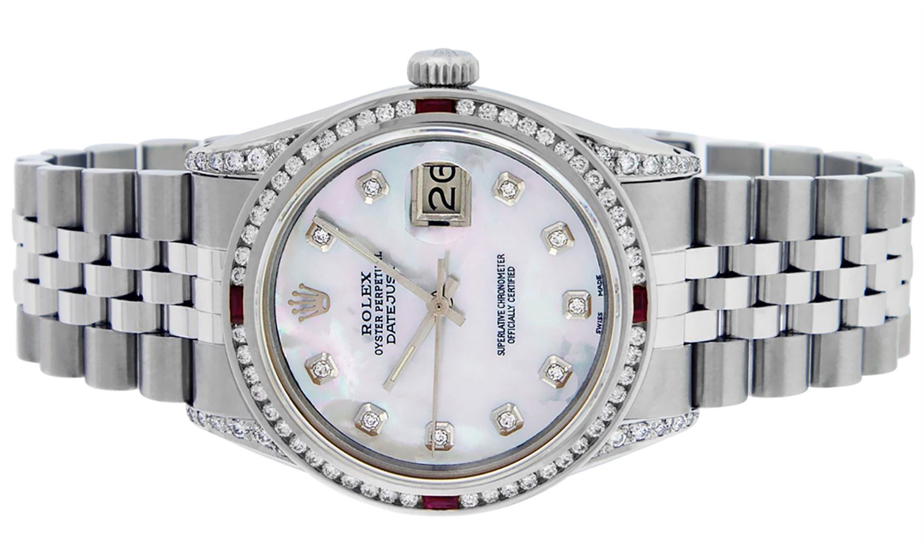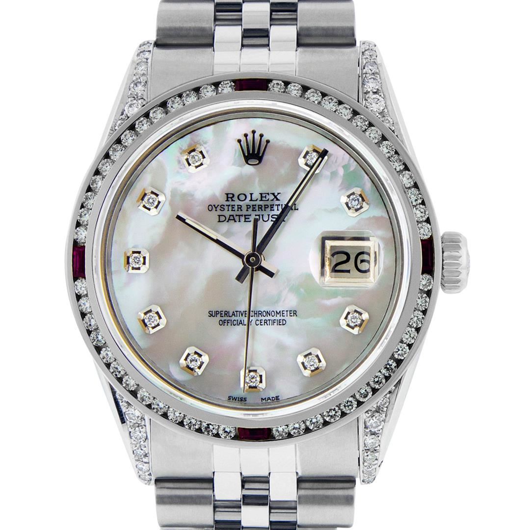 One Mens Rolex Datejust Polished Bright with Satin Finish, Serviced & Electronically Tested, Stainless Steel Case: 36mm, Custom Diamond Lugs: 28 Diamonds In Lugs, Color: G to H, Clarity: SI-VS. Stainless Steel Crown, Custom Bezel: New 18K White Gold Ruby Channel Set Diamond Bezel, Diamond + Gem Count: 52 Diamonds + 4 Rubies, Total Weight 1.30 Carat, Clarity: SI-VS, Color: G to H. Custom Crystal: New Synthetic Sapphire Cyclops Lens. Custom Hands: New Luminescent Hands. Movement: Automatic Winding Movement Caliber 3035. Custom Dial: Mother Of Pearl Diamond Dial, Diamond Count: 10 Diamonds In Dial, Diamond Color: G To H In Color, Clarity: SI-VS. Date Window: 3 O'Clock Position Date Display, Quickset, Model: Datejust Condition: G-6 Extra Fine. Bracelet: Stainless Steel Jubilee Band. Bright Polish & Satin Finish. 7.0 Inch Length, Adjustable. Standard Clasp, With Rolex Logo. This Watch Has Been Serviced And Polished And Its Free Of All Dents And Scratches.