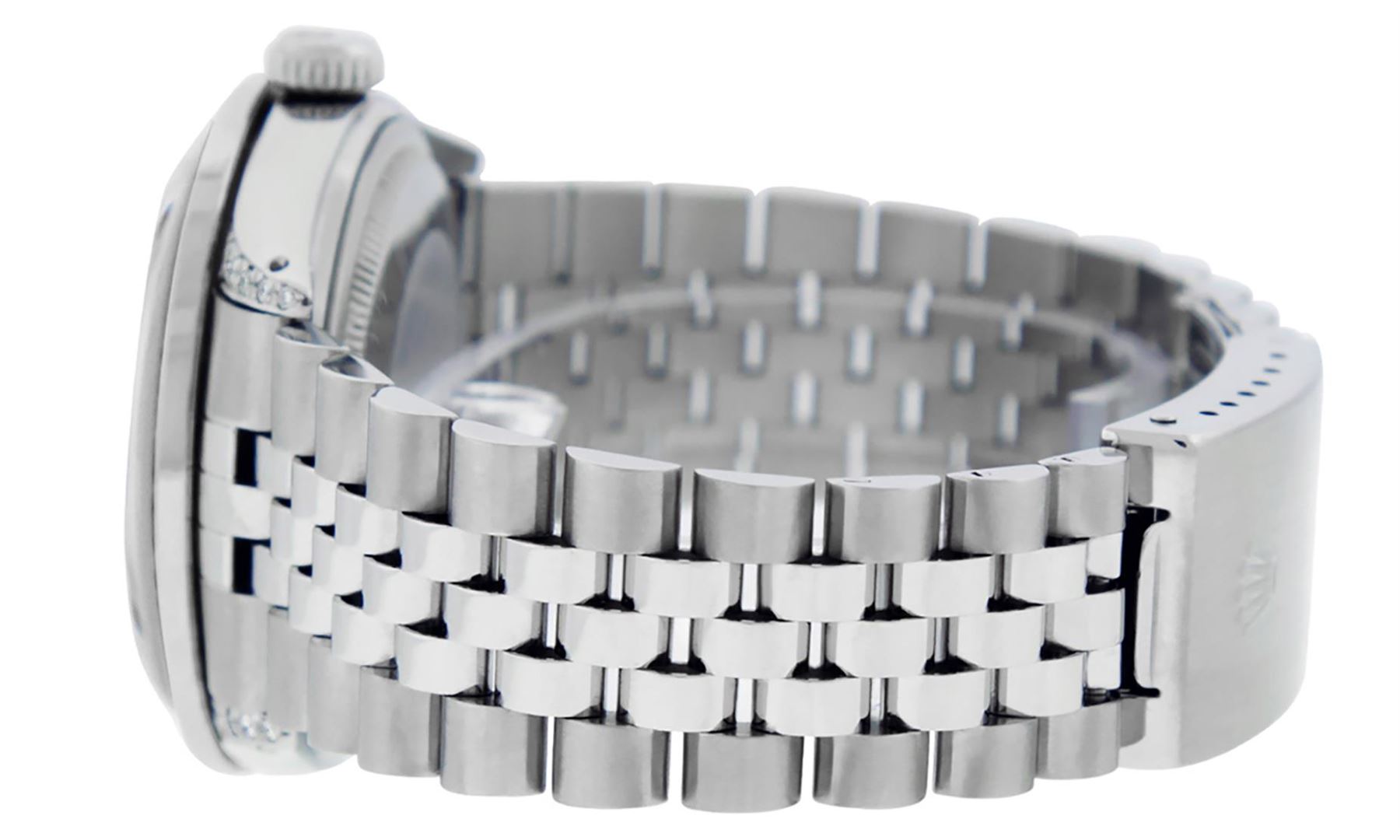 One Mens Rolex Datejust Polished Bright with Satin Finish, Serviced & Electronically Tested, Stainless Steel Case: 36mm, Custom Diamond Lugs: 28 Diamonds In Lugs, Color: G to H, Clarity: SI-VS. Stainless Steel Crown, Custom Bezel: New 18K White Gold Ruby Channel Set Diamond Bezel, Diamond + Gem Count: 52 Diamonds + 4 Rubies, Total Weight 1.30 Carat, Clarity: SI-VS, Color: G to H. Custom Crystal: New Scratch Resistant Synthetic Sapphire Cyclops Lens. Custom Hands: New Luminescent Hands. Movement: Automatic Winding Movement. Custom Dial: Mother Of Pearl Diamond Dial, Diamond Count: 10 Diamonds In Dial, Diamond Color: G To H In Color, Clarity: SI-VS. Date Window: 3 O'Clock Position Date Display, Quickset, Model: Datejust Condition: G-6 Extra Fine. Bracelet: Stainless Steel Jubilee Band. Bright Polish & Satin Finish. 7.0 Inch Length, Adjustable. Standard Clasp, With Rolex Logo. This Watch Has Been Serviced And Polished And Its Free Of All Dents And Scratches.