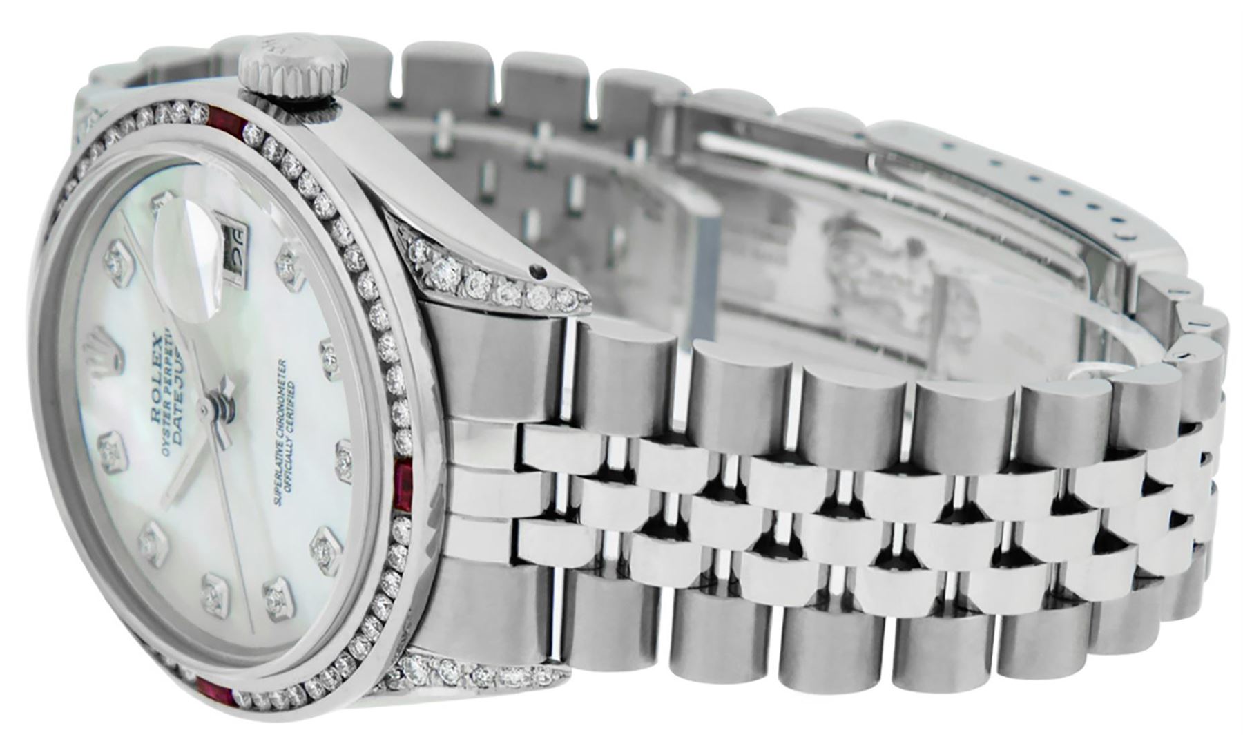 One Mens Rolex Datejust Polished Bright with Satin Finish, Serviced & Electronically Tested, Stainless Steel Case: 36mm, Custom Diamond Lugs: 28 Diamonds In Lugs, Color: G to H, Clarity: SI-VS. Stainless Steel Crown, Custom Bezel: New 18K White Gold Ruby Channel Set Diamond Bezel, Diamond + Gem Count: 52 Diamonds + 4 Rubies, Total Weight 1.30 Carat, Clarity: SI-VS, Color: G to H. Custom Crystal: New Scratch Resistant Synthetic Sapphire Cyclops Lens. Custom Hands: New Luminescent Hands. Movement: Automatic Winding Movement. Custom Dial: Mother Of Pearl Diamond Dial, Diamond Count: 10 Diamonds In Dial, Diamond Color: G To H In Color, Clarity: SI-VS. Date Window: 3 O'Clock Position Date Display, Quickset, Model: Datejust Condition: G-6 Extra Fine. Bracelet: Stainless Steel Jubilee Band. Bright Polish & Satin Finish. 7.0 Inch Length, Adjustable. Standard Clasp, With Rolex Logo. This Watch Has Been Serviced And Polished And Its Free Of All Dents And Scratches.
