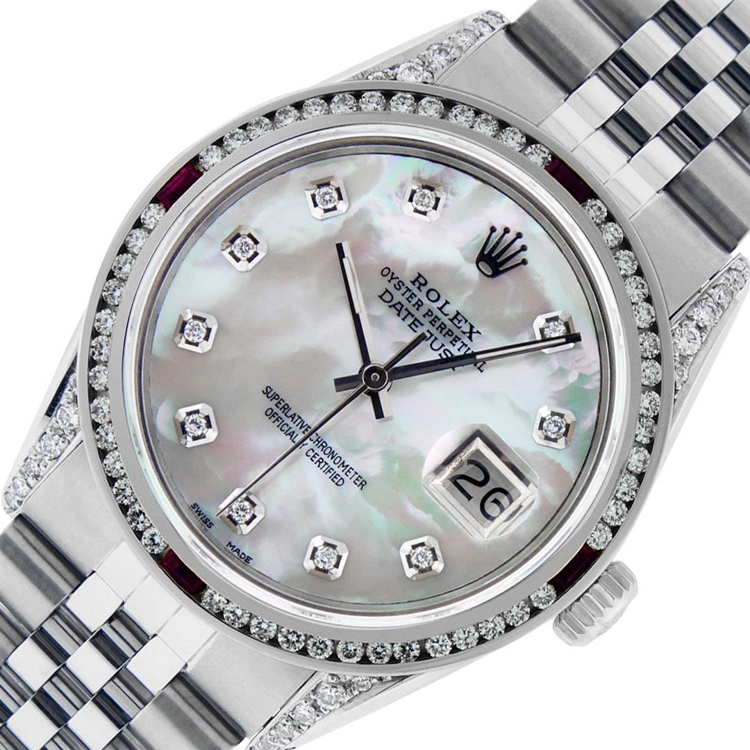One Mens Rolex Datejust Polished Bright with Satin Finish, Serviced & Electronically Tested, Stainless Steel Case: 36mm, Custom Diamond Lugs: 28 Diamonds In Lugs, Color: G to H, Clarity: SI-VS. Stainless Steel Crown, Custom Bezel: New 18K White Gold Ruby Channel Set Diamond Bezel, Diamond + Gem Count: 52 Diamonds + 4 Rubies, Total Weight 1.30 Carat, Clarity: SI-VS, Color: G to H. Custom Crystal: New Scratch Resistant Synthetic Sapphire Cyclops Lens. Custom Hands: New Luminescent Hands. Movement: Automatic Winding Movement. Custom Dial: Mother Of Pearl Diamond Dial, Diamond Count: 10 Diamonds In Dial, Diamond Color: G To H In Color, Clarity: SI-VS. Date Window: 3 O'Clock Position Date Display, Quickset, Model: Datejust Condition: G-6 Extra Fine. Bracelet: Stainless Steel Jubilee Band. Bright Polish & Satin Finish. 7.0 Inch Length, Adjustable. Standard Clasp, With Rolex Logo. This Watch Has Been Serviced And Polished And Its Free Of All Dents And Scratches.
