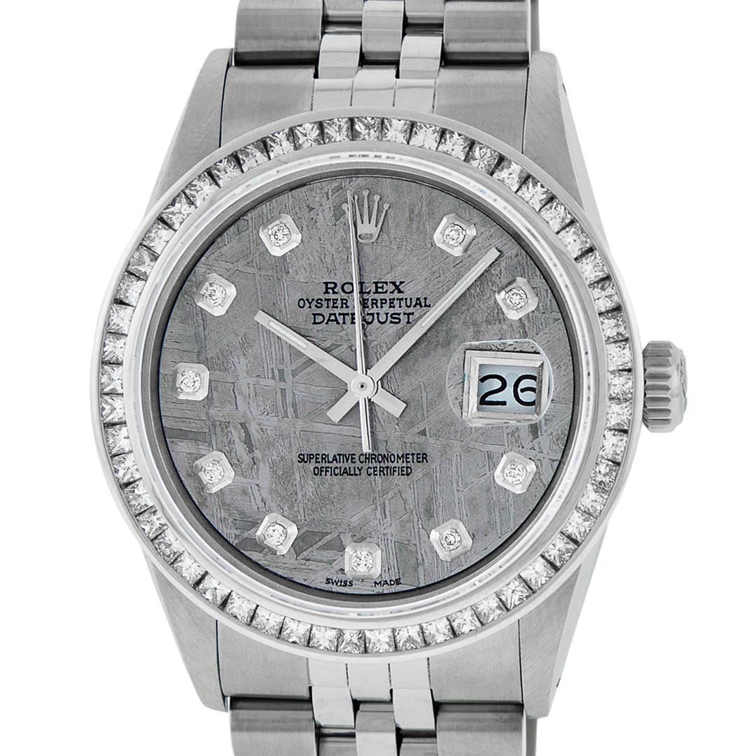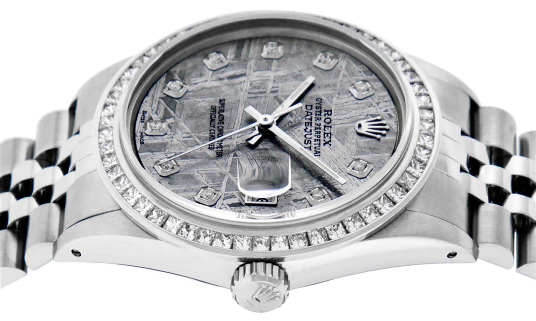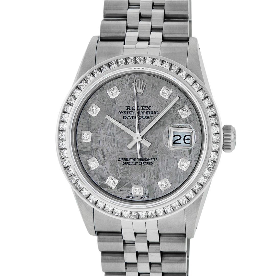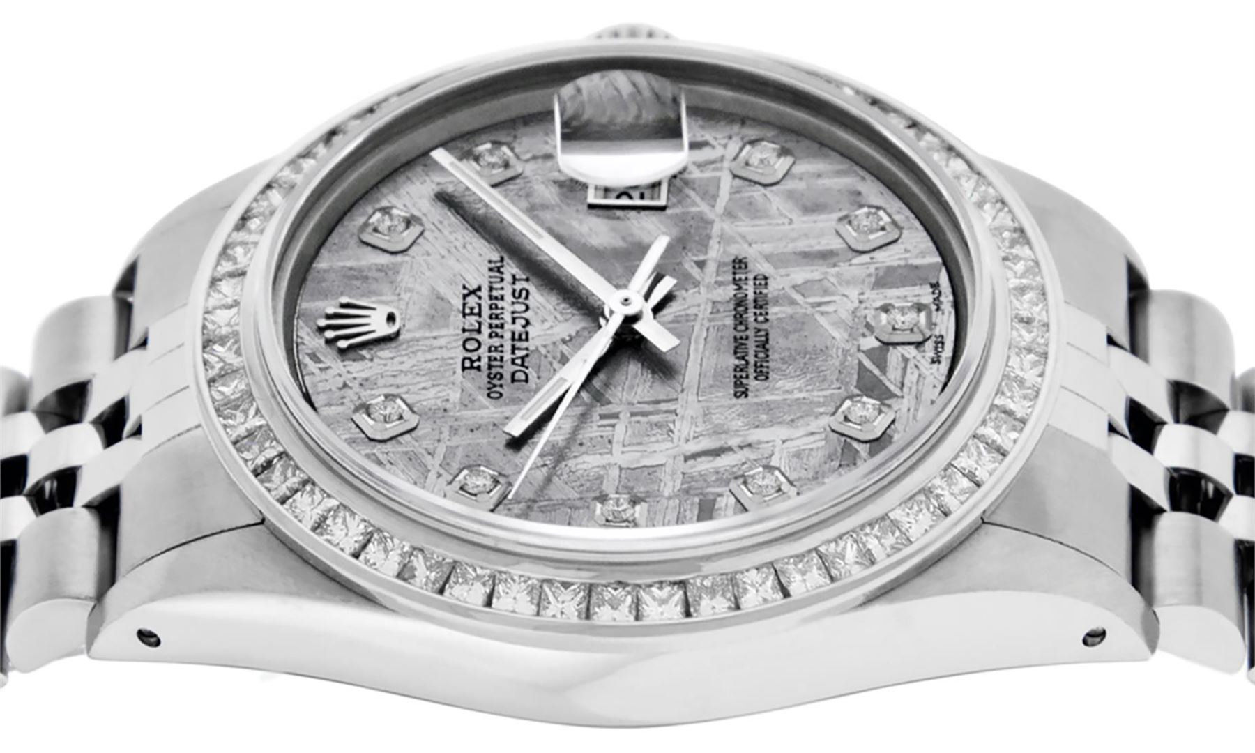 One Mens Stainless Steel Rolex Datejust Polished Bright with Satin Finish, Fully Serviced & Electronically Tested, Stainless Steel Case: 36mm, Stainless Steel Crown, Custom Bezel: New 14K White Gold 2.75 Carat Princess Cut Diamond Bezel, Diamond Count: 53 Diamonds, Total Weight 2.75 Carat, Clarity: SI-VS, Color: G to H. Custom Crystal: New Synthetic Sapphire Cyclops Lens. Custom Hands: New Luminecent Hands. Movement: Automatic Winding Movement Caliber 3035. Custom Dial: Meteorite Diamond Dial, 10 Diamonds in Dial, G To H In Color, Clarity: SI-VS. Date Window: 3 O'Clock Position Date Display, Quickset, Model: Datejust 36mm, Condition: G-6 Extra Fine. Bracelet: Rolex Stainless Steel Jubilee Band. Bright Polish & Satin Finish. 7.0 Inch Length, Adjustable. Standard Clasp, With Rolex Logo. Watch Has Been Serviced And Polished It Is Free Of All Scratches And Dents.