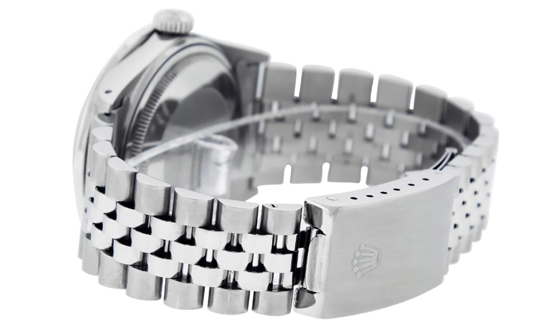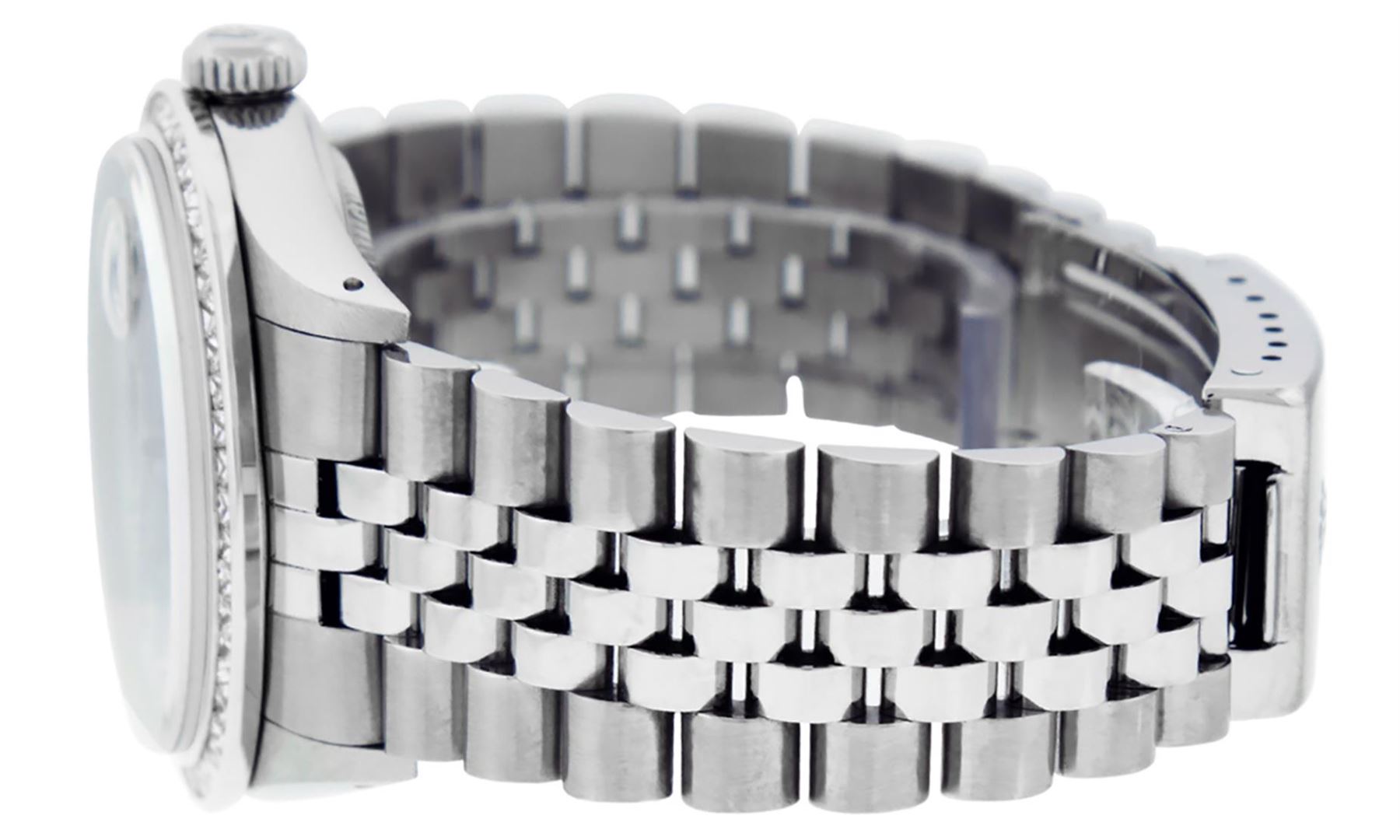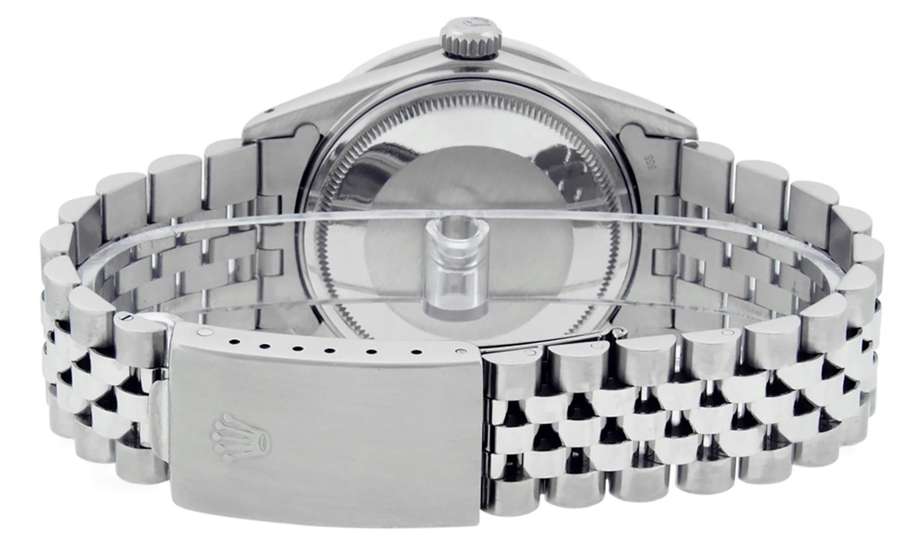 One Mens Stainless Steel Rolex Datejust Polished Bright with Satin Finish, Fully Serviced & Electronically Tested, Stainless Steel Case: 36mm, Stainless Steel Crown, Custom Bezel: New 14K White Gold 2.75 Carat Princess Cut Diamond Bezel, Diamond Count: 53 Diamonds, Total Weight 2.75 Carat, Clarity: SI-VS, Color: G to H. Custom Crystal: New Synthetic Sapphire Cyclops Lens. Custom Hands: New Luminecent Hands. Movement: Automatic Winding Movement Caliber 3035. Custom Dial: Meteorite Diamond Dial, 10 Diamonds in Dial, G To H In Color, Clarity: SI-VS. Date Window: 3 O'Clock Position Date Display, Quickset, Model: Datejust 36mm, Condition: G-6 Extra Fine. Bracelet: Rolex Stainless Steel Jubilee Band. Bright Polish & Satin Finish. 7.0 Inch Length, Adjustable. Standard Clasp, With Rolex Logo. Watch Has Been Serviced And Polished It Is Free Of All Scratches And Dents.