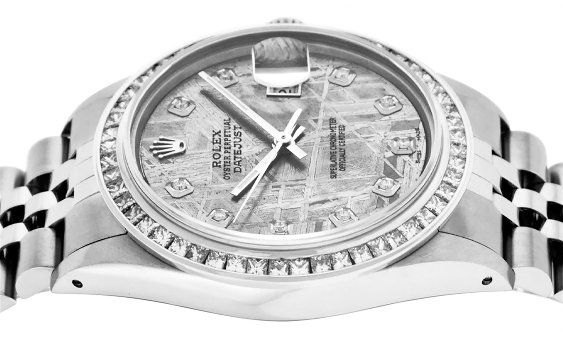 One Mens Stainless Steel Rolex Datejust Polished Bright with Satin Finish, Fully Serviced & Electronically Tested, Stainless Steel Case: 36mm, Stainless Steel Crown, Custom Bezel: New 14K White Gold 2.75 Carat Princess Cut Diamond Bezel, Diamond Count: 53 Diamonds, Total Weight 2.75 Carat, Clarity: SI-VS, Color: G to H. Custom Crystal: New Scratch Resistant Synthetic Sapphire Cyclops Lens. Custom Hands: New Luminecent Hands. Movement: Automatic Winding Movement Caliber 3035. Custom Dial: Meteorite Diamond Dial, 10 Diamonds in Dial, G To H In Color, Clarity: SI-VS. Date Window: 3 O'Clock Position Date Display, Quickset, Model: Datejust 36mm, Condition: G-6 Extra Fine. Bracelet: Rolex Stainless Steel Jubilee Band. Bright Polish & Satin Finish. 7.0 Inch Length, Adjustable. Standard Clasp, With Rolex Logo. Watch Has Been Serviced And Polished It Is Free Of All Scratches And Dents.