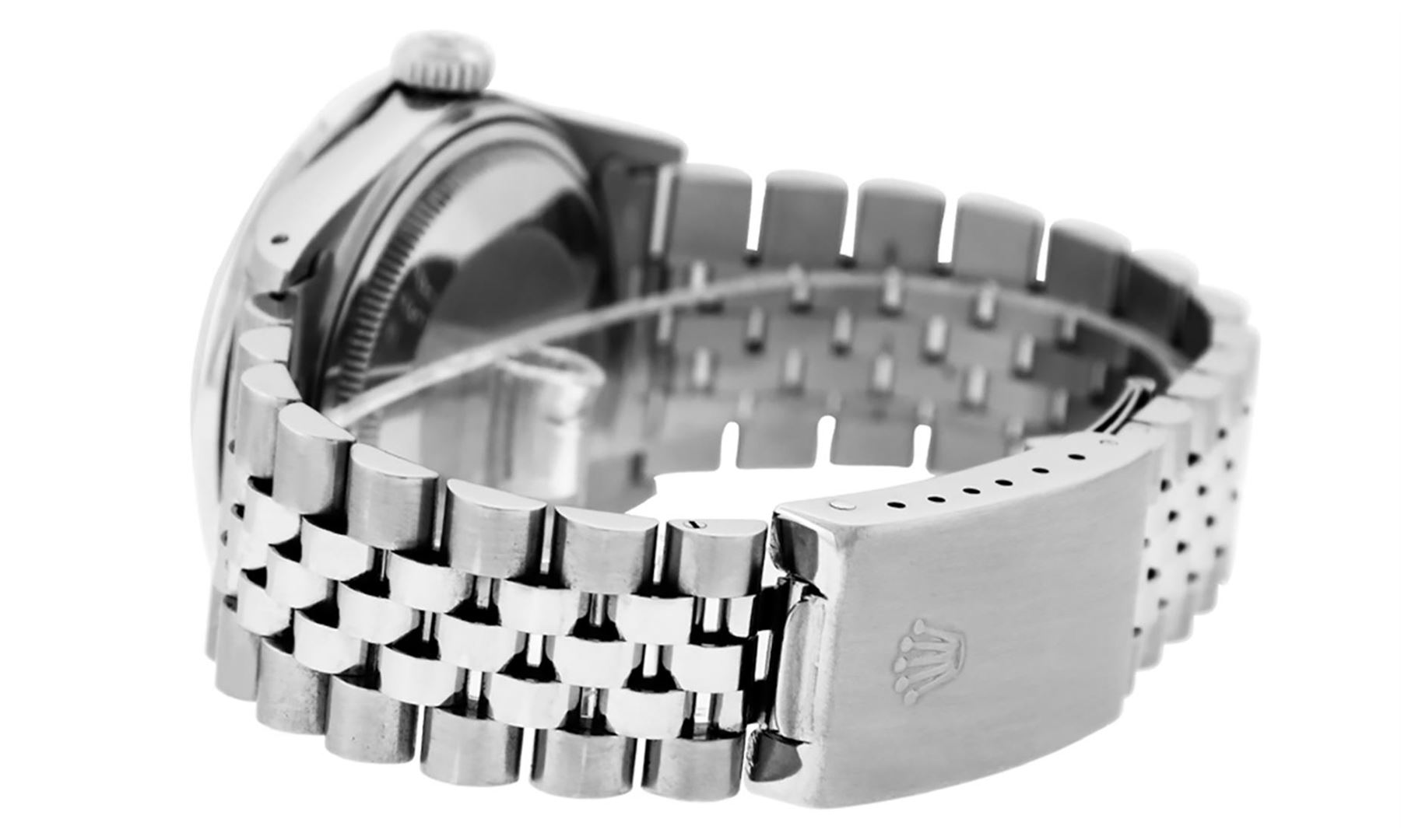 One Mens Stainless Steel Rolex Datejust Polished Bright with Satin Finish, Fully Serviced & Electronically Tested, Stainless Steel Case: 36mm, Stainless Steel Crown, Custom Bezel: New 14K White Gold 2.75 Carat Princess Cut Diamond Bezel, Diamond Count: 53 Diamonds, Total Weight 2.75 Carat, Clarity: SI-VS, Color: G to H. Custom Crystal: New Scratch Resistant Synthetic Sapphire Cyclops Lens. Custom Hands: New Luminecent Hands. Movement: Automatic Winding Movement Caliber 3035. Custom Dial: Meteorite Diamond Dial, 10 Diamonds in Dial, G To H In Color, Clarity: SI-VS. Date Window: 3 O'Clock Position Date Display, Quickset, Model: Datejust 36mm, Condition: G-6 Extra Fine. Bracelet: Rolex Stainless Steel Jubilee Band. Bright Polish & Satin Finish. 7.0 Inch Length, Adjustable. Standard Clasp, With Rolex Logo. Watch Has Been Serviced And Polished It Is Free Of All Scratches And Dents.