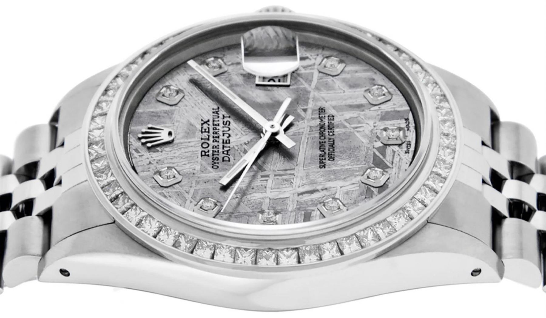One Mens Stainless Steel Rolex Datejust Polished Bright with Satin Finish, Fully Serviced & Electronically Tested, Stainless Steel Case: 36mm, Stainless Steel Crown, Custom Bezel: New 14K White Gold 2.75 Carat Princess Cut Diamond Bezel, Diamond Count: 53 Diamonds, Total Weight 2.75 Carat, Clarity: SI-VS, Color: G to H. Custom Crystal: New Synthetic Sapphire Cyclops Lens. Custom Hands: New Luminecent Hands. Movement: Automatic Winding Movement Caliber 3035. Custom Dial: Meteorite Diamond Dial, 10 Diamonds in Dial, G To H In Color, Clarity: SI-VS. Date Window: 3 O'Clock Position Date Display, Quickset, Model: Datejust 36mm, Condition: G-6 Extra Fine. Bracelet: Rolex Stainless Steel Jubilee Band. Bright Polish & Satin Finish. 7.0 Inch Length, Adjustable. Standard Clasp, With Rolex Logo. Watch Has Been Serviced And Polished It Is Free Of All Scratches And Dents.