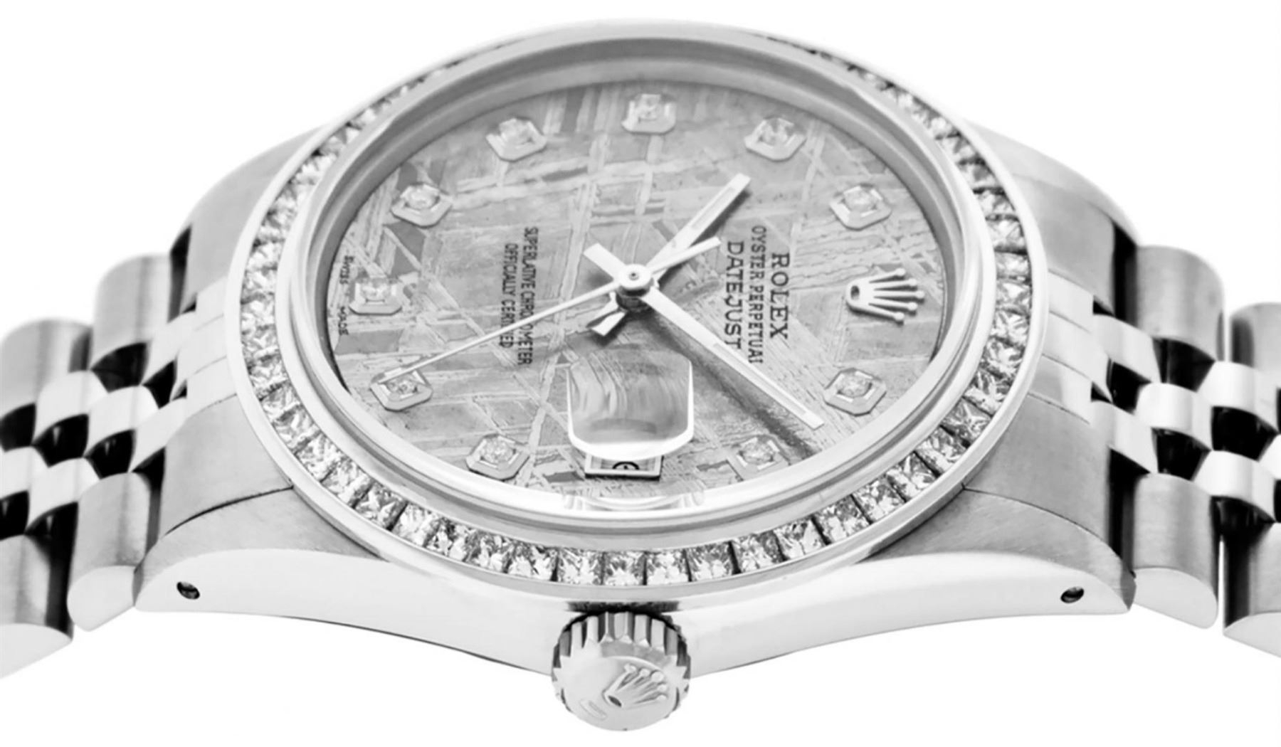 One Mens Stainless Steel Rolex Datejust Polished Bright with Satin Finish, Fully Serviced & Electronically Tested, Stainless Steel Case: 36mm, Stainless Steel Crown, Custom Bezel: New 14K White Gold 2.75 Carat Princess Cut Diamond Bezel, Diamond Count: 53 Diamonds, Total Weight 2.75 Carat, Clarity: SI-VS, Color: G to H. Custom Crystal: New Scratch Resistant Synthetic Sapphire Cyclops Lens. Custom Hands: New Luminecent Hands. Movement: Automatic Winding Movement Caliber 3035. Custom Dial: Meteorite Diamond Dial, 10 Diamonds in Dial, G To H In Color, Clarity: SI-VS. Date Window: 3 O'Clock Position Date Display, Quickset, Model: Datejust 36mm, Condition: G-6 Extra Fine. Bracelet: Rolex Stainless Steel Jubilee Band. Bright Polish & Satin Finish. 7.0 Inch Length, Adjustable. Standard Clasp, With Rolex Logo. Watch Has Been Serviced And Polished It Is Free Of All Scratches And Dents.