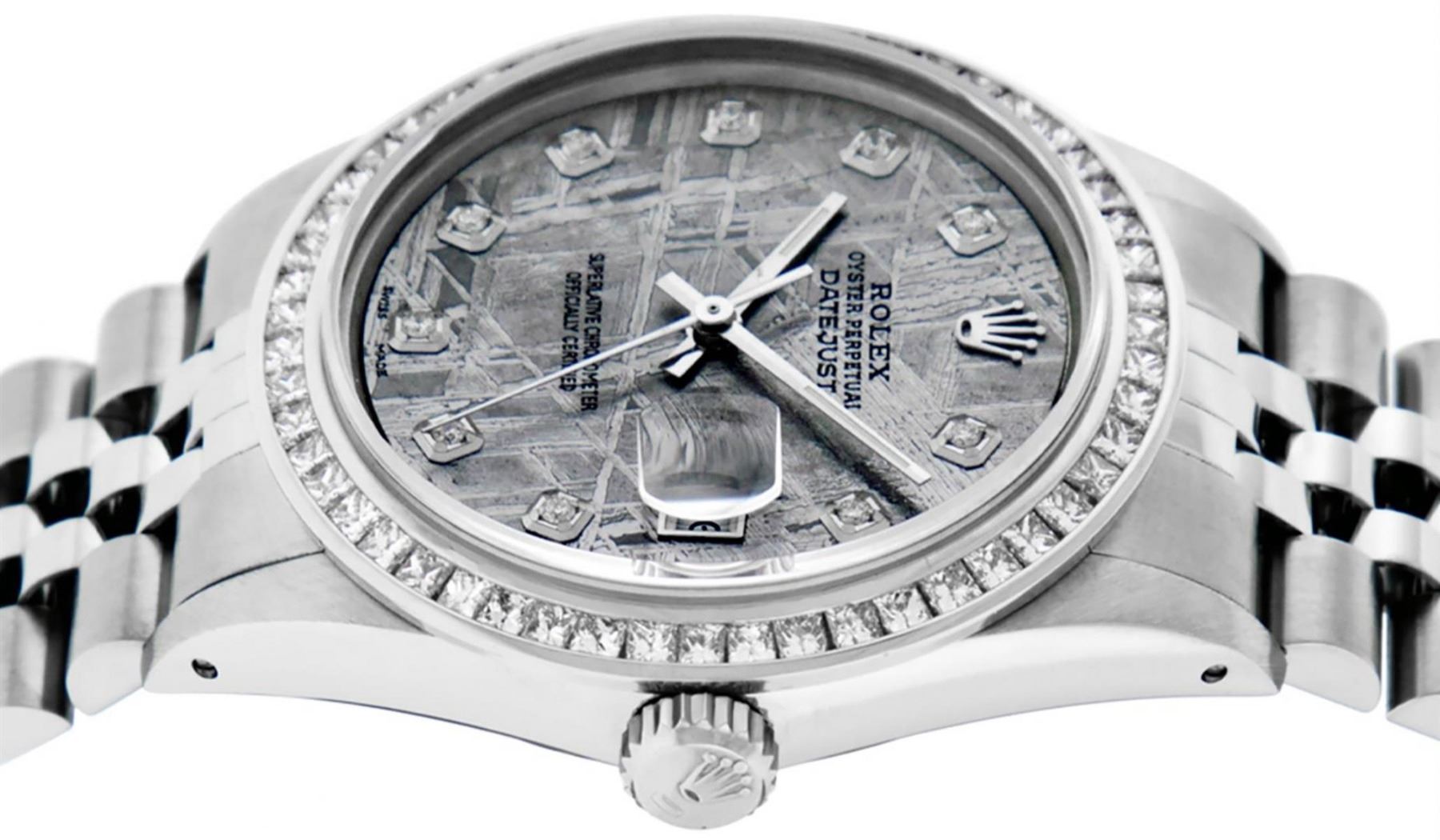 One Mens Stainless Steel Rolex Datejust Polished Bright with Satin Finish, Fully Serviced & Electronically Tested, Stainless Steel Case: 36mm, Stainless Steel Crown, Custom Bezel: New 14K White Gold 2.75 Carat Princess Cut Diamond Bezel, Diamond Count: 53 Diamonds, Total Weight 2.75 Carat, Clarity: SI-VS, Color: G to H. Custom Crystal: New Synthetic Sapphire Cyclops Lens. Custom Hands: New Luminecent Hands. Movement: Automatic Winding Movement. Custom Dial: Meteorite Diamond Dial, 10 Diamonds in Dial, G To H In Color, Clarity: SI-VS. Date Window: 3 O'Clock Position Date Display, Quickset, Model: Datejust 36mm, Condition: G-6 Extra Fine. Bracelet: Rolex Stainless Steel Jubilee Band. Bright Polish & Satin Finish. 7.0 Inch Length, Adjustable. Standard Clasp, With Rolex Logo. Watch Has Been Serviced And Polished It Is Free Of All Scratches And Dents.