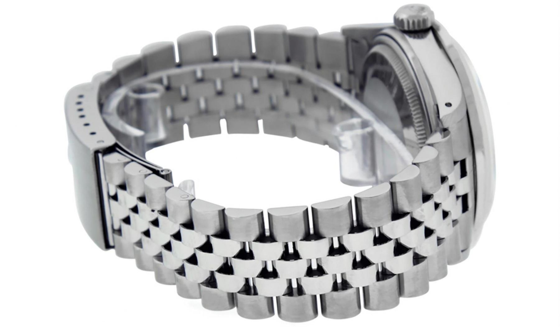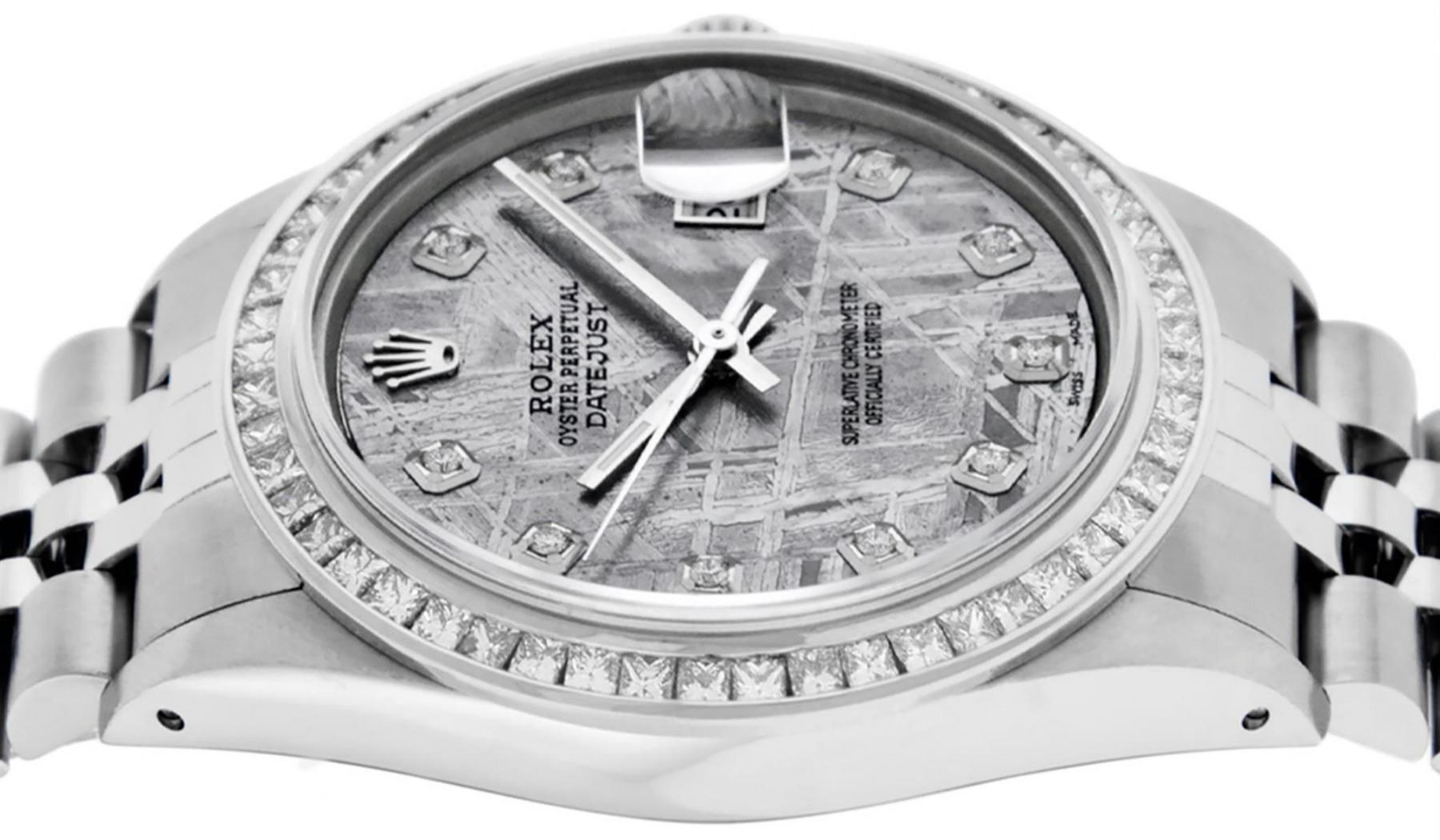 One Mens Stainless Steel Rolex Datejust Polished Bright with Satin Finish, Fully Serviced & Electronically Tested, Stainless Steel Case: 36mm, Stainless Steel Crown, Custom Bezel: New 14K White Gold 2.75 Carat Princess Cut Diamond Bezel, Diamond Count: 53 Diamonds, Total Weight 2.75 Carat, Clarity: SI-VS, Color: G to H. Custom Crystal: New Synthetic Sapphire Cyclops Lens. Custom Hands: New Luminecent Hands. Movement: Automatic Winding Movement. Custom Dial: Meteorite Diamond Dial, 10 Diamonds in Dial, G To H In Color, Clarity: SI-VS. Date Window: 3 O'Clock Position Date Display, Quickset, Model: Datejust 36mm, Condition: G-6 Extra Fine. Bracelet: Rolex Stainless Steel Jubilee Band. Bright Polish & Satin Finish. 7.0 Inch Length, Adjustable. Standard Clasp, With Rolex Logo. Watch Has Been Serviced And Polished It Is Free Of All Scratches And Dents.