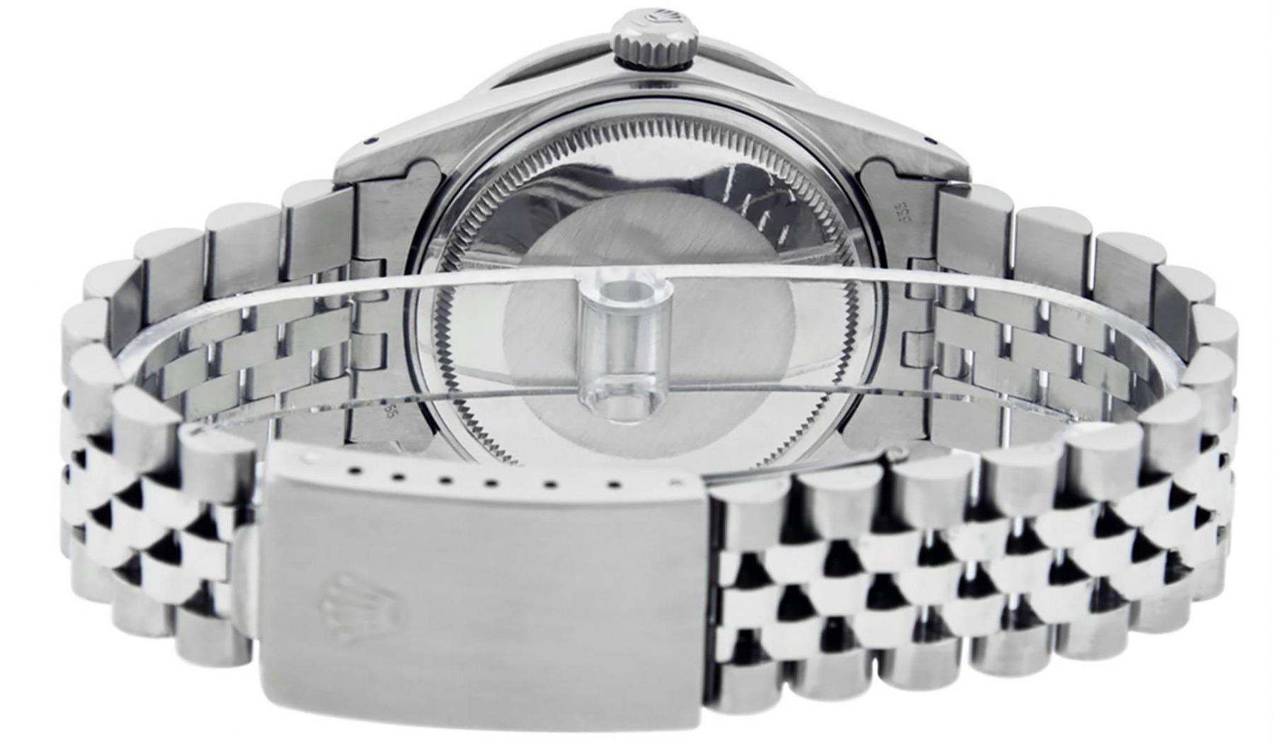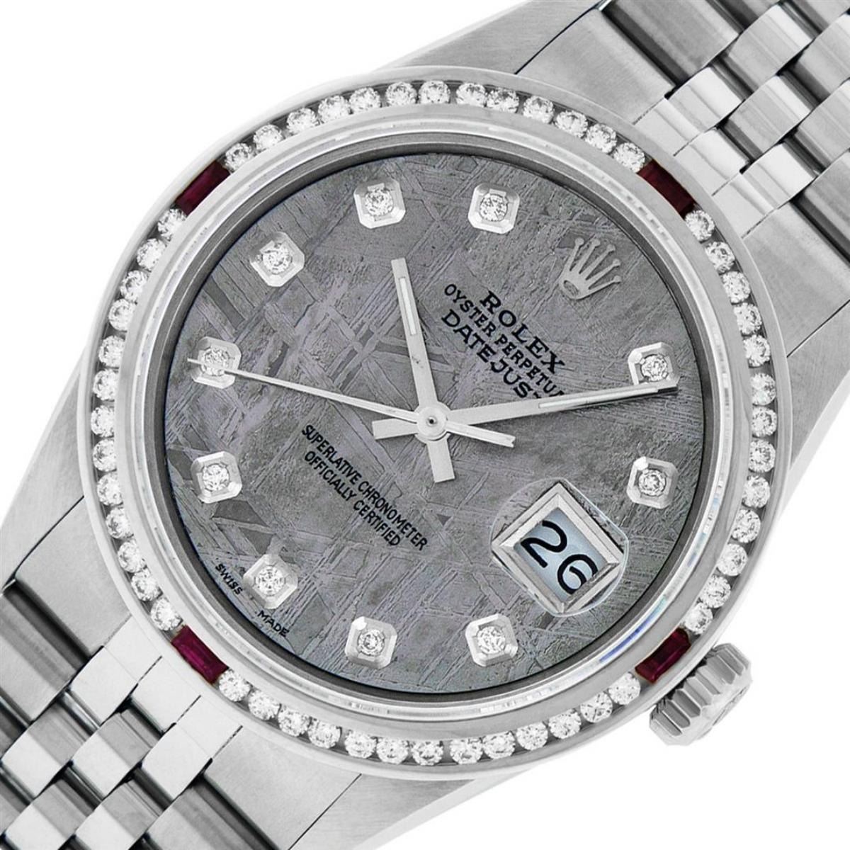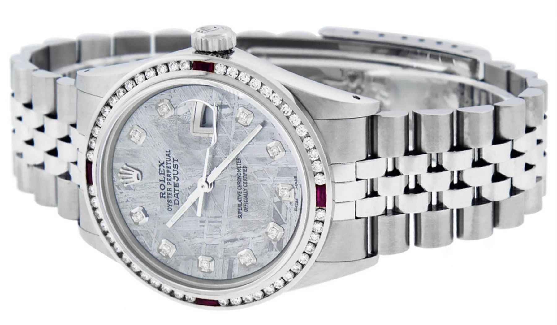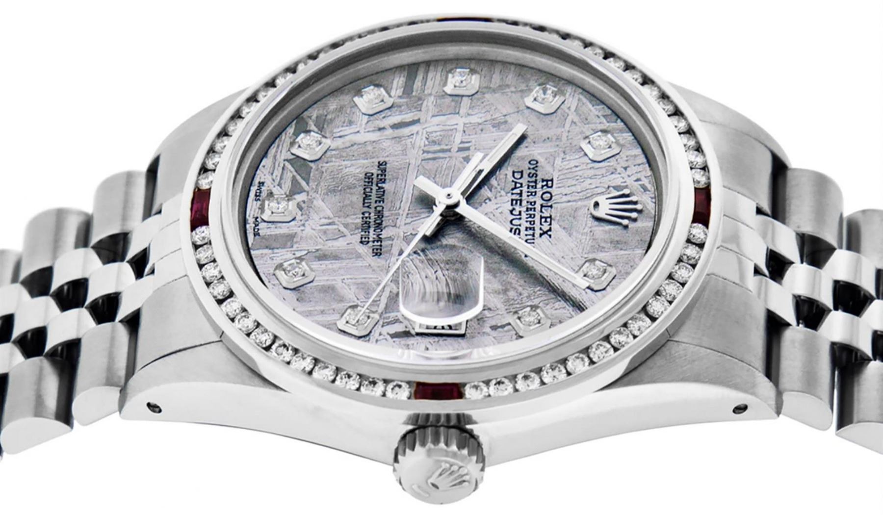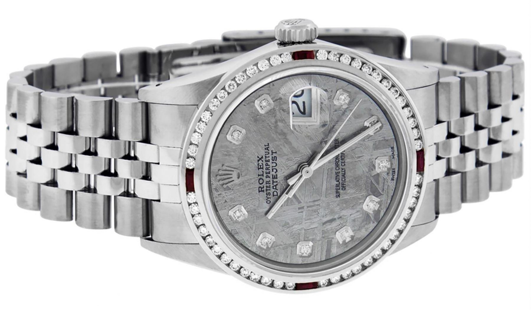 One Mens Stainless Steel Rolex Datejust Polished Bright with Satin Finish, This Watch Has Been Serviced & Electronically Tested, Stainless Steel Case: 36mm, Stainless Steel Crown, Custom Bezel: New 18K White Gold Ruby Channel Set Diamond Bezel, Diamond + Gem Count: 52 Diamonds + 4 Rubies, Total Weight 1.30 Carat, Clarity: SI-VS, Color: G to H. Custom Crystal: New Synthetic Sapphire Cyclops Lens. Custom Hands: New Luminescent Hands. Movement: Automatic Winding Movement. Custom Dial: Meteorite Diamond Dial, Diamond Count: 10 Diamonds in Dial, Diamond Color: G To H In Color, Clarity: SI-VS. Date Window: 3 O'Clock Position Date Display, Quickset, Model: Datejust, Condition: G-6 Extra Fine. Bracelet: Stainless Steel Jubilee. Bracelet: 7.0 Inch Length, Adjustable. Standard Clasp, With Rolex Logo. This Watch Has Been Serviced Time Tested And Is In Excellent Condition It Is Free Of All Scratches And Dents.