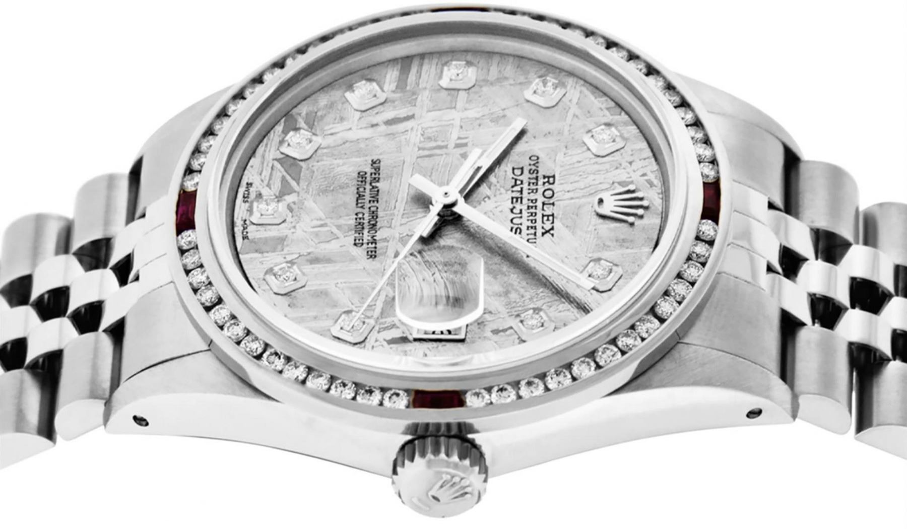 One Mens Stainless Steel Rolex Datejust Polished Bright with Satin Finish, This Watch Has Been Serviced & Electronically Time Tested, Stainless Steel Case: 36mm, Stainless Steel Crown, Custom Bezel: New 18K White Gold Ruby Channel Set Diamond Bezel, Diamond + Gem Count: 52 Diamonds + 4 Rubies, Total Weight 1.30 Carat, Clarity: SI-VS, Color: G to H. Custom Crystal: New Scratch Resistant Synthetic Sapphire Cyclops Lens. Custom Hands: New Luminescent Hands. Movement: Automatic Winding Movement Caliber 3035. Custom Dial: Meteorite Diamond Dial, Diamond Count: 10 Diamonds in Dial, Diamond Color: G To H In Color, Clarity: SI-VS. Date Window: 3 O'Clock Position Date Display, Quickset, Model: Datejust, Condition: G-6 Extra Fine. Bracelet: Stainless Steel Jubilee. Bracelet: 7.0 Inch Length, Adjustable. Standard Clasp, With Rolex Logo. This Watch Has Been Serviced Time Tested And Is In Excellent Condition It Is Free Of All Scratches And Dents.