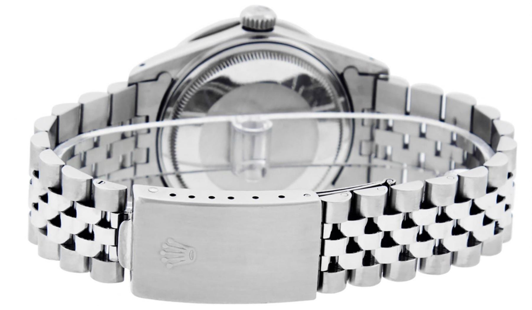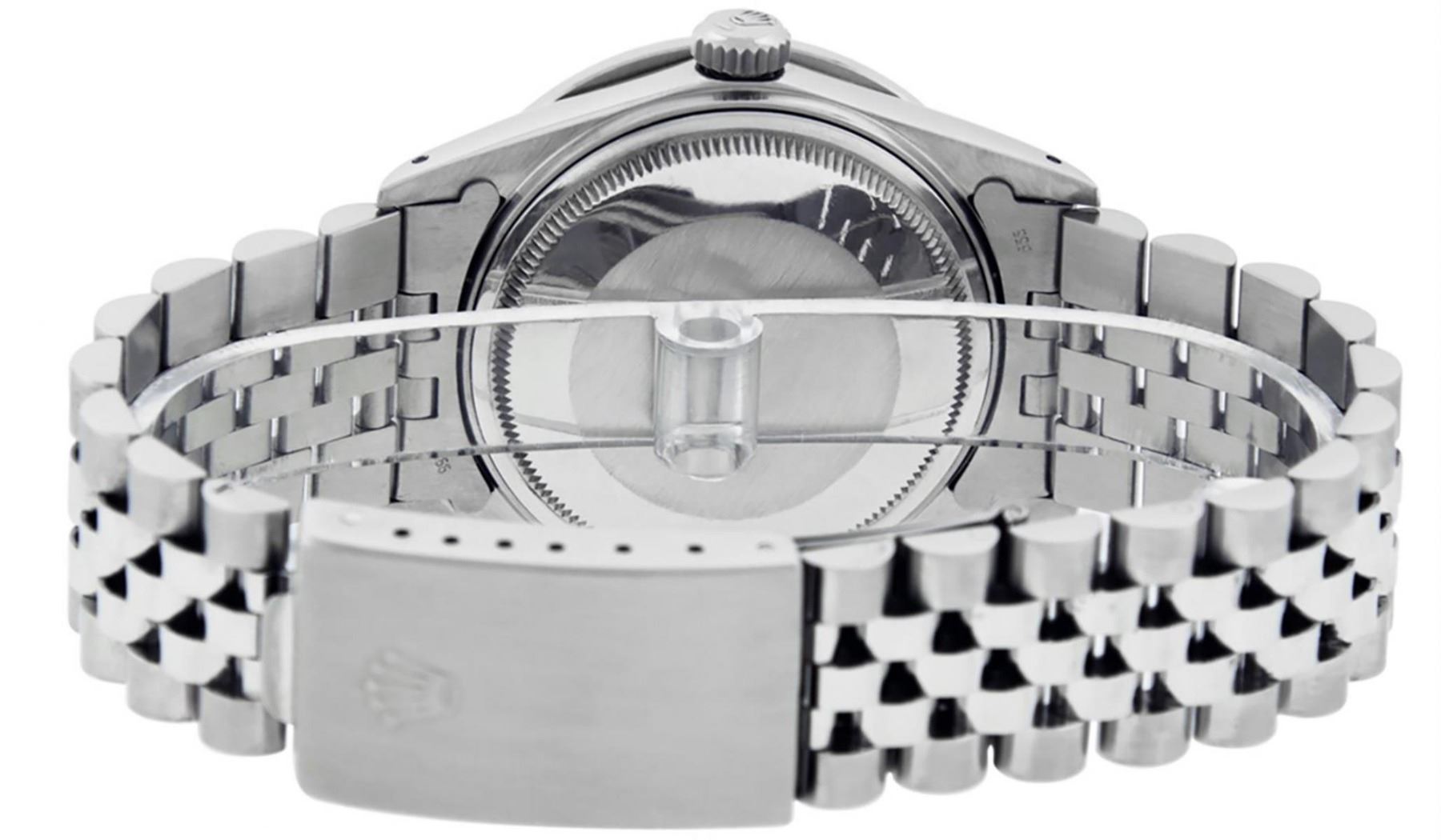 One Mens Stainless Steel Rolex Datejust Polished Bright with Satin Finish, This Watch Has Been Serviced & Electronically Tested, Stainless Steel Case: 36mm, Stainless Steel Crown, Custom Bezel: New 18K White Gold Ruby Channel Set Diamond Bezel, Diamond + Gem Count: 52 Diamonds + 4 Rubies, Total Weight 1.30 Carat, Clarity: SI-VS, Color: G to H. Custom Crystal: New Synthetic Sapphire Cyclops Lens. Custom Hands: New Luminescent Hands. Movement: Automatic Winding Movement Caliber 3035. Custom Dial: Meteorite Diamond Dial, Diamond Count: 10 Diamonds in Dial, Diamond Color: G To H In Color, Clarity: SI-VS. Date Window: 3 O'Clock Position Date Display, Quickset, Model: Datejust, Condition: G-6 Extra Fine. Bracelet: Stainless Steel Jubilee. Bracelet: 7.0 Inch Length, Adjustable. Standard Clasp, With Rolex Logo. This Watch Has Been Serviced Time Tested And Is In Excellent Condition It Is Free Of All Scratches And Dents.