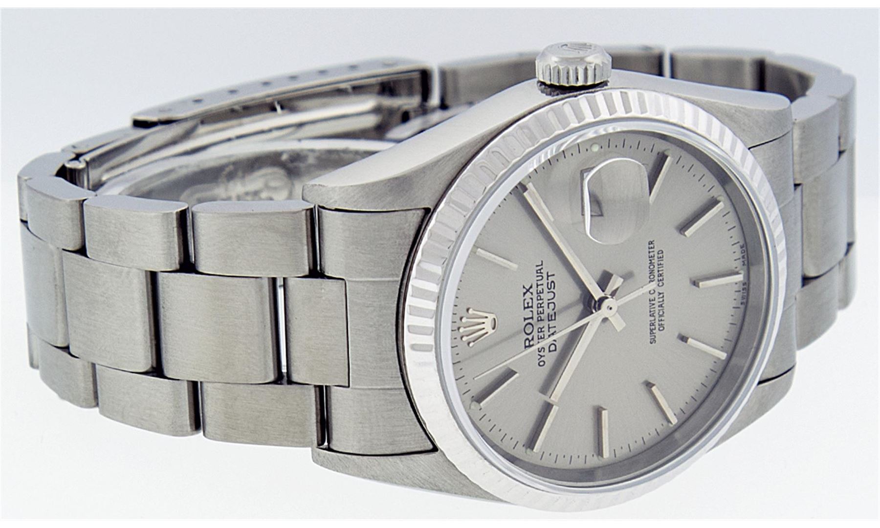 One Gents Rolex Stainless Steel Datejust Polished Bright with Satin Finish, Serviced & Electronically Tested, Stainless Steel Case: 36mm, Stainless Steel Crown, Bezel: 18K White Gold Fluted Bezel. Crystal: Synthetic Sapphire Cyclops Lens. Movement: Automatic Winding Movement Caliber 3135. Custom Dial: Slate Grey Index With Line Track And Lumi Dot. Date Window: 3 O'Clock Position Date Display, Quickset, Model: 16234 Quickset Datejust. Condition: G-6 Extra Fine. Bracelet:Stainless Steel Oyster Band. Bright Polish & Satin Finish. 7.0 Inch Length, Adjustable. Standard Clasp, With Rolex Logo.