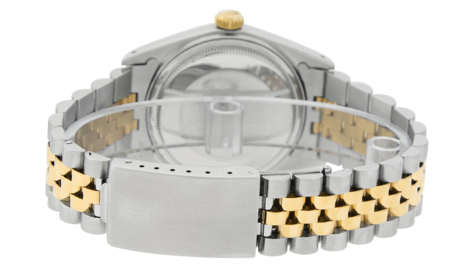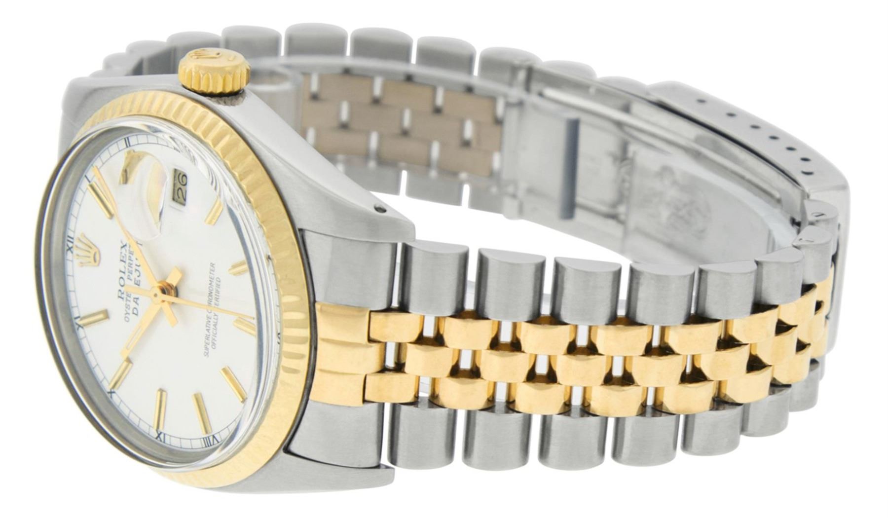 One Mens Rolex Two Tone Yellow Gold And Stainless Steel Datejust Polished, Serviced & Electronically Tested, 14K Yellow Gold & Stainless Steel Case: 36mm, 14K Yellow Gold Crown, Rolex Bezel: 14K Yellow Gold Fluted Bezel. Custom Crystal: New Acrylic With Magnified Date Window. Custom Hands: New Luminescent Hands. Rolex Movement: Automatic Winding Movement 3035. Custom Dial: Refinished To Silver With Index Hour Markers And Square Track. Date Window: 3 O'Clock Position Date Display, Quickset, Model: Datejust. Condition: G-6 Extra Fine. Rolex Bracelet: 14K Two Tone Yellow Gold & Stainless Steel Jubilee Band. Bright Polish. 7.0 Inch Length, Adjustable. Standard Clasp, With Rolex Logo. This Watch Has Been Serviced Time Tested And Is In Excellent Condition It Is Free Of All Scratches And Dents.