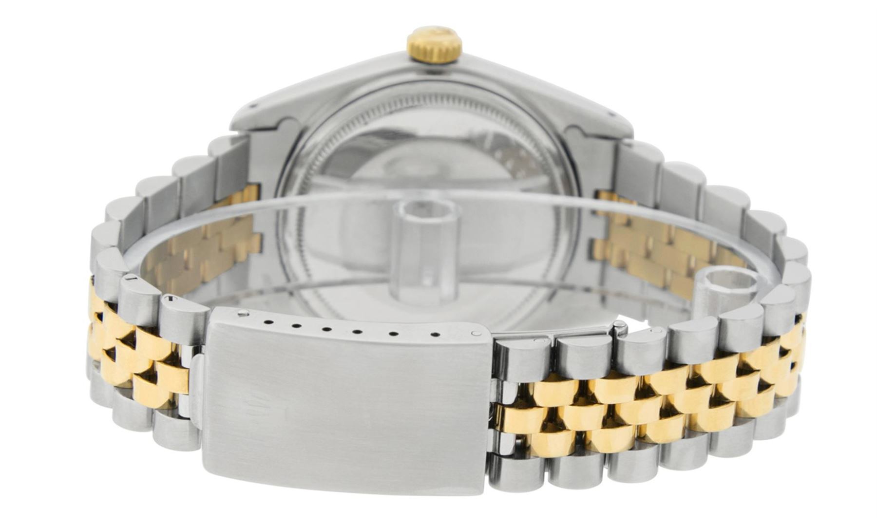 One Mens Rolex Two Tone Yellow Gold And Stainless Steel Datejust Polished, Serviced & Electronically Tested, 14K Yellow Gold & Stainless Steel Case: 36mm, 14K Yellow Gold Crown, Rolex Bezel: 14K Yellow Gold Fluted Bezel. Custom Crystal: New Acrylic With Magnified Date Window. Custom Hands: New Luminescent Hands. Rolex Movement: Automatic Winding Movement 3035. Custom Dial: Refinished To Silver With Index Hour Markers And Square Track. Date Window: 3 O'Clock Position Date Display, Quickset, Model: Datejust. Condition: G-6 Extra Fine. Rolex Bracelet: 14K Two Tone Yellow Gold & Stainless Steel Jubilee Band. Bright Polish. 7.0 Inch Length, Adjustable. Standard Clasp, With Rolex Logo. This Watch Has Been Serviced Time Tested And Is In Excellent Condition It Is Free Of All Scratches And Dents.